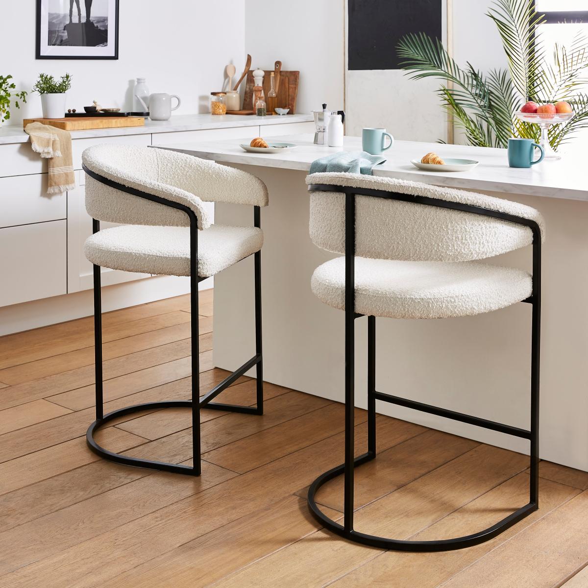 I love this barstool for its understated elegance and versatility. The ivory boucle gives it a luxurious yet relaxed feel, making it perfect for both contemporary and classic interiors. It works particularly well in kitchens with neutral or soft colour palettes, or in an adjacent breakfast bar where comfort is key. Practical styling tips include pairing it with black or brass accents for a modern touch, or adding a cosy throw or textured cushions to enhance its inviting vibe. Its sleek metal frame keeps the look light and airy, so it’s a great choice for spaces where you want to combine style with functionality.