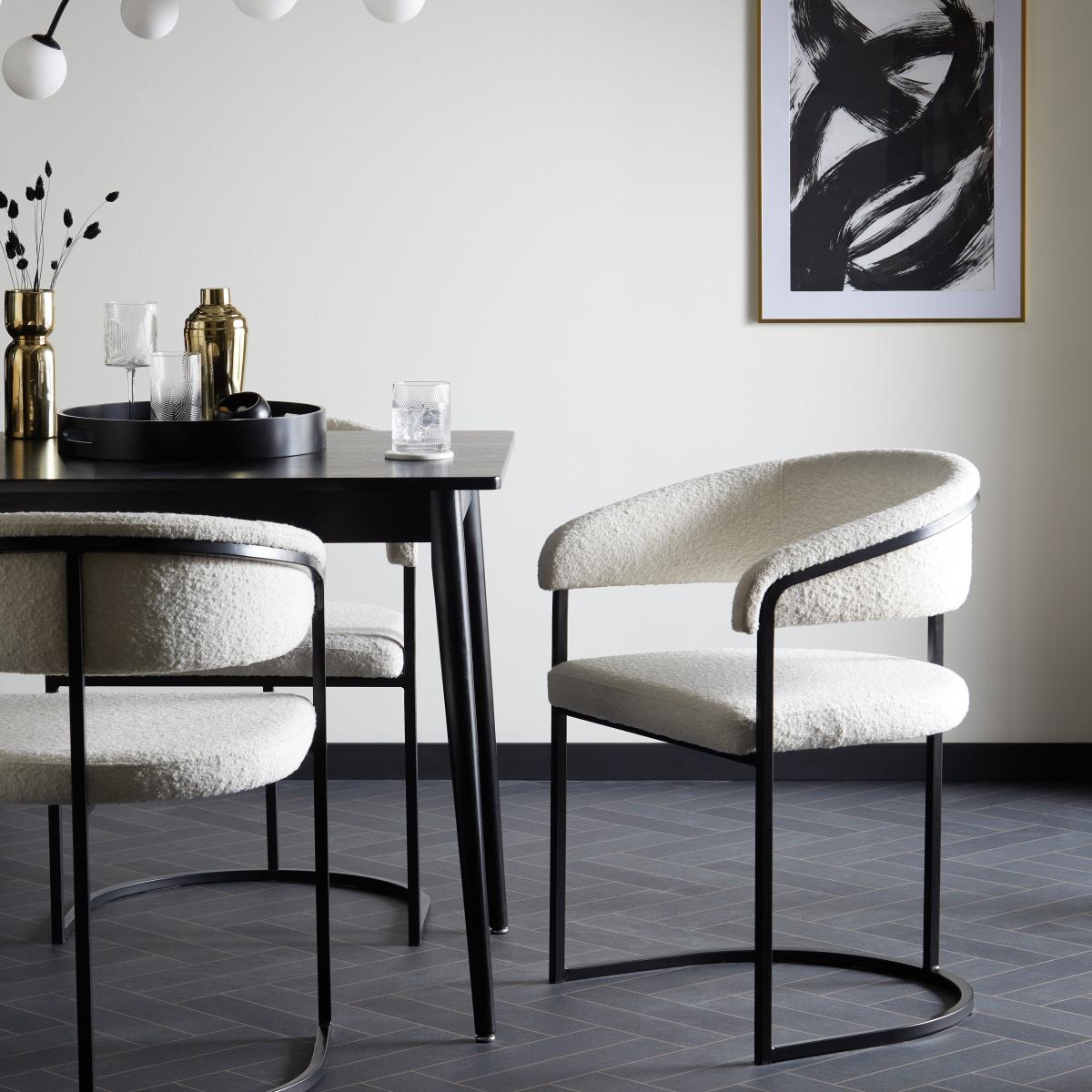 I’m a fan of this ivory boucle chair for its simple curved form and tactile boucle upholstery, which adds warmth without bulk. The slim black metal frame keeps it looking light, so it works perfectly in modern Scandi schemes, monochrome dining rooms or even a pared-back industrial loft. Styling tip: pair it with a rectangular black or natural timber table to emphasise its lines, then introduce a single low-profile cushion in muted green or slate for contrast. A faux-sheepskin throw casually draped over the back softens the look further, while matte black or brass tableware will tie your scheme together.