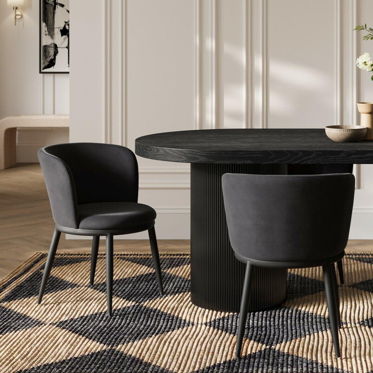 The Zenith Dining Chair featuresa subtle curving of the backrest adding a touch of fluidity to the dining room, which contrasts with strong angular black metal legs. Velvet upholstery adds a touch of luxe. Style meets comfort in perfect harmony. Product Details • Set of 2 • Velvet upholstered • Foam fillings • Partial assembly required (legs/feet only) • Care advice - Clean damp cloth or soft brush. Product Composition - Velvet, Metal, Foam. Product Dimensions • Overall product- 58 cm x 56 cm x 74 cm , Weight - 5.7 KG • Floor to seat height 47cm • Seat width 48cm • Seat depth 50cm. Package Dimensions - 78 cm x 58 cm x 58 cm, Weight 7.53 KGPlease note: this product cannot be be delivered to all Offshore Islands, Scottish Highlands, Northern Ireland or Republic of Ireland. This product will be dispatched by one of our trusted suppliers. You’ll be contacted by their selected courier about your delivery.