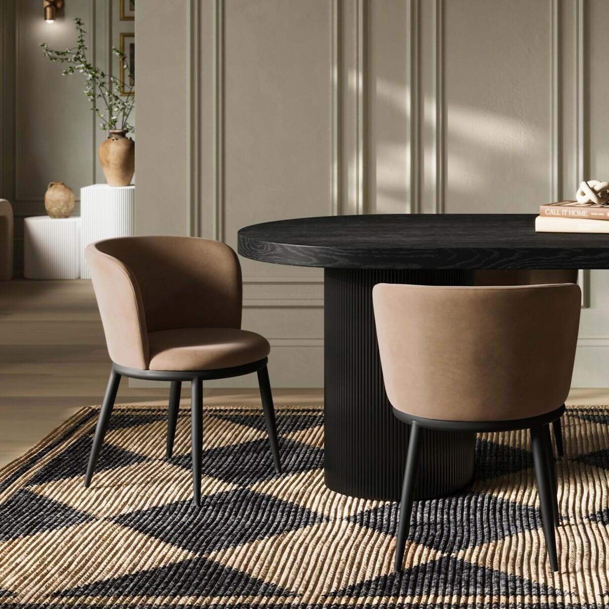 The Zenith Dining Chair featuresa subtle curving of the backrest adding a touch of fluidity to the dining room, which contrasts with strong angular black metal legs. Velvet upholstery adds a touch of luxe. Style meets comfort in perfect harmony. Product Details • Set of 2 • Velvet upholstered • Foam fillings • Partial assembly required (legs/feet only) • Care advice - Clean damp cloth or soft brush. Product Composition - Velvet, Metal, Foam. Product Dimensions • Overall product- 58 cm x 56 cm x 74 cm , Weight - 5.7 KG • Floor to seat height 47cm • Seat width 48cm • Seat depth 50cm. Package Dimensions - 78 cm x 58 cm x 58 cm, Weight 7.53 KGPlease note: this product cannot be be delivered to all Offshore Islands, Scottish Highlands, Northern Ireland or Republic of Ireland. This product will be dispatched by one of our trusted suppliers. You’ll be contacted by their selected courier about your delivery.