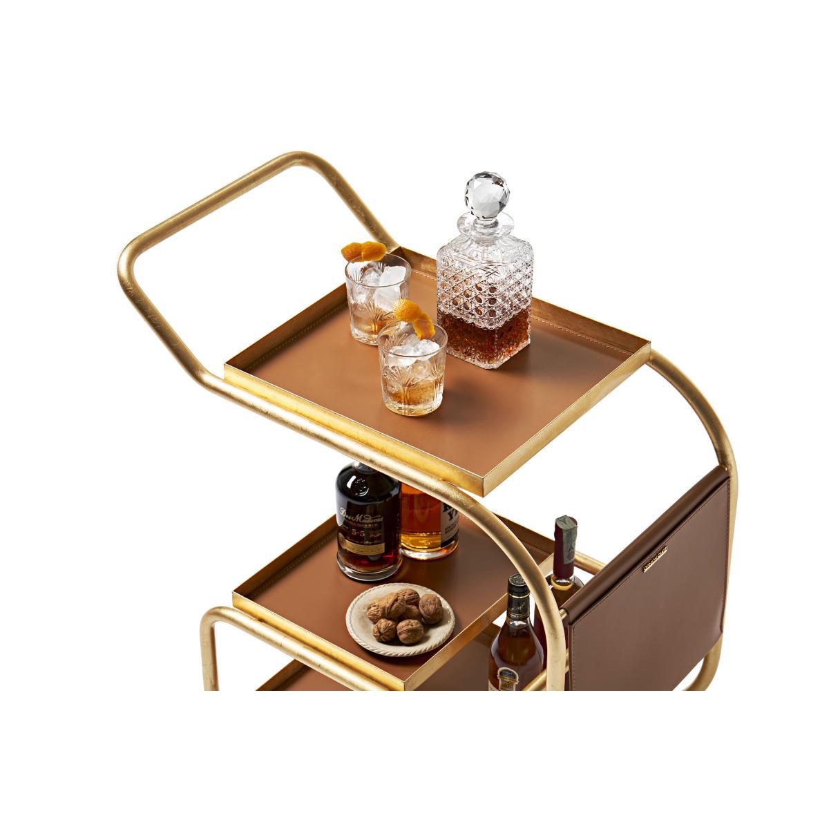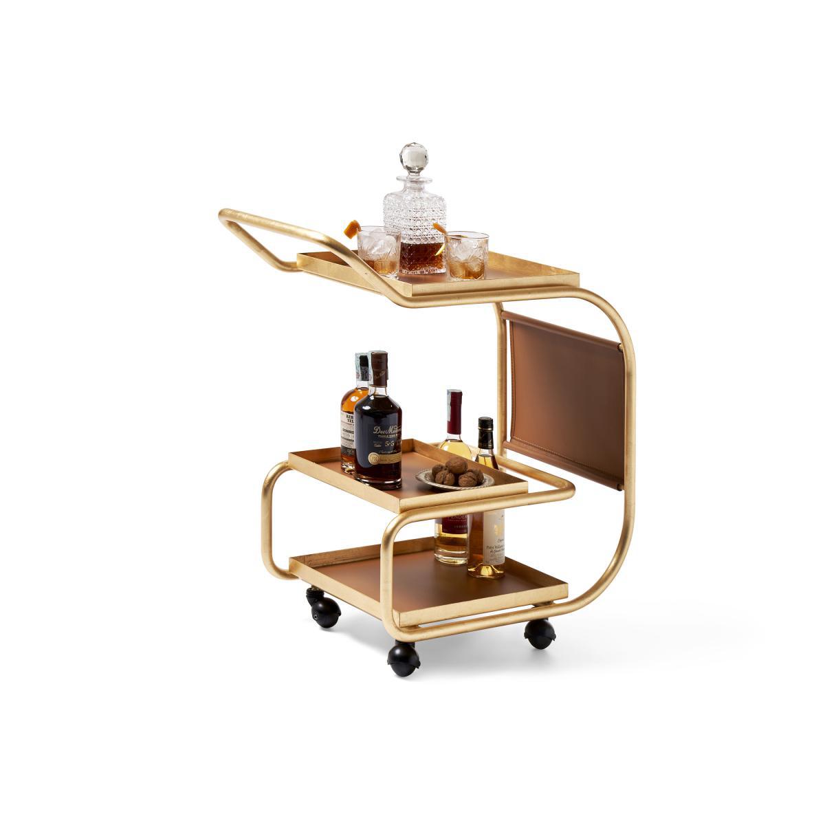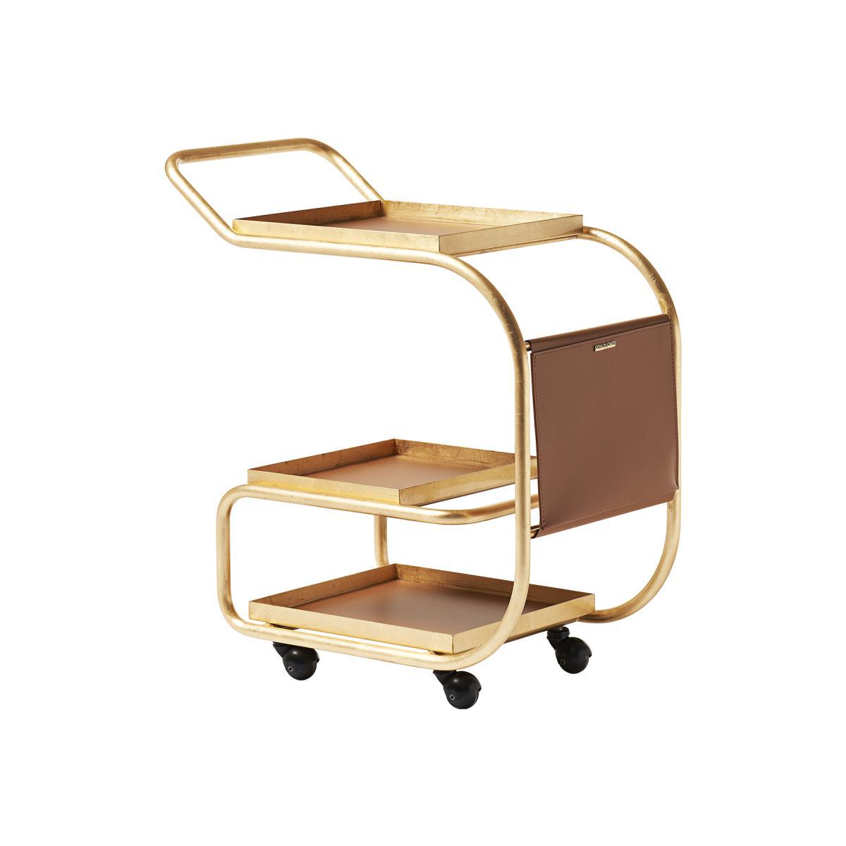 An ultra-refined style for this multifunction steel cart with a storage pocket and trays covered with regenerated leather. Ecological, this recycled leather is made from scraps of leather and hides sourced directly from shoe and leather goods factories. Trolley, bar, console in an entrance, storage for the office. Zenzero is versatile, surprising, endearing: it’s hospitality on wheels. The three trays are supported by a fine sinuous structure made of steel tubes. The front storage pocket holds newspapers, books, files or letters. The wide handle and swivel wheels make this go-anywhere trolley extremely easy to move. Thanks to its high edges, Zenzero can safely hold and transport bottles and glasses, cups and pitchers. Two of its trays are removable. Functional for breakfast, fun for drinks, elegant for a liqueur, Zenzero, designed by Samer Alameen, adapts perfectly to all contexts where good living is considered a value, as well as a pleasure. Perfect in private homes, it also finds its place in the most exclusive lounges and refined restaurants.