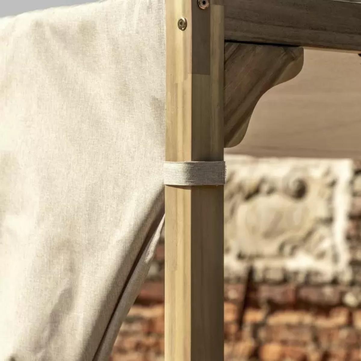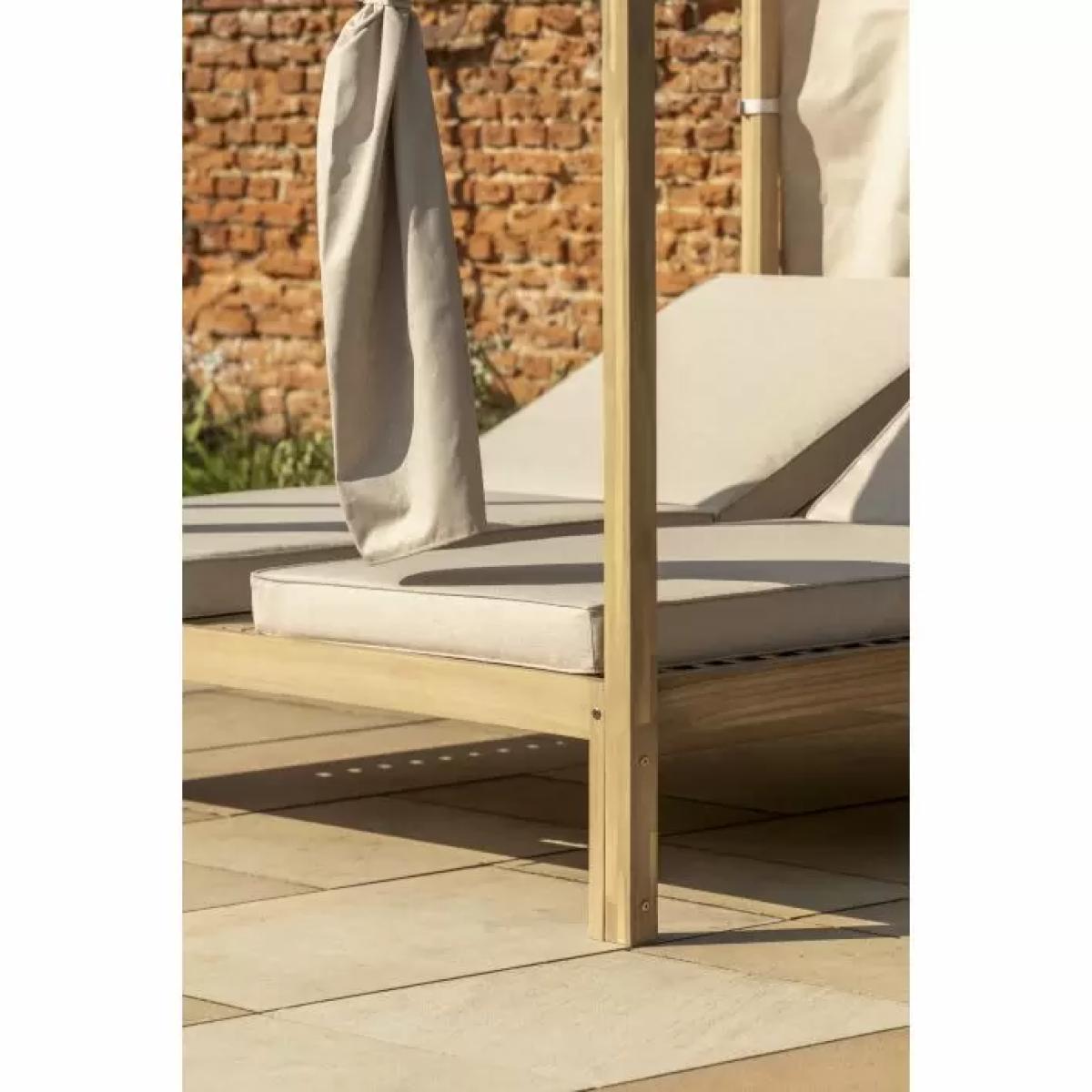 The ultimate in relaxation, this double daybed brings a holiday cabana feel to your own garden. Relax on the 2 raising beds and rest your drinks down in the centre perfectly placed parting space. The up and over cover, made in polyester comes complete with ties, allowing you to adjust as you desire, either admire the view or opt to have a little more privacy. Supplied with foam cushions for comfort. Material: Acacia 70% / Foam 25% / Polyester 3% / Fibre 2%. Colour/Finish: Natural.