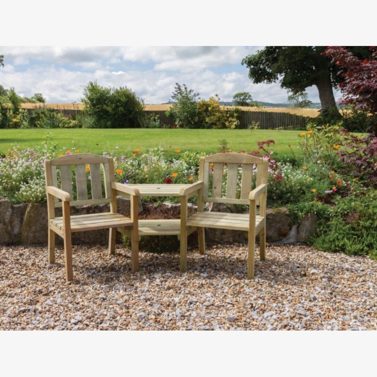 A charming double seat joined together with a tiered table for your drinks, a light bite to eat or a place for your latest read. The Zest Garden Caroline Wooden Companion Seat is comfortable for two people, with room for a parasol in those hotter days. KEY FEATURES: Chairs are joined by a table and shelf 10 year guarantee against rot High quality, pressure treated wood This product is made of material from well-managed, FSC-certified forests and controlled sources DIMENSIONS & WEIGHT: Sizes:W 1.94m x D 0.79m x H 0.94m Materials: Softwood Weight: 36 kg CARE & MAINTENANCE: As an easy care product made from pressure treated wood that protects against rot there is no need to apply any treatment within the first 6 months of receipt. Doing so will invalidate the warranty, as this will not allow enough time for excess moisture from the pressure treatment to dry out. However, after this period you may apply annual treatment to prolong the life and look of the product.