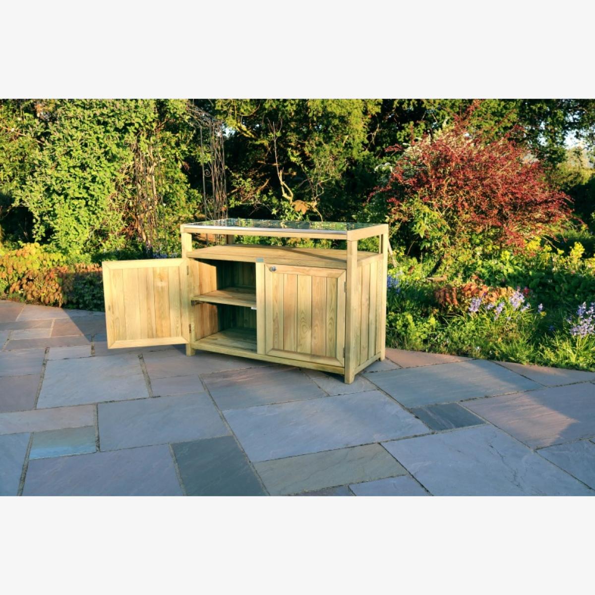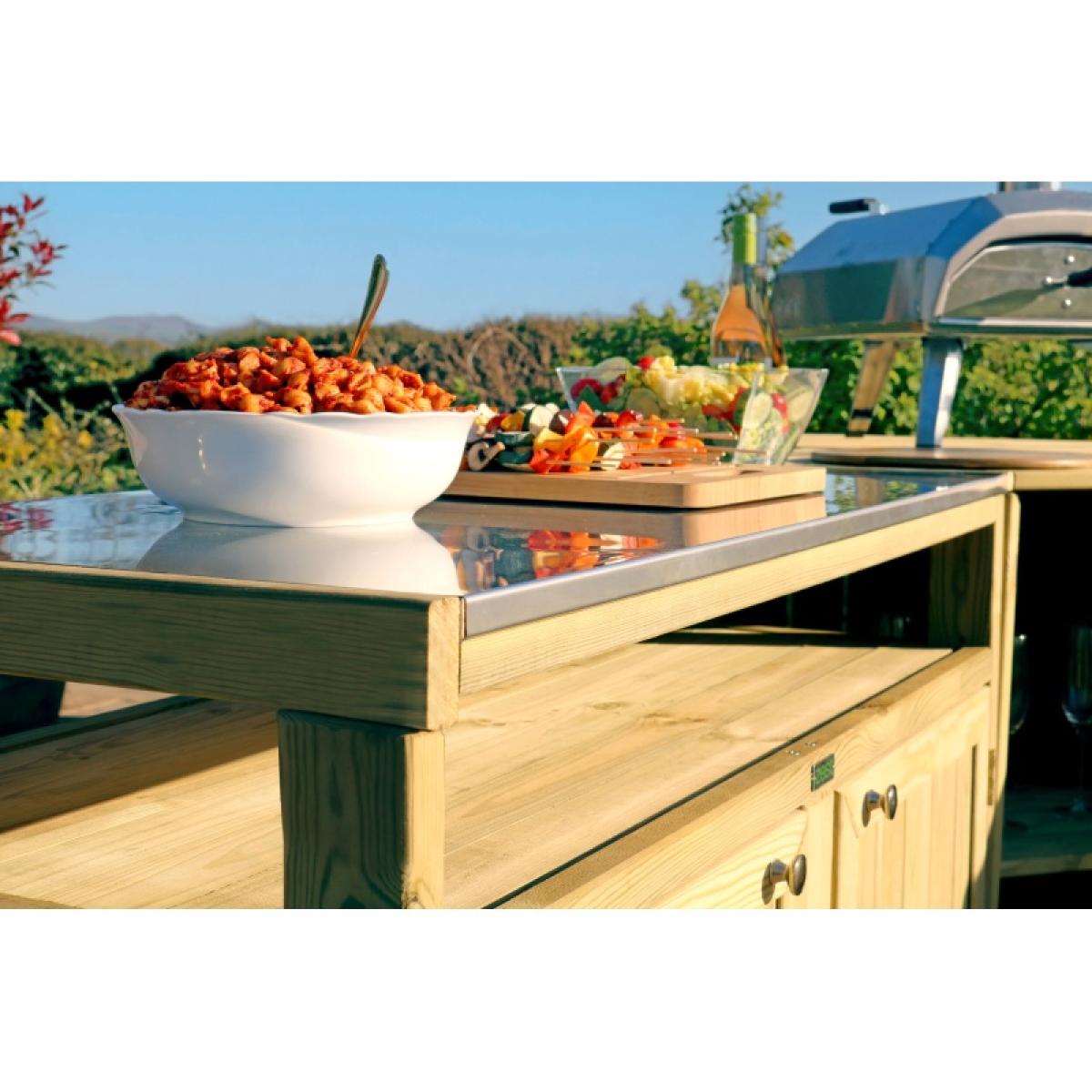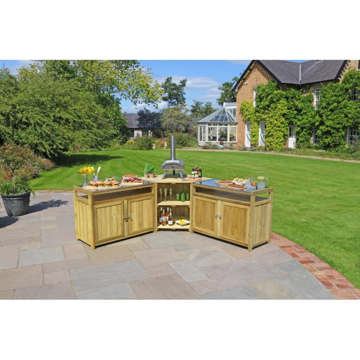 The Zest Garden Terazza Wooden Outdoor Kitchen - Double Unit has two large doors that open wide to access the internal shelf which offer storage for tools and cooking equipment. The open-sided shelf is ideal for plates, cutlery and serving utensils. It comes with a stainless steel top which is perfect for food preparation at a standard working height 0.89m high that you would find in an indoor kitchen. The double kitchen unit is made from sustainable slow grown soft wood from responsibly managed forests and has a 10 year guarantee against rot. KEY FEATURES:. *A sustainable route to alfresco cooking *Offers plenty of storage for tools and cooking equipment *Stainless steel counter tops are perfect for food preparation, setting up a pizza oven and at a standard working height *Made from sustainable slow grown soft wood from responsibly managed forests *10 year guarantee against rot *Please note this item is for outdoor use only. DIMENSIONS WEIGHT:. *Sizes: W 1.21m x D 0.58m x H 0.89m *Materials: Softwood and stainless steel *Weight: 36.39 kg CARE MAINTENANCE:As an easy care product made from pressure treated wood that protects against rot there is no need to apply any treatment within the first 6 months of receipt. Doing so will invalidate the warranty, as this will not allow enough time for excess moisture from the pressure treatment to dry out. However, after this period you may apply annual treatment to prolong the life and look of the product..