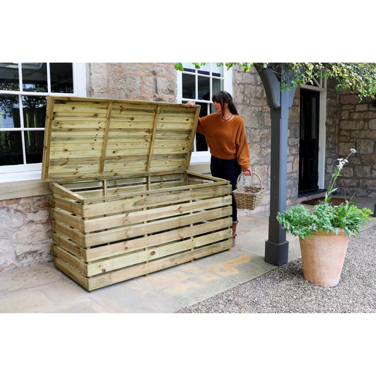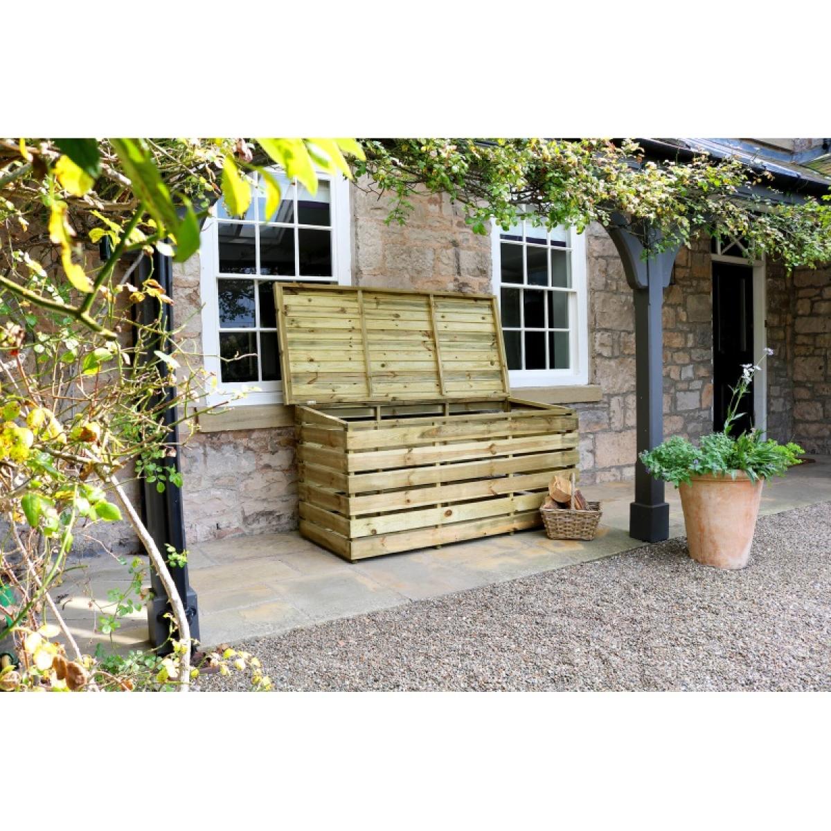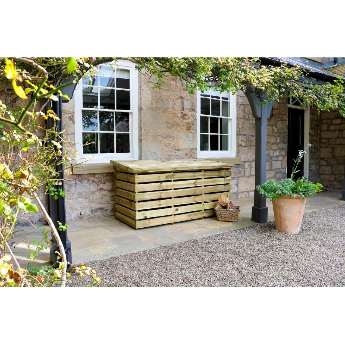 Store up to half a ton of logs with the pressure treated log chest, ready for your log fires or burners. The elevated base and slatted wood help with the airflow which supports the drying of your logs. Also suitable for storing smaller garden equipment and accessories. Please note, the slatted wood may allow some rainwater to fall into the chest. Logs are for illustrative purposes only. KEY FEATURES: Stores up to half a ton of logs Storage is kept dry with open slats to allow for air flow High quality, pressure treated wood This product is made of material from well-managed, PEFC certified forests and controlled sources DIMENSIONS & WEIGHT: Sizes: 1.8m (W) x 0.72m (D) x 0.84/0.76m (H) Materials: Softwood Weight: 53 kg CARE & MAINTENANCE: As an easy care product made from pressure treated wood that protects against rot there is no need to apply any treatment within the first 6 months of receipt. Doing so will invalidate the warranty, as this will not allow enough time for excess moisture from the pressure treatment to dry out. However, after this period you may apply annual treatment to prolong the life and look of the product.