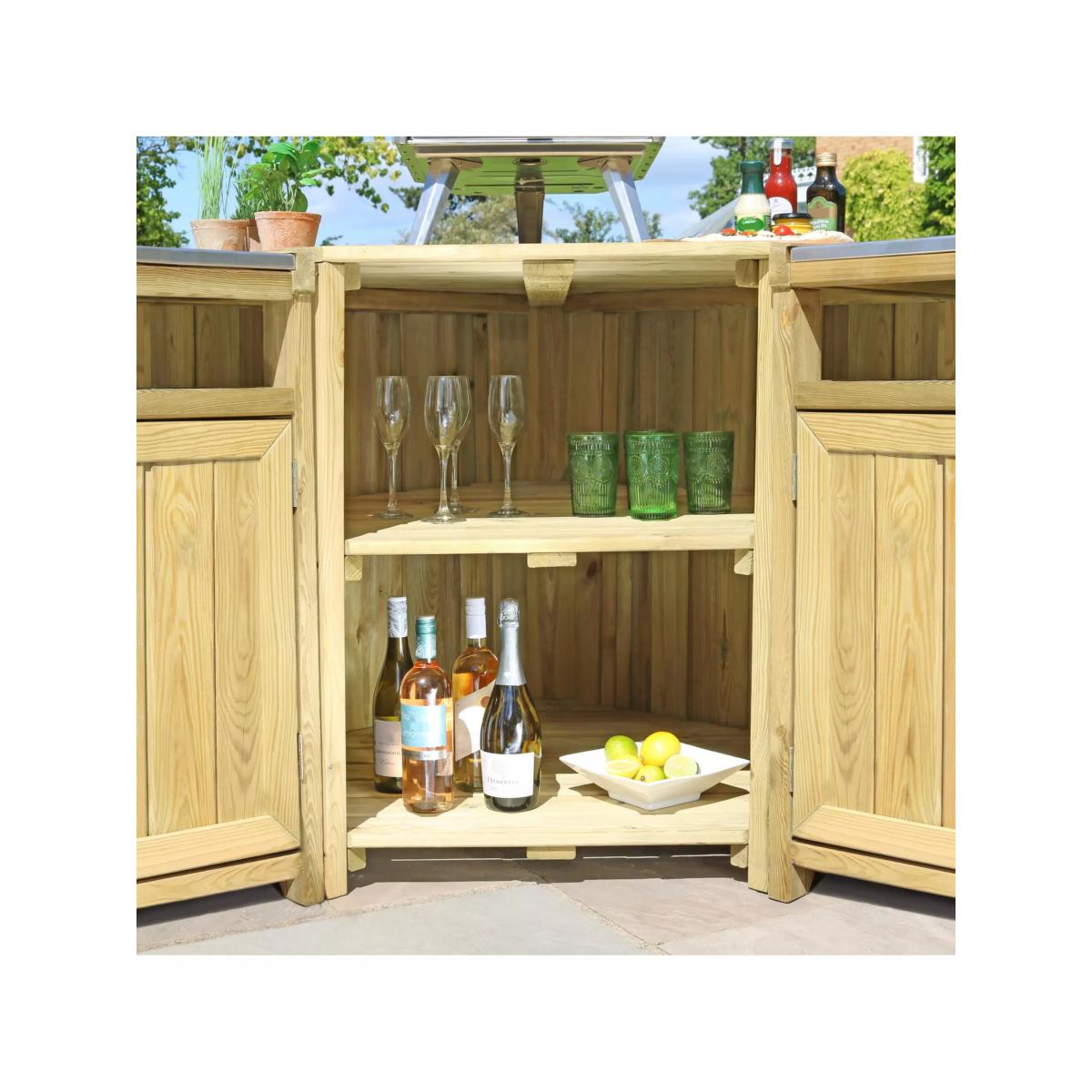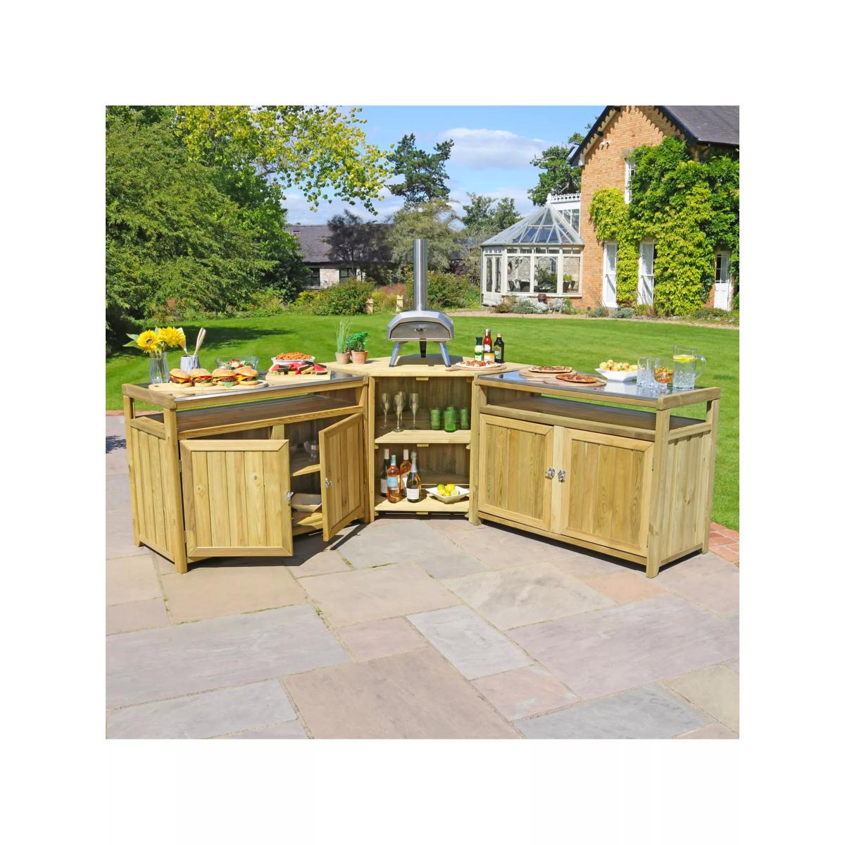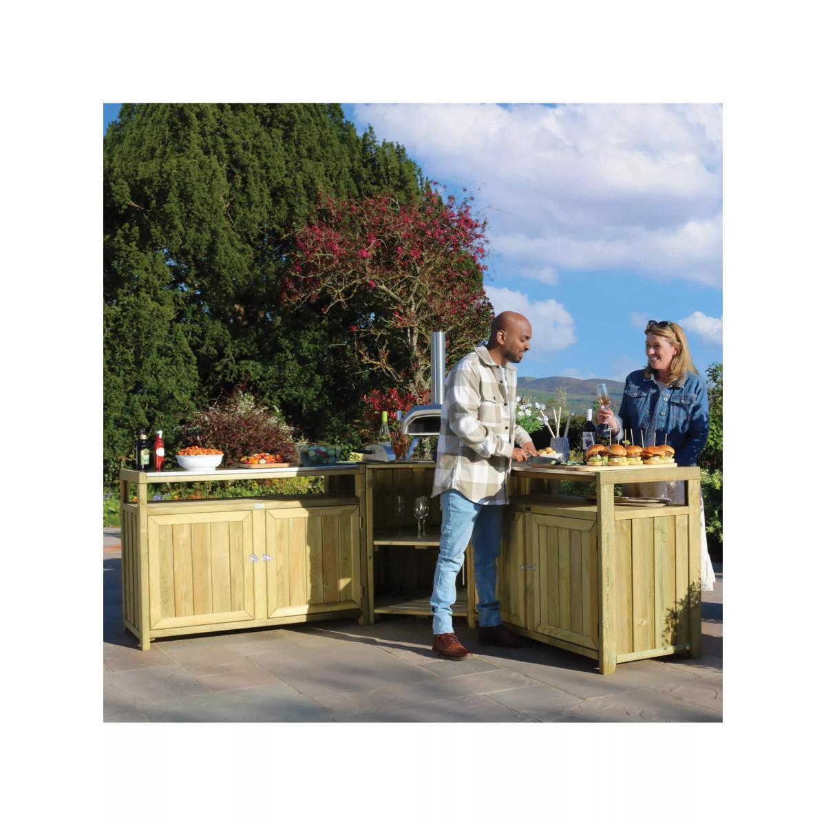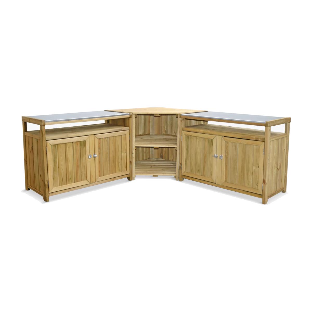 Stunning and sturdy outdoor kitchen comprising two double units and a display corner unit. The corner unit has two open shelves and a wooden top. The double units have stainless steel worktops, full-width easy-access open shelves at the top and two shelves on either side enclosed by cupboard doors. Plenty of space for alfresco food prep and cooking for large groups and parties. Made of pressure-treated wood for maximum protection. The wood is a mix of slow-grown European pine and spruce from sustainably managed forests and PEFC-certified (Programme for the Endorsement of Forest Certification). Care information Allow your product time to adjust to its new location. Timber is a natural material which means that each item is unique, therefore changes in temperature and humidity will cause expansion and contraction. Any natural movement will not affect the strength of this product or its beauty but it can be useful to check the tightness of the screws and fixings around a month after assembly to accommodate any such movement, and from time to time after that. There's no need to treat your new Zest timber product with preservatives as it has been pressure-treated against rot for ten years. If you prefer to enhance its colour, then the best time to do so is six months after taking delivery using a well-known reputable timber preservative. If you notice any build-up of green mildew due to weather conditions, all you need to do is wash your Zest product with a solution of soft soap and warm water, rinse thoroughly with fresh water and leave to dry completely.