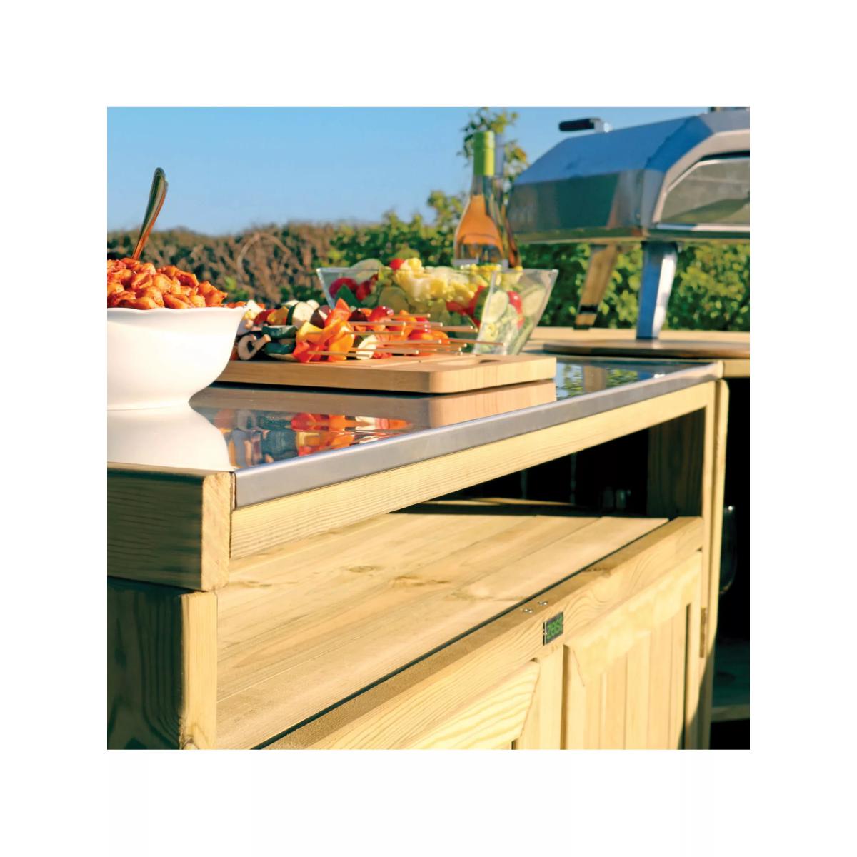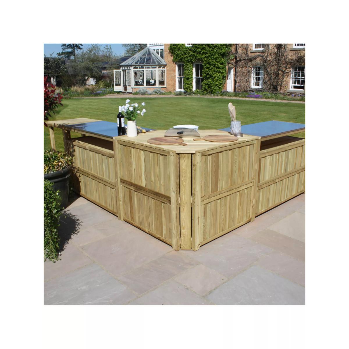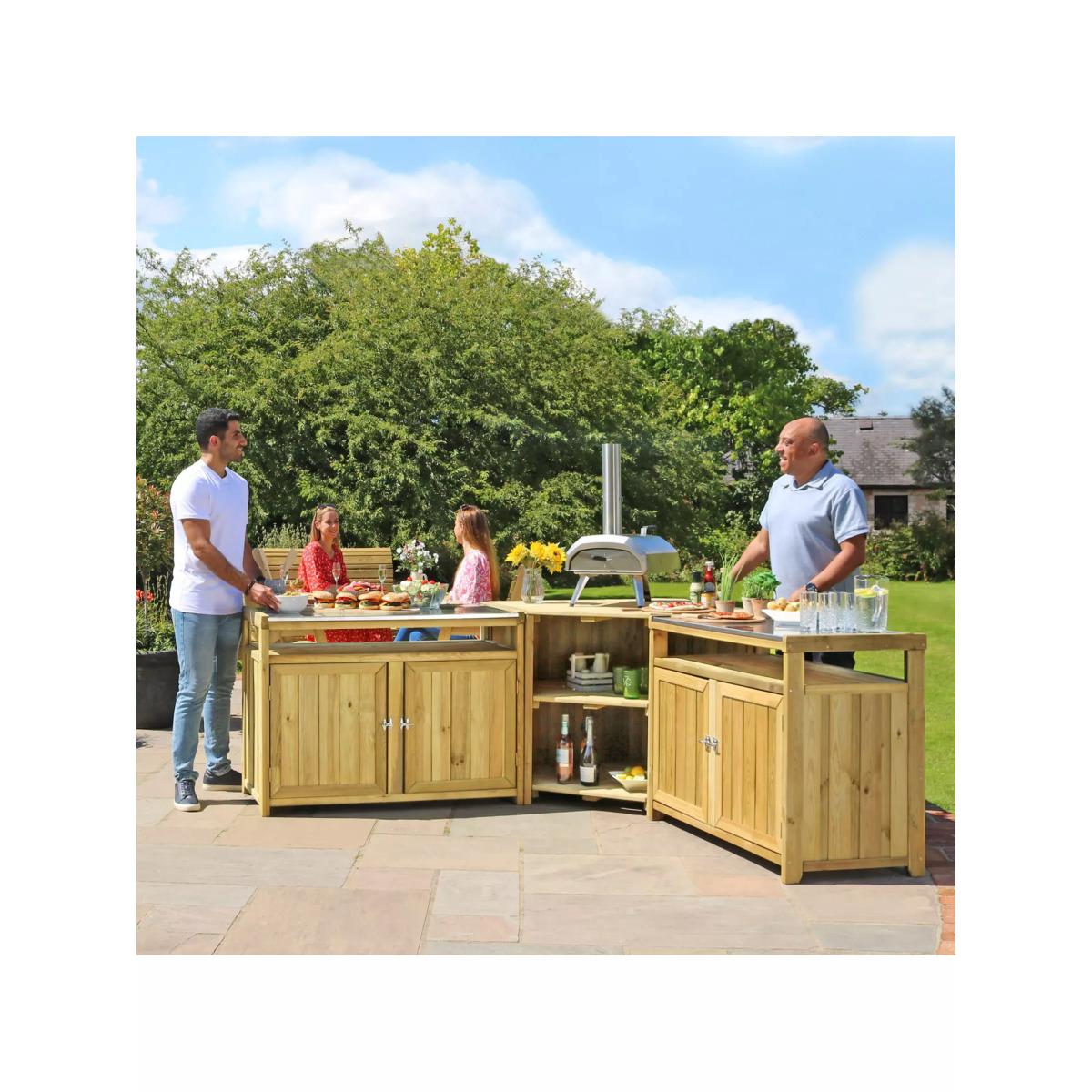 Stunning and sturdy outdoor kitchen comprising two double units and a display corner unit. The corner unit has two open shelves and a wooden top. The double units have stainless steel worktops, full-width easy-access open shelves at the top and two shelves on either side enclosed by cupboard doors. Plenty of space for alfresco food prep and cooking for large groups and parties. Made of pressure-treated wood for maximum protection. The wood is a mix of slow-grown European pine and spruce from sustainably managed forests and PEFC-certified (Programme for the Endorsement of Forest Certification). Care information Allow your product time to adjust to its new location. Timber is a natural material which means that each item is unique, therefore changes in temperature and humidity will cause expansion and contraction. Any natural movement will not affect the strength of this product or its beauty but it can be useful to check the tightness of the screws and fixings around a month after assembly to accommodate any such movement, and from time to time after that. There's no need to treat your new Zest timber product with preservatives as it has been pressure-treated against rot for ten years. If you prefer to enhance its colour, then the best time to do so is six months after taking delivery using a well-known reputable timber preservative. If you notice any build-up of green mildew due to weather conditions, all you need to do is wash your Zest product with a solution of soft soap and warm water, rinse thoroughly with fresh water and leave to dry completely.