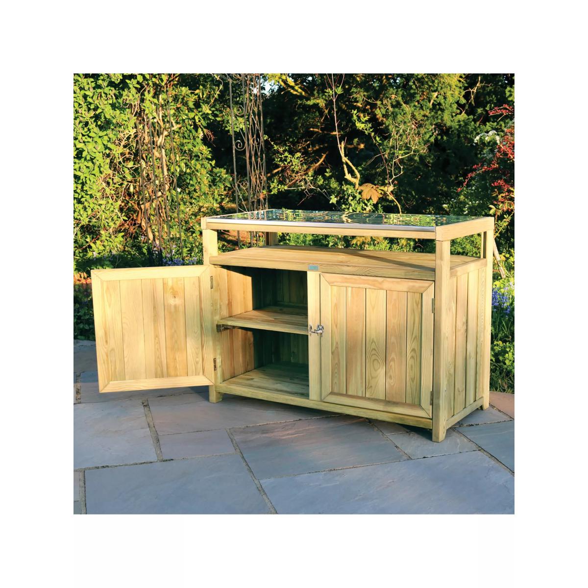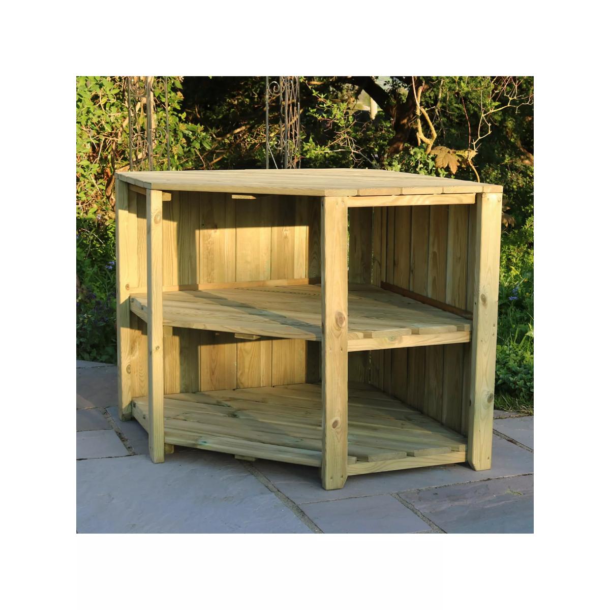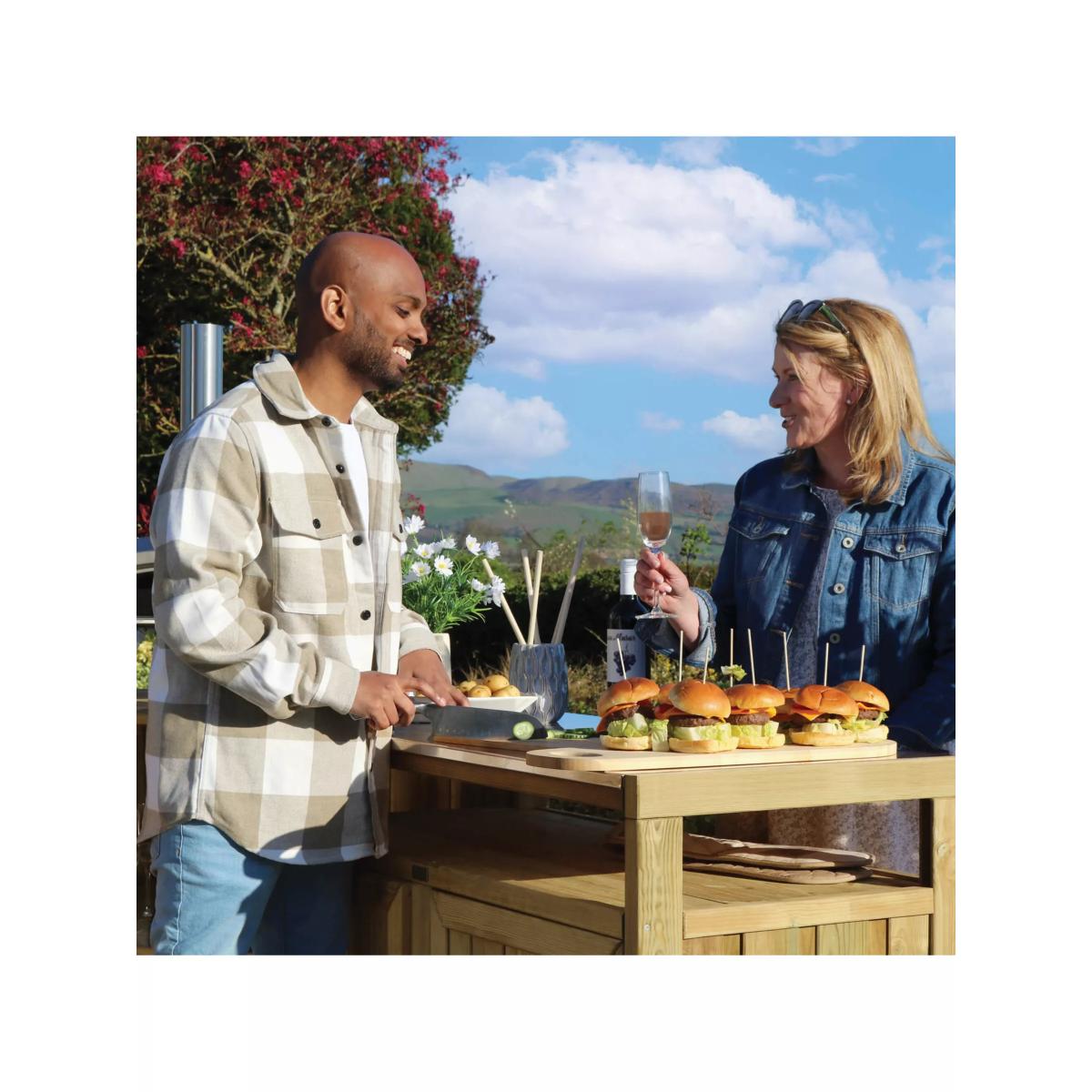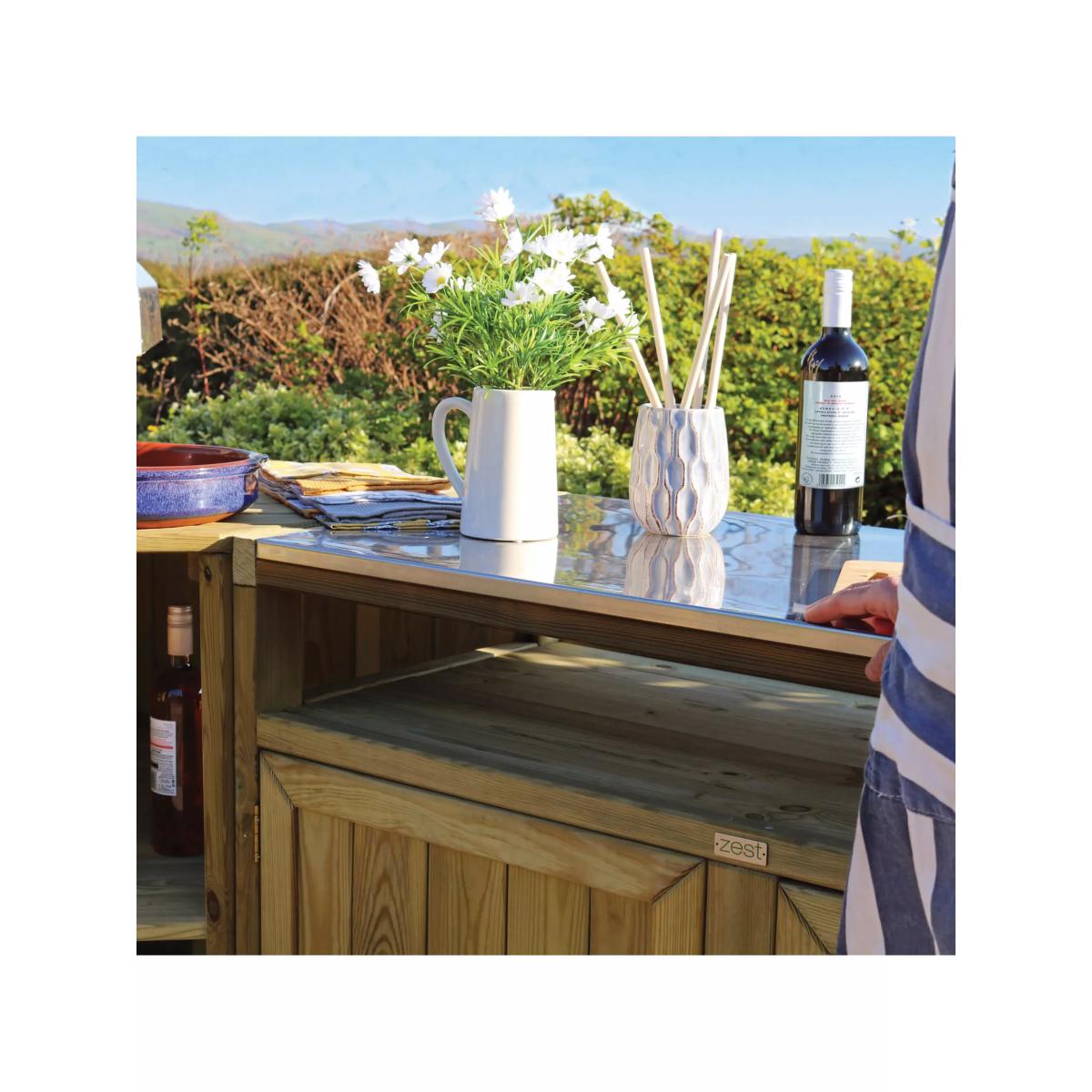 Stunning and sturdy outdoor kitchen comprising two double units and a display corner unit. The corner unit has two open shelves and a wooden top. The double units have stainless steel worktops, full-width easy-access open shelves at the top and two shelves on either side enclosed by cupboard doors. Plenty of space for alfresco food prep and cooking for large groups and parties. Made of pressure-treated wood for maximum protection. The wood is a mix of slow-grown European pine and spruce from sustainably managed forests and PEFC-certified (Programme for the Endorsement of Forest Certification). Care information Allow your product time to adjust to its new location. Timber is a natural material which means that each item is unique, therefore changes in temperature and humidity will cause expansion and contraction. Any natural movement will not affect the strength of this product or its beauty but it can be useful to check the tightness of the screws and fixings around a month after assembly to accommodate any such movement, and from time to time after that. There's no need to treat your new Zest timber product with preservatives as it has been pressure-treated against rot for ten years. If you prefer to enhance its colour, then the best time to do so is six months after taking delivery using a well-known reputable timber preservative. If you notice any build-up of green mildew due to weather conditions, all you need to do is wash your Zest product with a solution of soft soap and warm water, rinse thoroughly with fresh water and leave to dry completely.
