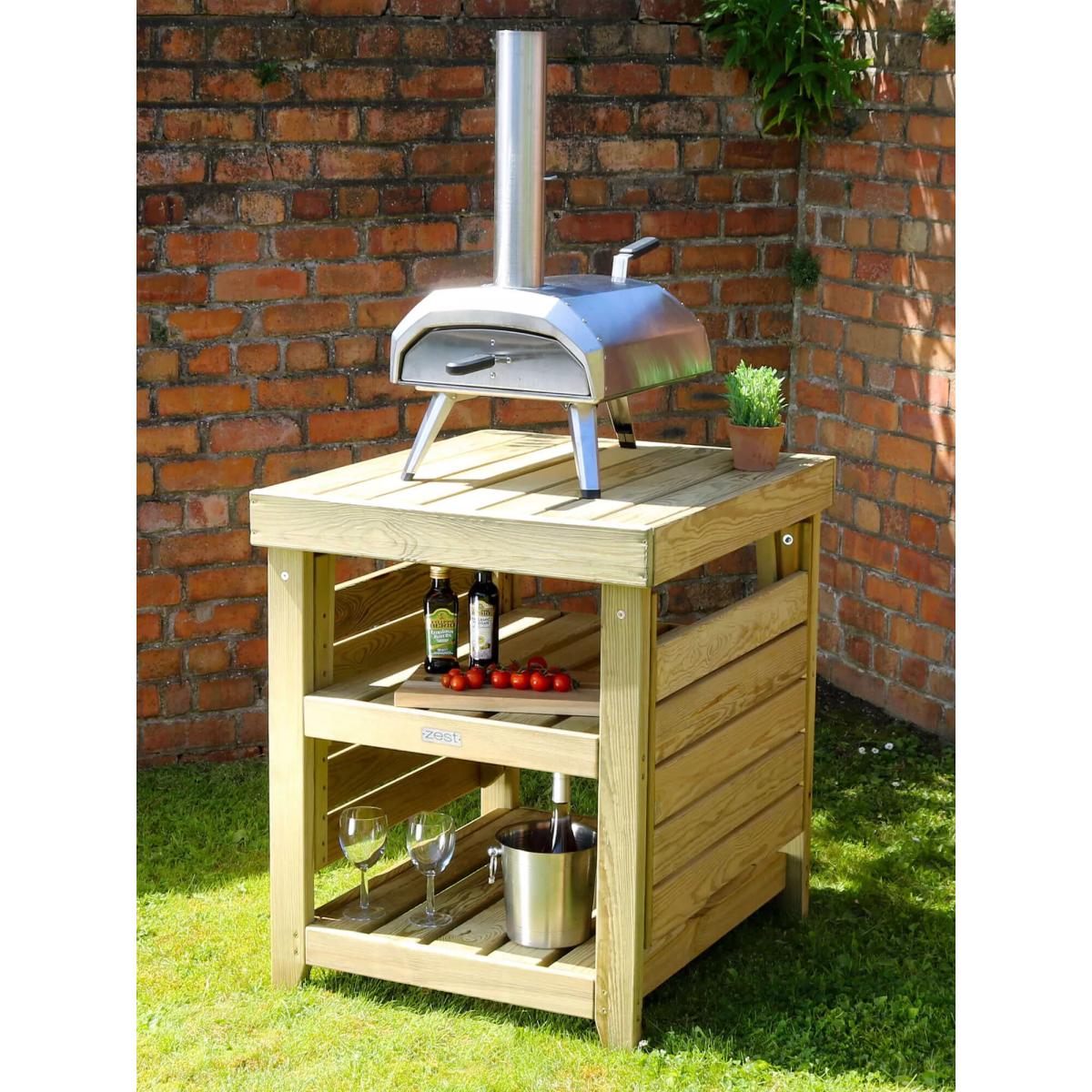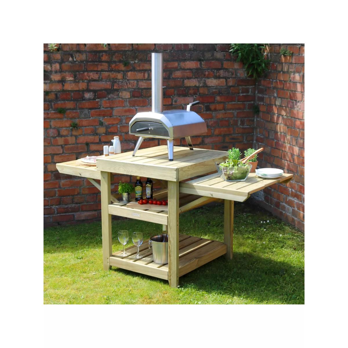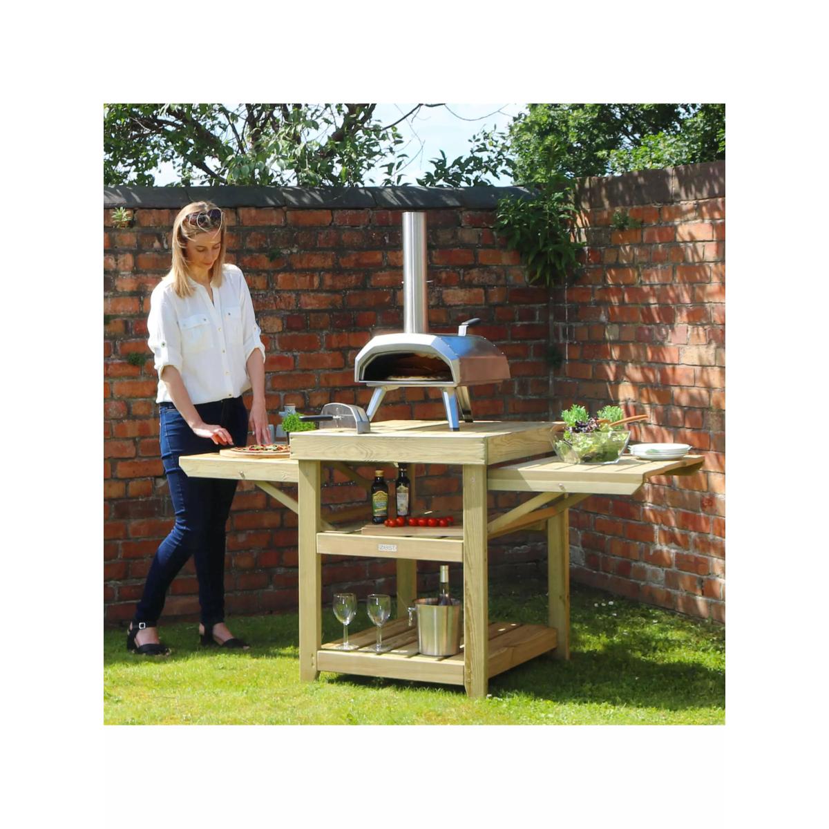 Pizza table from Zest, specifically designed with outdoor cooking in mind. Provides 360-degree access for fuelling the oven as well as for cooking and serving pizzas. The main central table top is designed to securely hold a pizza oven and has two fold-up sides to give you preparation and serving areas. Two substantial shelves below are great for ice buckets, refreshments, plates and everything needed for outdoor entertaining in style. Also ideal as a barbecue side table or as a garden potting table. Made of pressure-treated wood for maximum protection. The wood is a mix of slow-grown European pine and spruce from sustainably managed forests and PEFC-certified (Programme for the Endorsement of Forest Certification). Care information Allow your product time to adjust to its new location. Timber is a natural material which means that each item is unique, therefore changes in temperature and humidity will cause expansion and contraction. Any natural movement will not affect the strength of this product or its beauty but it can be useful to check the tightness of the screws and fixings around a month after assembly to accommodate any such movement, and from time to time after that. There's no need to treat your new Zest timber product with preservatives as it has been pressure-treated against rot for ten years. If you prefer to enhance its colour, then the best time to do so is six months after taking delivery using a well-known reputable timber preservative. If you notice any build-up of green mildew due to weather conditions, all you need to do is wash your Zest product with a solution of soft soap and warm water, rinse thoroughly with fresh water and leave to dry completely.