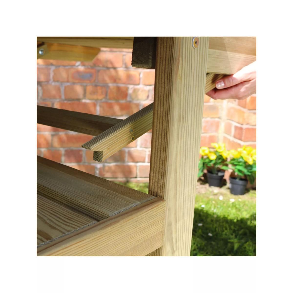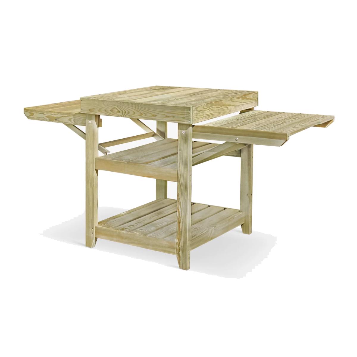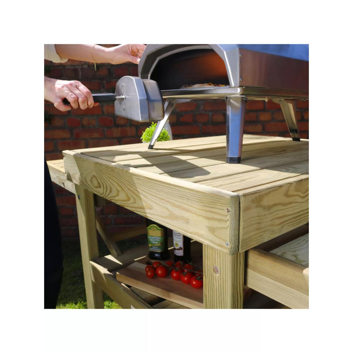 Pizza table from Zest, specifically designed with outdoor cooking in mind. Provides 360-degree access for fuelling the oven as well as for cooking and serving pizzas. The main central table top is designed to securely hold a pizza oven and has two fold-up sides to give you preparation and serving areas. Two substantial shelves below are great for ice buckets, refreshments, plates and everything needed for outdoor entertaining in style. Also ideal as a barbecue side table or as a garden potting table. Made of pressure-treated wood for maximum protection. The wood is a mix of slow-grown European pine and spruce from sustainably managed forests and PEFC-certified (Programme for the Endorsement of Forest Certification). Care information Allow your product time to adjust to its new location. Timber is a natural material which means that each item is unique, therefore changes in temperature and humidity will cause expansion and contraction. Any natural movement will not affect the strength of this product or its beauty but it can be useful to check the tightness of the screws and fixings around a month after assembly to accommodate any such movement, and from time to time after that. There's no need to treat your new Zest timber product with preservatives as it has been pressure-treated against rot for ten years. If you prefer to enhance its colour, then the best time to do so is six months after taking delivery using a well-known reputable timber preservative. If you notice any build-up of green mildew due to weather conditions, all you need to do is wash your Zest product with a solution of soft soap and warm water, rinse thoroughly with fresh water and leave to dry completely.