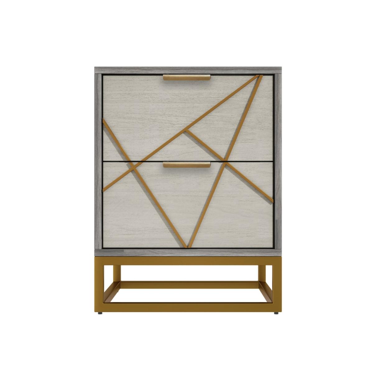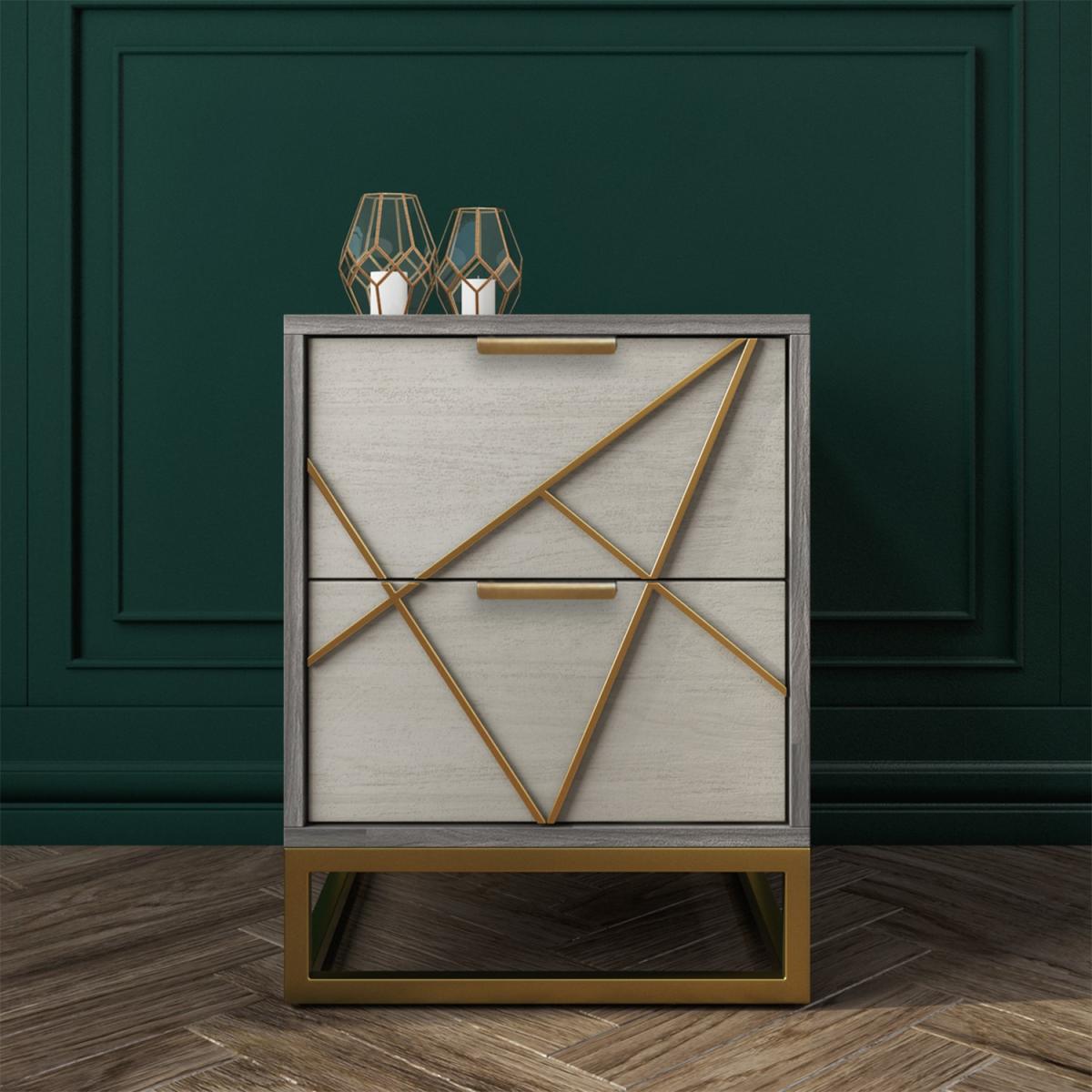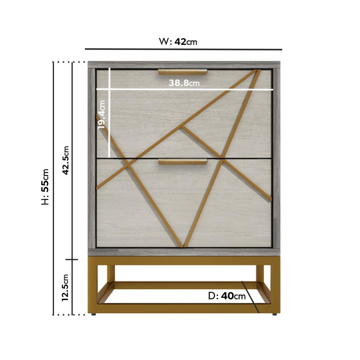 Crafted using solid mango wood with wooden gold painted geometric detailing and chunky, robust iron legs, this bedside table makes a real statement in your sleep space whatever your decorating style. It offers a contemporary twist on an industrial inspired piece. It really impresses with its striking geometric inlay of antique gold painted wood across the front and adds a subtle shine to the distressed wood construction and beautiful grey coloured background, bringing it to life. It features two spacious drawers, providing ample storage space for those bedside essentials and smaller items of clothing. The top offers plenty of room too, perfect for holding your personal belongings as well as standing a lamp and clock within easy reach. The beauty of this is that it's ready to use right away as it comes fully assembled. Why not combine it with the matching pieces to create a complete suite.