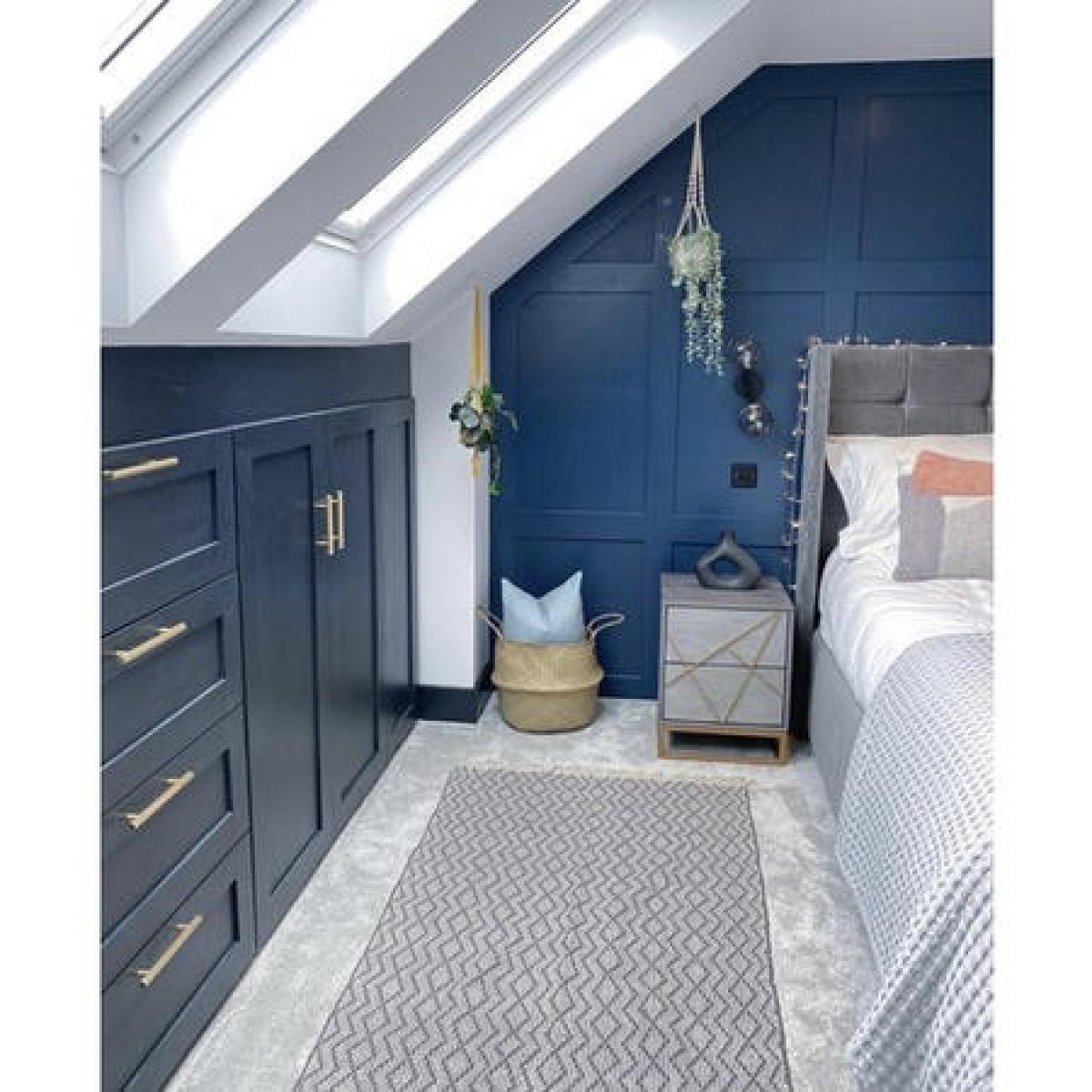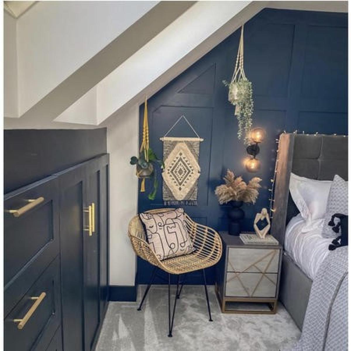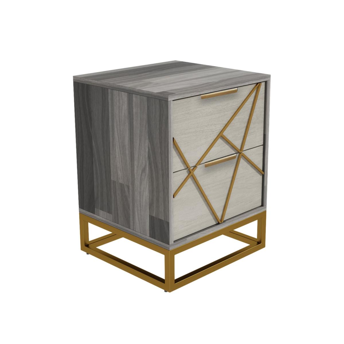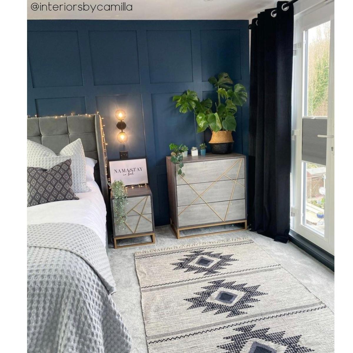 Crafted using solid mango wood with wooden gold painted geometric detailing and chunky, robust iron legs, this bedside table makes a real statement in your sleep space whatever your decorating style. It offers a contemporary twist on an industrial inspired piece. It really impresses with its striking geometric inlay of antique gold painted wood across the front and adds a subtle shine to the distressed wood construction and beautiful grey coloured background, bringing it to life. It features two spacious drawers, providing ample storage space for those bedside essentials and smaller items of clothing. The top offers plenty of room too, perfect for holding your personal belongings as well as standing a lamp and clock within easy reach. The beauty of this is that it's ready to use right away as it comes fully assembled. Why not combine it with the matching pieces to create a complete suite.