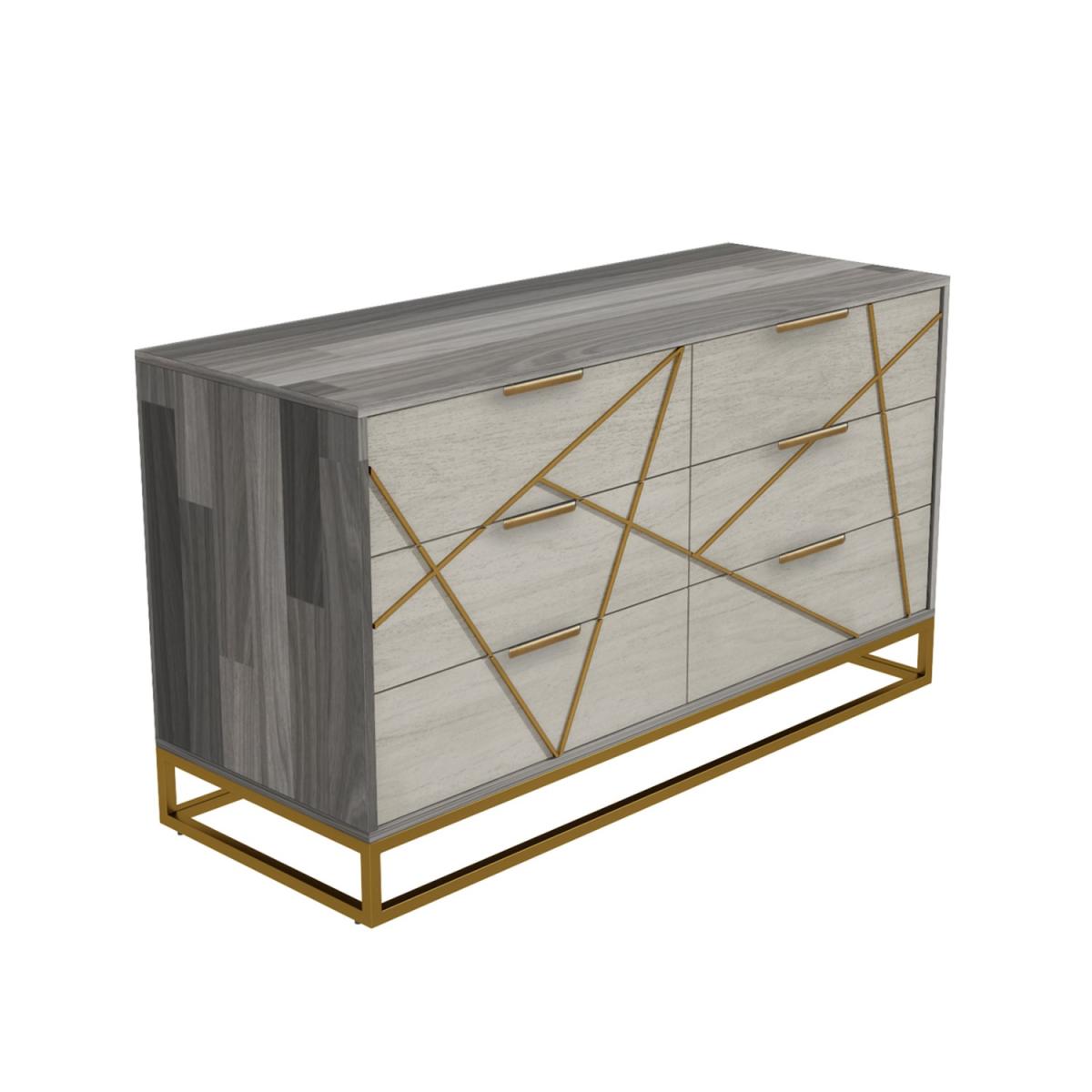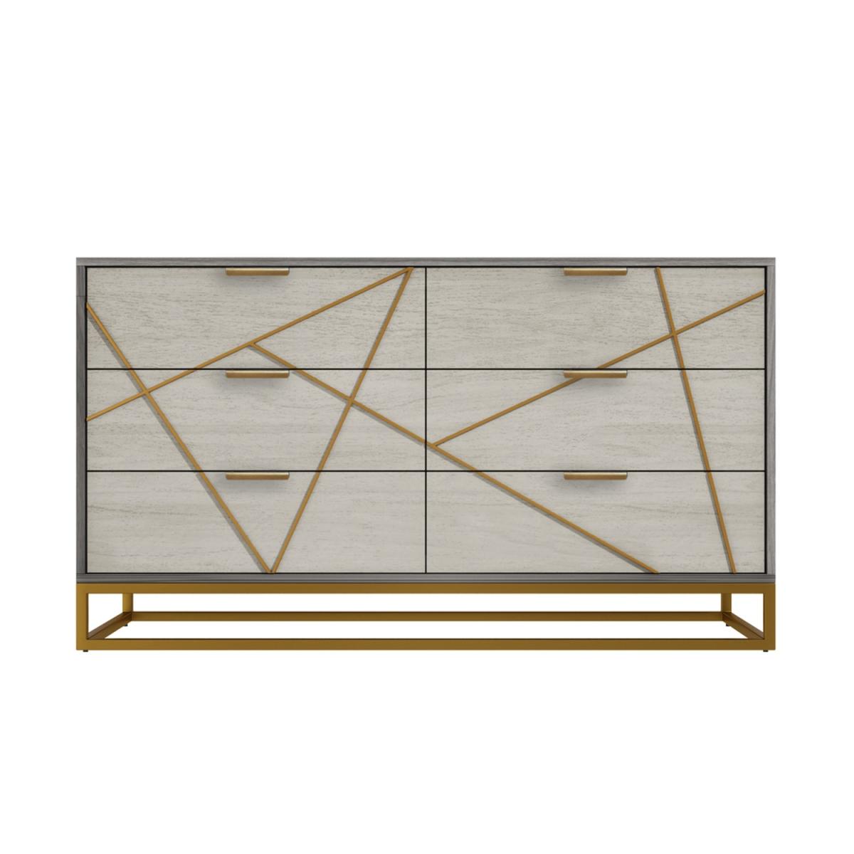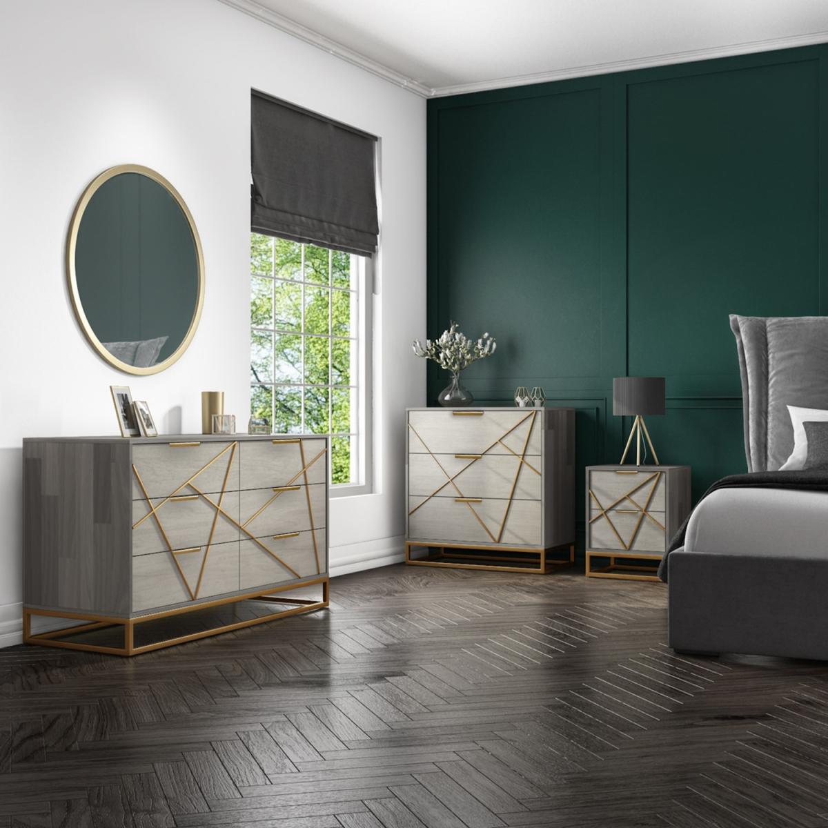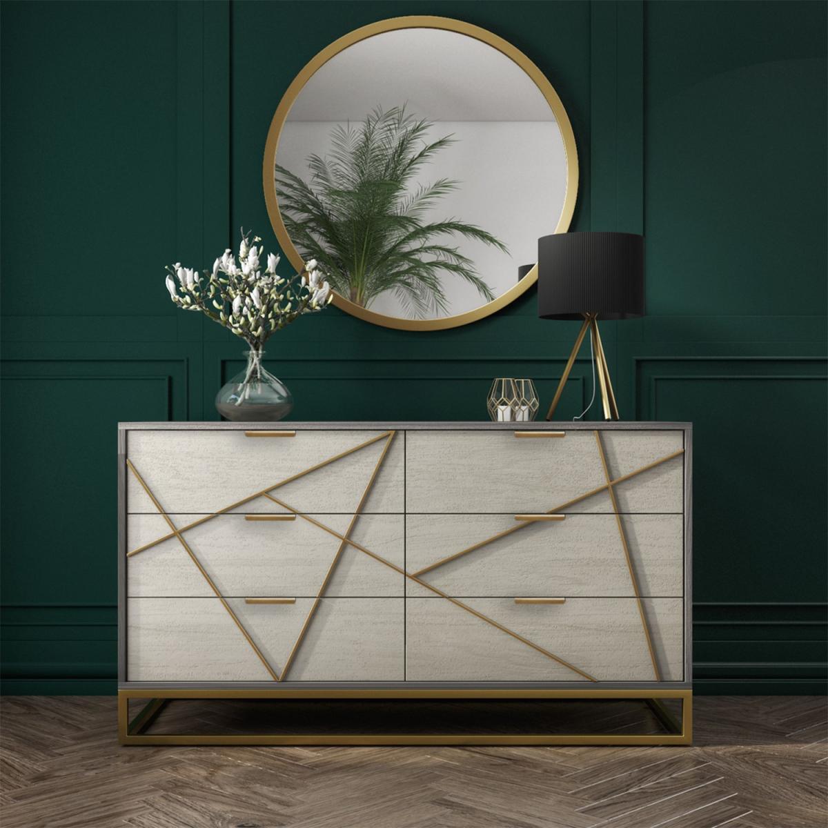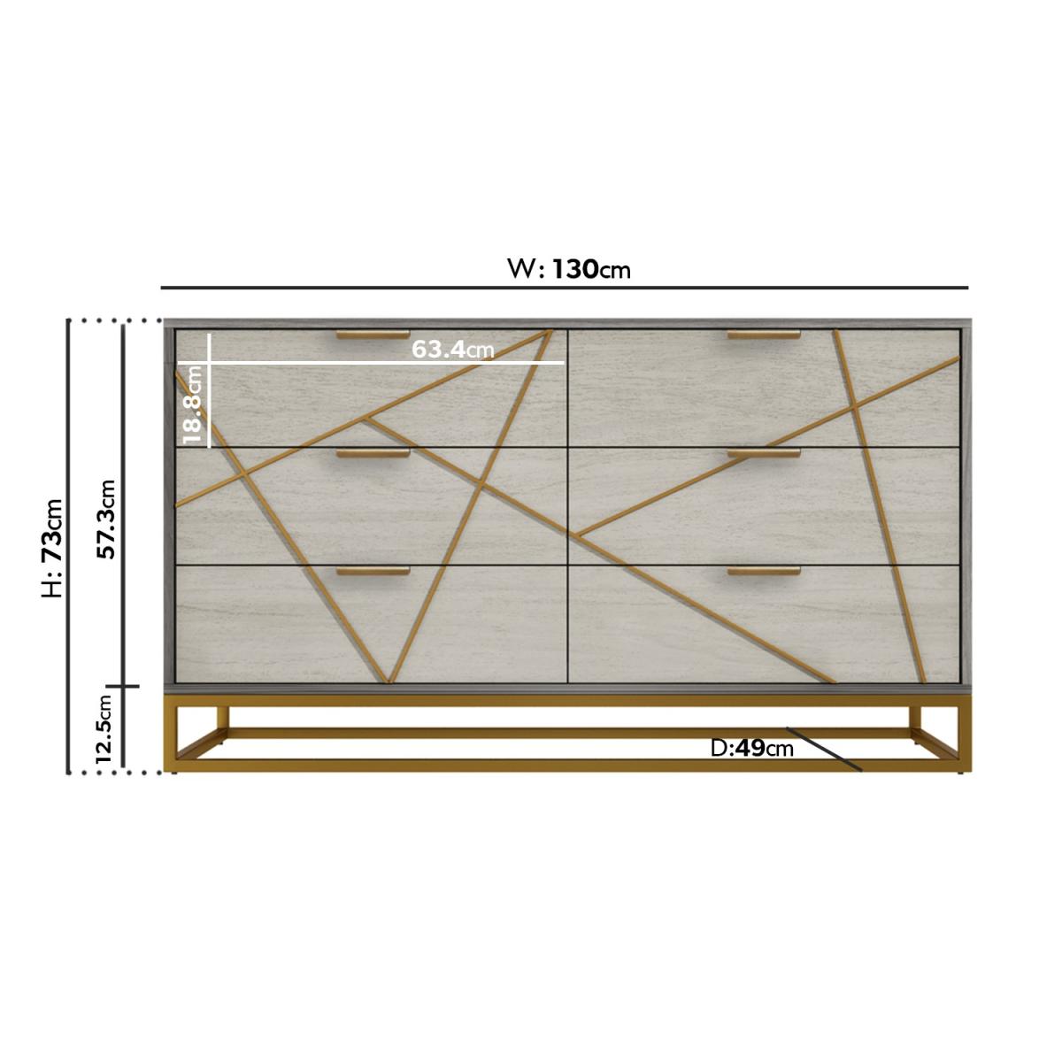 Crafted using solid mango wood with brass geometric wood detailing chunky, robust iron legs, this chest of drawers makes a real statement in your sleep space whatever your decorating style. It offers a contemporary twist on an industrial inspired piece. It really impresses with its striking geometric inlay of antique gold painted wood across the front and adds a subtle shine to the distressed wood construction and beautiful grey coloured background, bringing it to life. It features six spacious drawers, providing plenty of room for your clothes and essentials, you'll be able to keep your bedroom neat and tidy while the wide top surface is perfect for standing a fresh vase of flowers, ornaments, photos and even a mirror to help you get ready in the morning. The beauty of this is that it's ready to use right away as all you need to do is assemble the legs. Why not combine it with the matching pieces to create a complete suite.