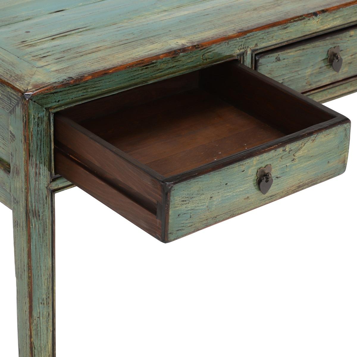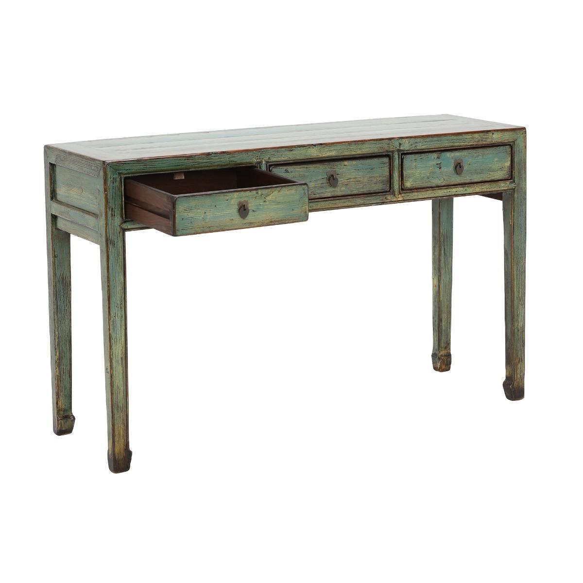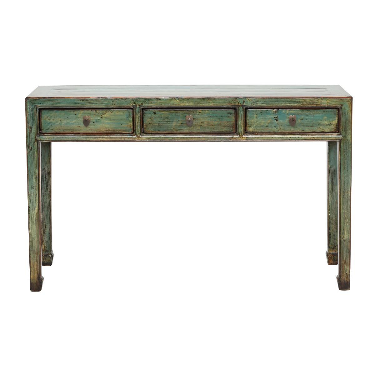 Design. A piece with plenty of heritage, the Zhen Console Table offers a unique distressed look, inspired by traditional chinese furnishing and given a calming aestheticwith painted hues of teal washed across its pine surfaces. Delicately placed brass pully handles sit at the front of each drawer, providing accessible storage for your hallway, living room, or walkway. Adding a rustic look to your home, this ornate piece will be a focal point in any space it is placed in, offering a twist on classic storage and interior decor.