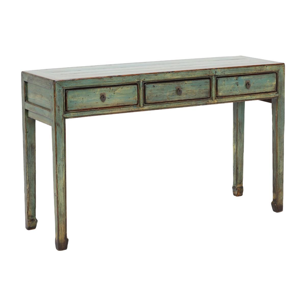 Design. A piece with plenty of heritage, the Zhen Console Table offers a unique distressed look, inspired by traditional chinese furnishing and given a calming aestheticwith painted hues of teal washed across its pine surfaces. Delicately placed brass pully handles sit at the front of each drawer, providing accessible storage for your hallway, living room, or walkway. Adding a rustic look to your home, this ornate piece will be a focal point in any space it is placed in, offering a twist on classic storage and interior decor.