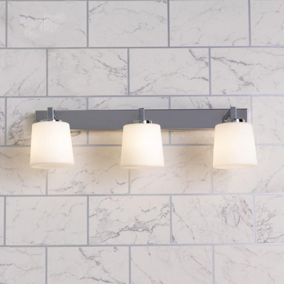 Add a stylish look to your interior design with the Zia Triple Bathroom Wall Light. This wall light is IP44 rated, ensuring that it is sufficiently water resistant enough to be used in the bathroom, looking ideal when styled above a mirror. It also comes in a sleek chrome finish and features opal glass shades for a modern and minimalist aesthetic.