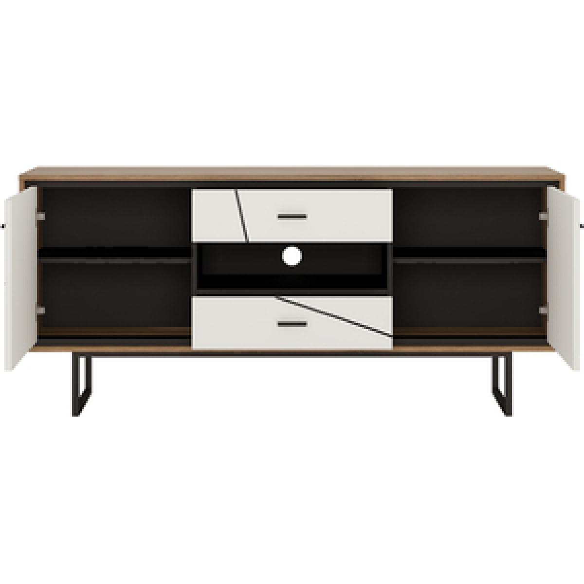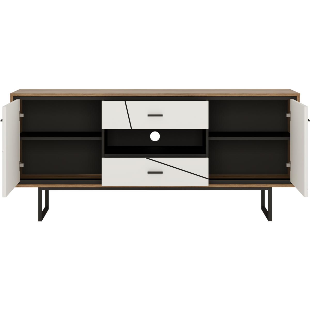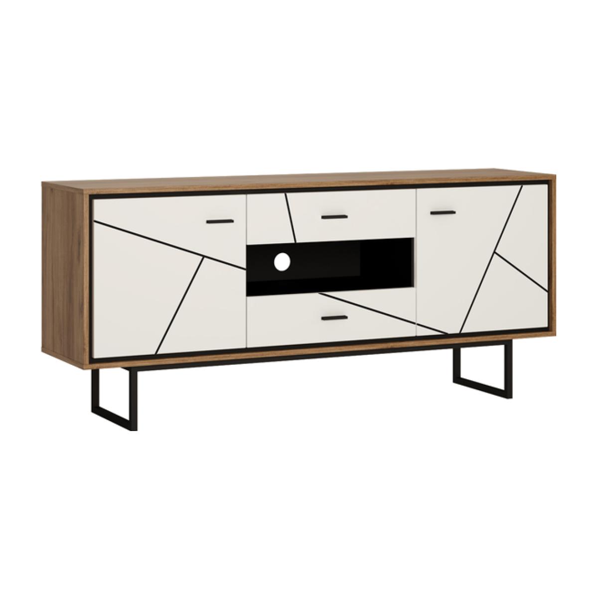 I’m a fan of the zigzag TV unit for its clever mix of clean lines and geometric front panels - it feels fresh in a modern or Scandi-inspired space without screaming for attention. The contrast of white and black doors against the warm wood frame ties in neatly with both monochrome schemes and natural-tone decors, while the raised metal legs give it a light, airy look. For styling, keep the top clutter-free: a low-profile speaker or a single sculptural vase beside a slim lamp works well. Stash remotes and cables behind the doors and drawers to preserve that crisp silhouette. To echo the unit’s accents, bring in a black-edged mirror or a set of floating shelves above, then finish with a couple of small potted plants for a hint of greenery.