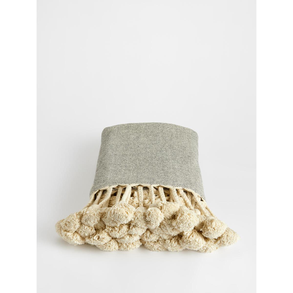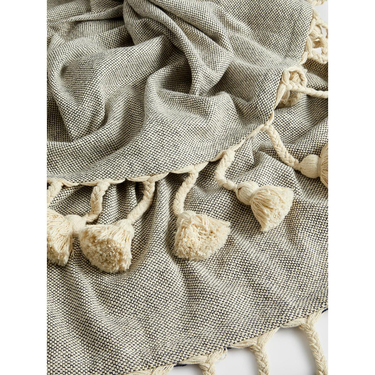 Referencing the textiles in our new House opening in Austin, the Zilker throw is handwoven by skilled artisans in India. Made from acotton blend, it has interweaving navy and cream tones. Largepleated pom-pom tassels provide a tactile finish - a great optionfor a bed, sofa or cosy armchair. Cotton-blend throw. Large pleated pom-pom tassels. Handwoven in India. Navy and cream tones. Inspired by Soho House Austin.