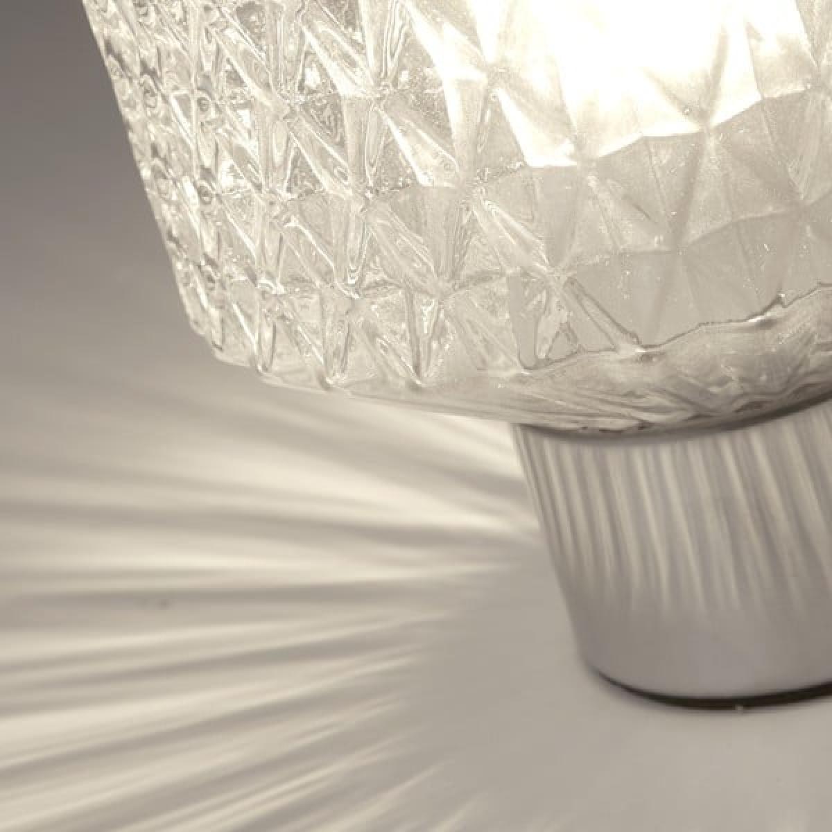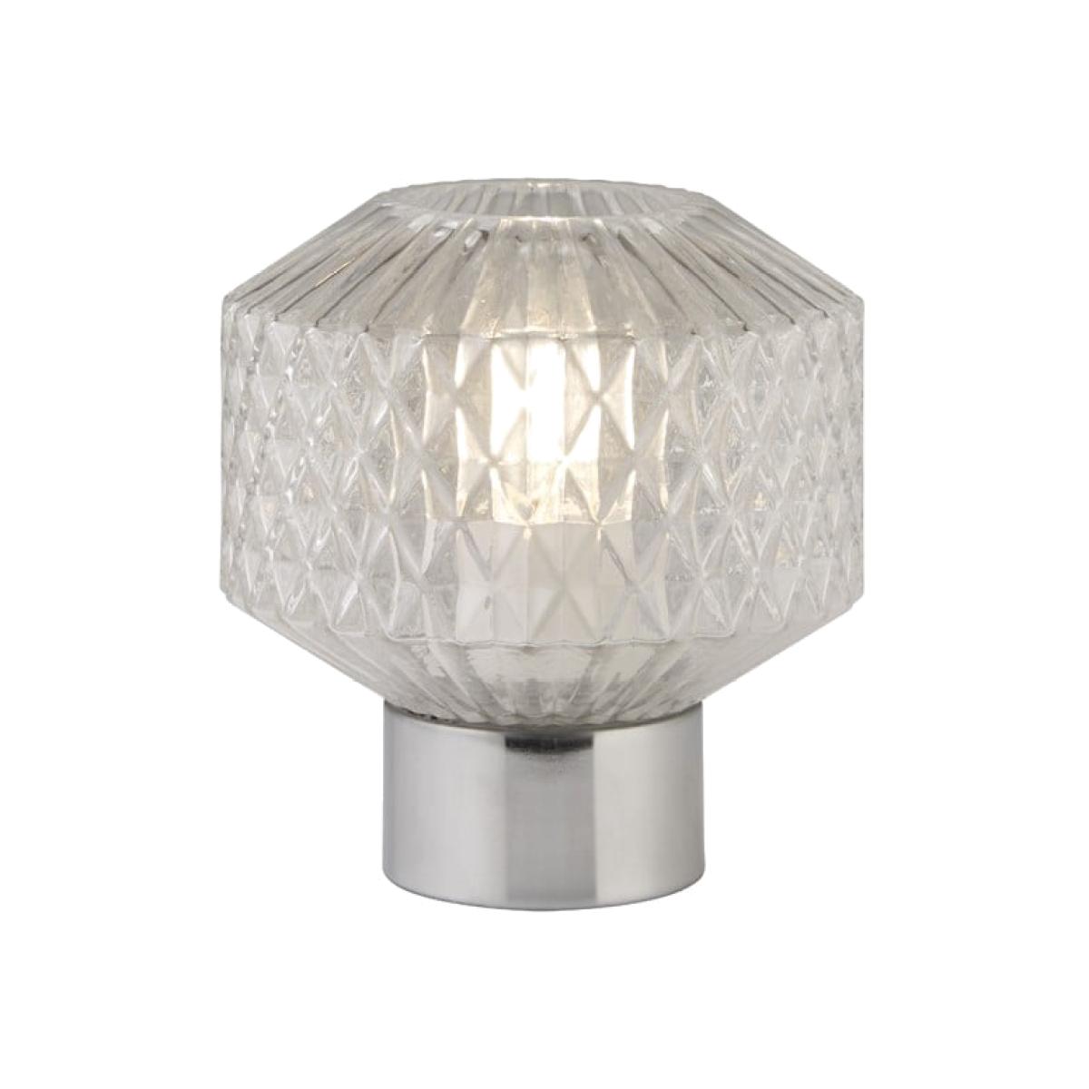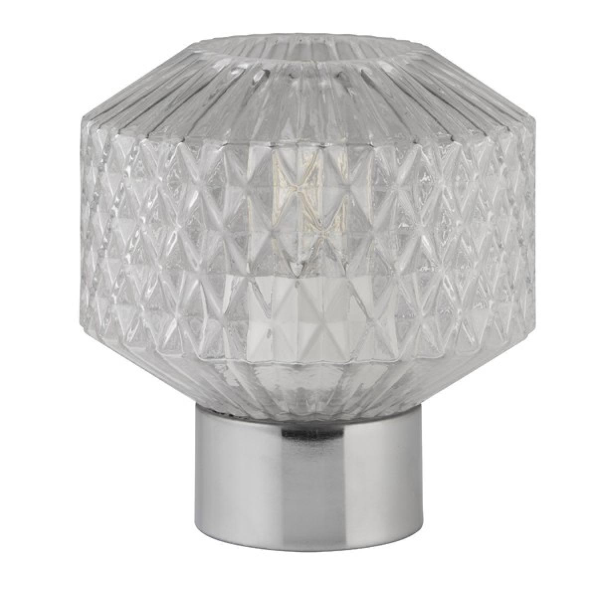 Contemporary clear glass table lamp featuring chrome detail. Featuring a clear jewel-like glass shade and chrome detailing, the Zina table lamp will complement any lounge, hallway or bedroom..