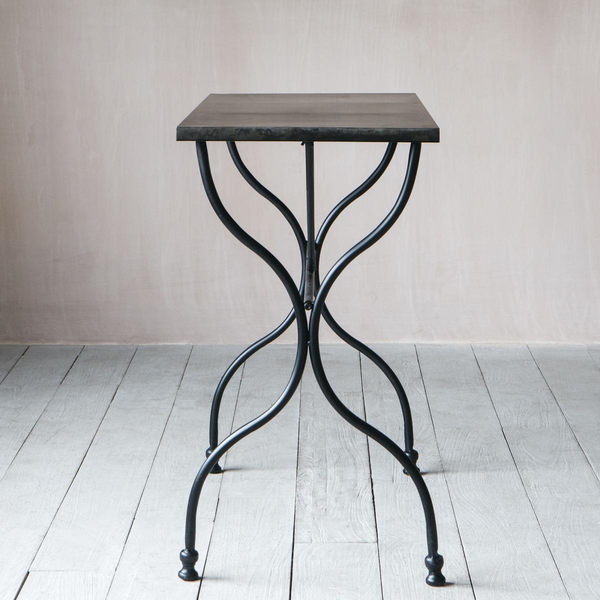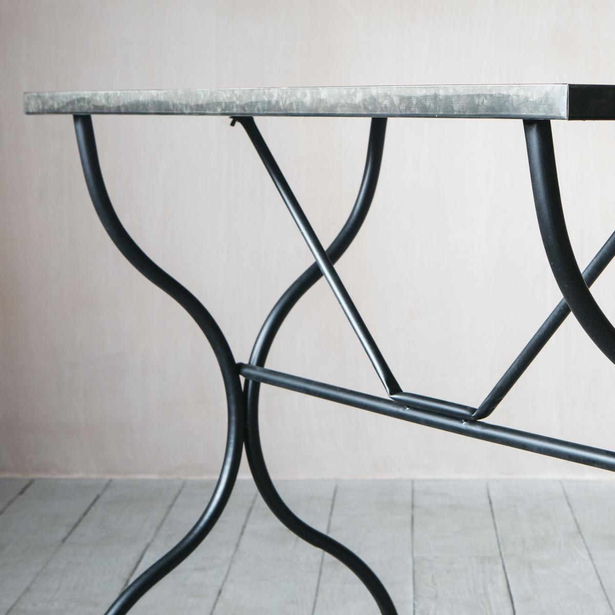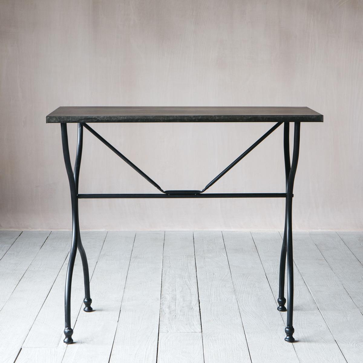 An antiqued zinc tabletop sits on a black iron frame, collect houseplants and concrete accessories on a tall console table with an understated industrial look.