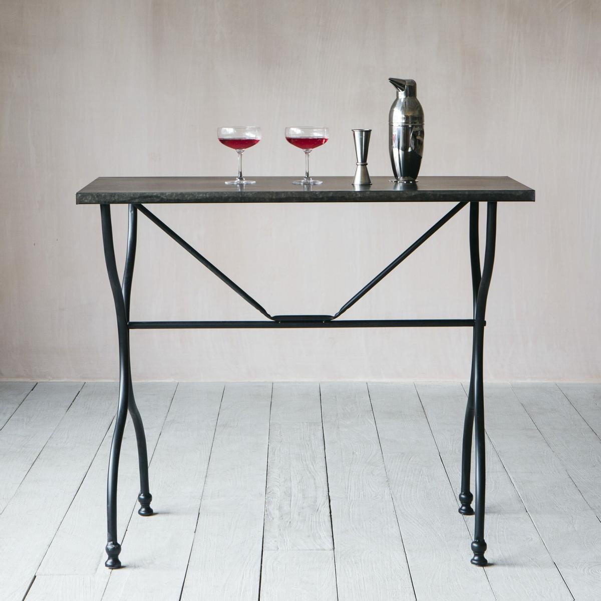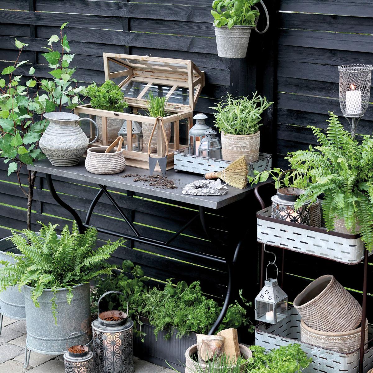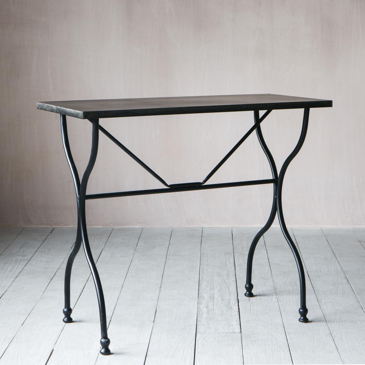 An antiqued zinc tabletop sits on a black iron frame, collect houseplants and concrete accessories on a tall console table with an understated industrial look.