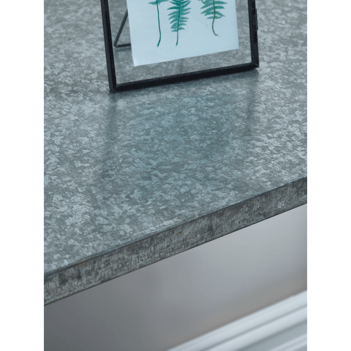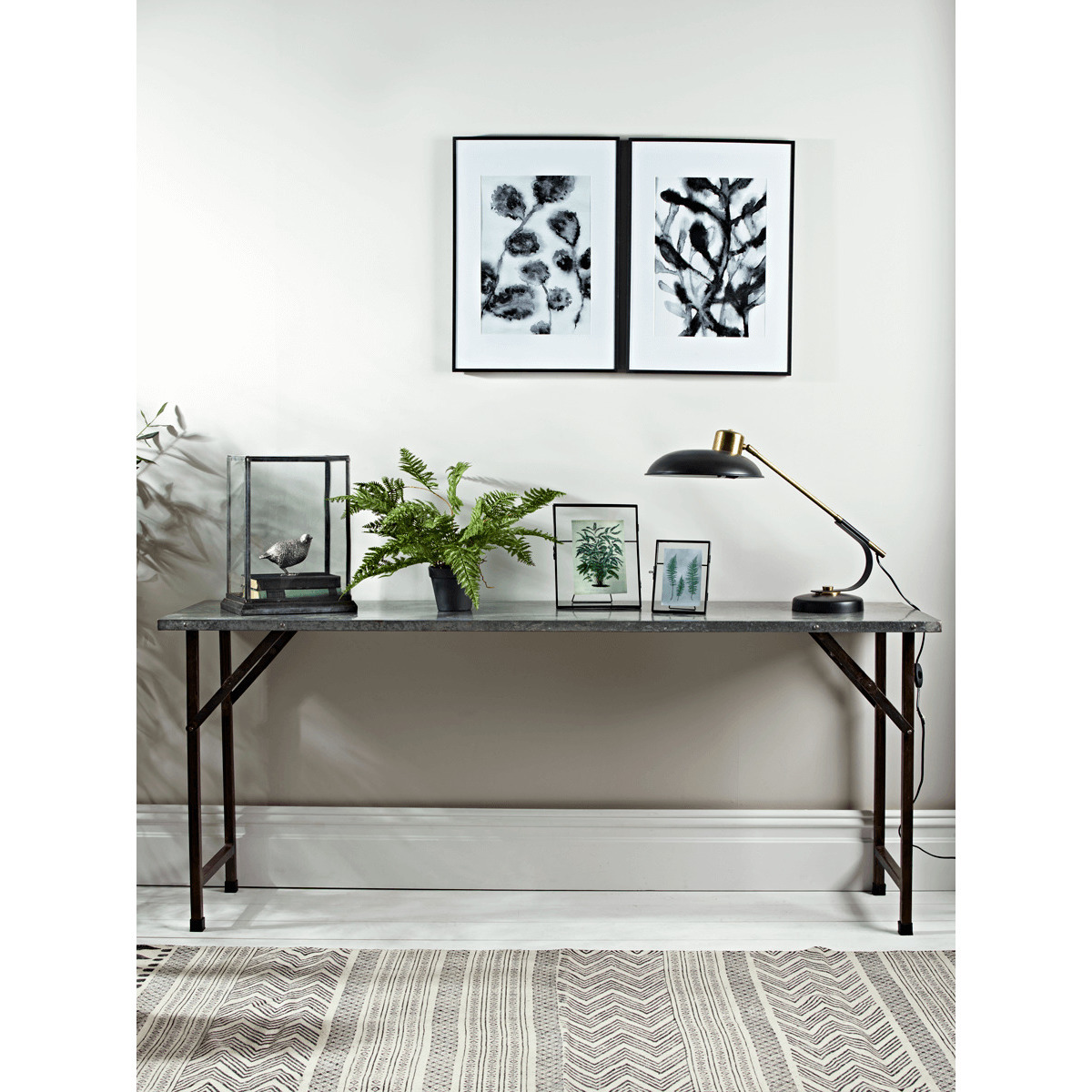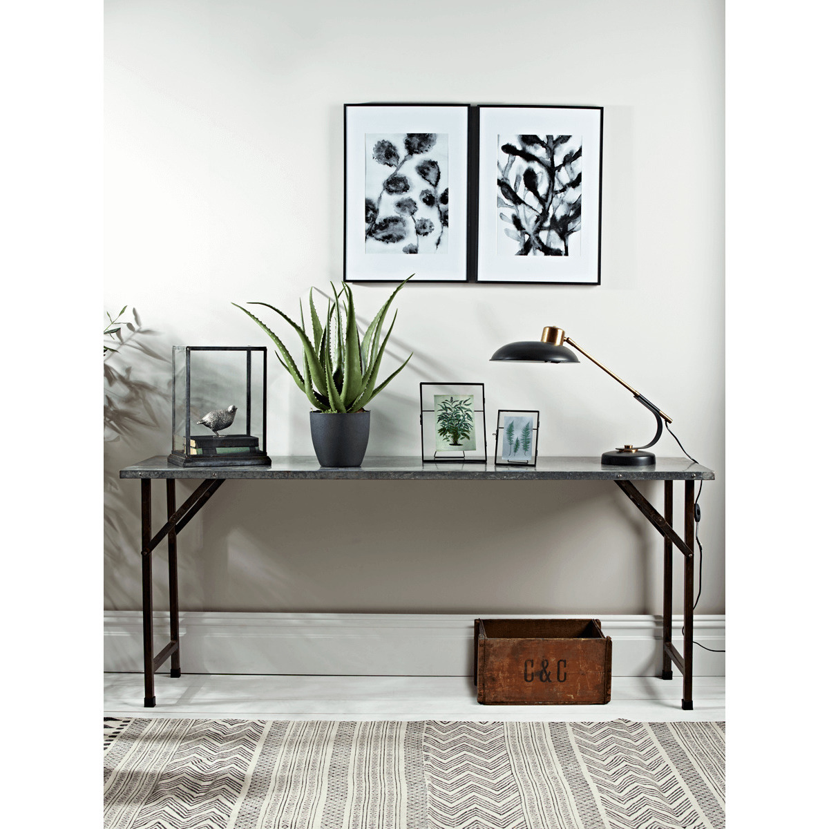 Slender but sturdy, our industrial style console table has a vintage inspired zinc look top and folding black legs, with a distressed finish to bring character to your living space. Each piece has a generous surface for displaying your favourite feature lighting, house plants and decorative accessories.