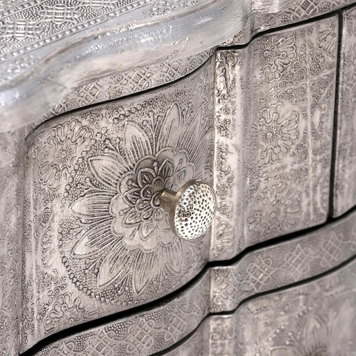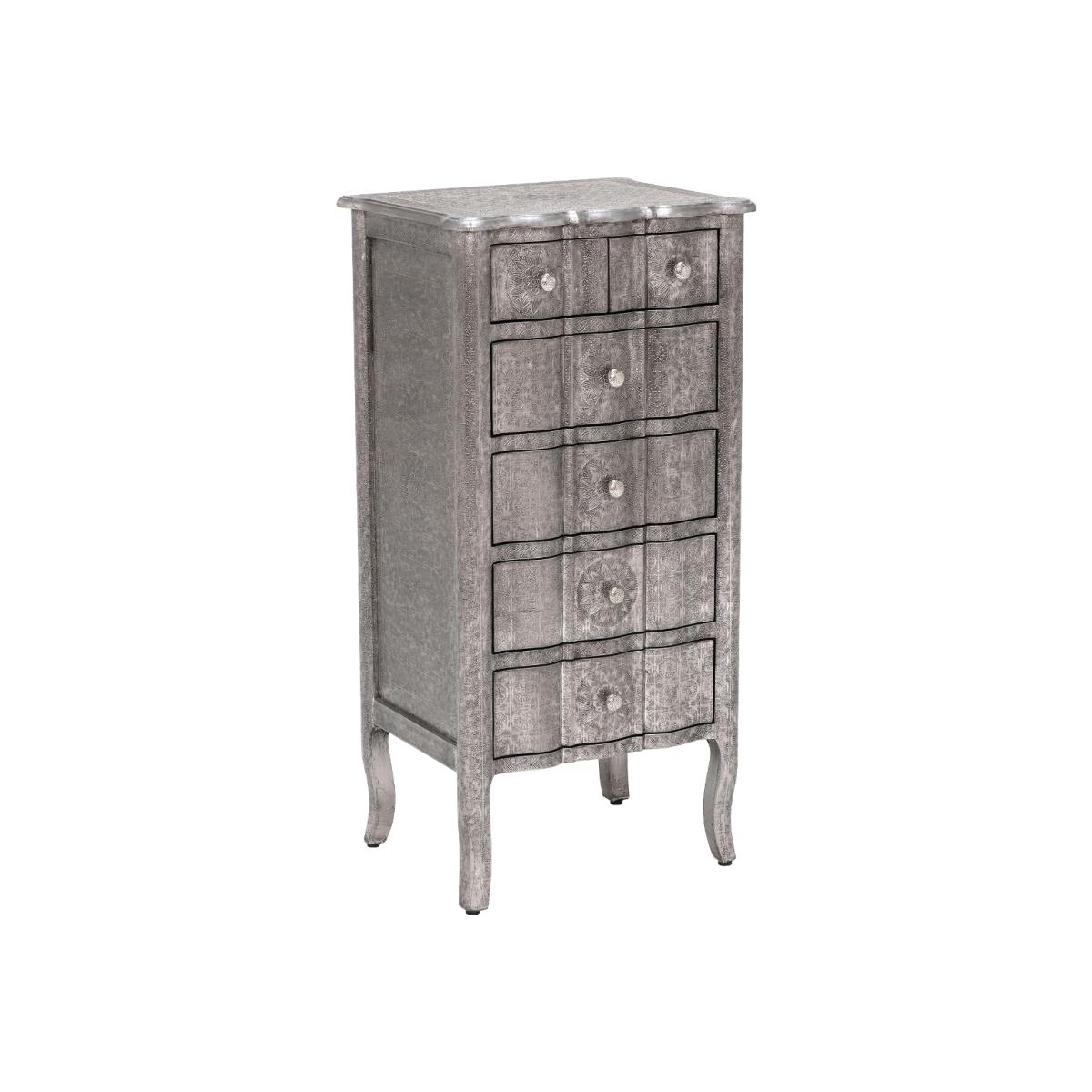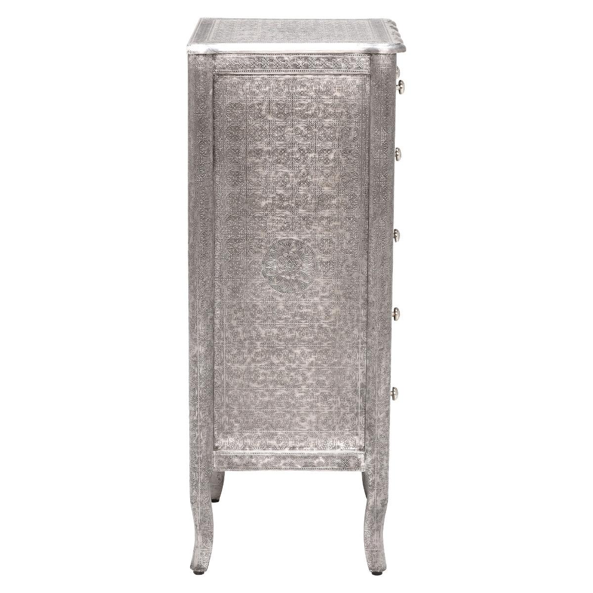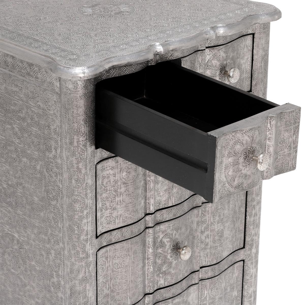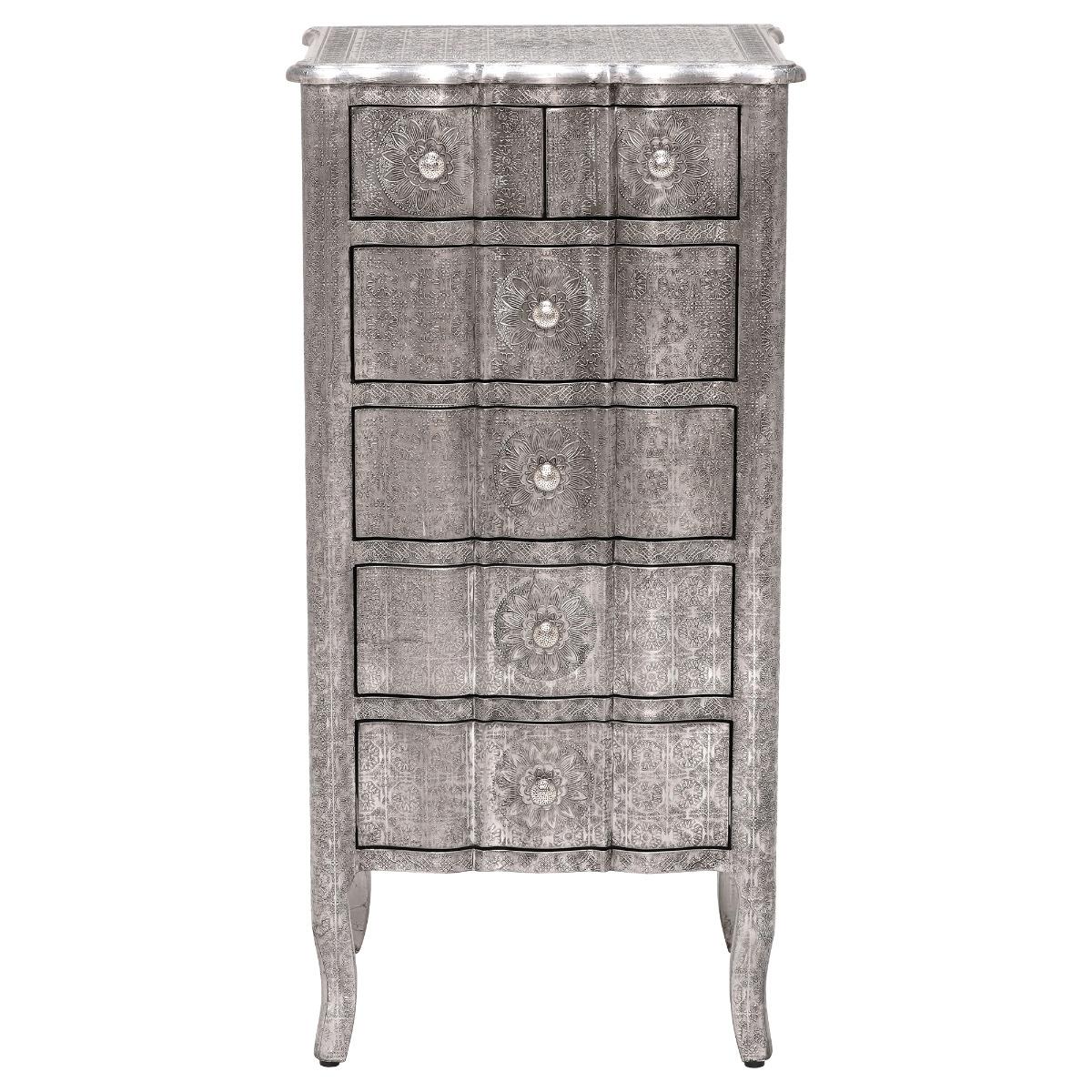 Design. An eye-catching addition to any home that is sure to the topic of talk on all your guests’ lips, the Zinnia 6 Drawer Tall Chest has a unique look that features an engineered wood frame, covered with intricately embossed aluminium in a stunning floral design. Hosting 4 roomy drawers and 2 handy smaller drawers, this stylish number offers a versatile means of stowing away your possessions in various rooms, as well as blending into both modern and classic decors - thanks to its perfect balance of contemporary, clean lines and elegant, subtle curves.