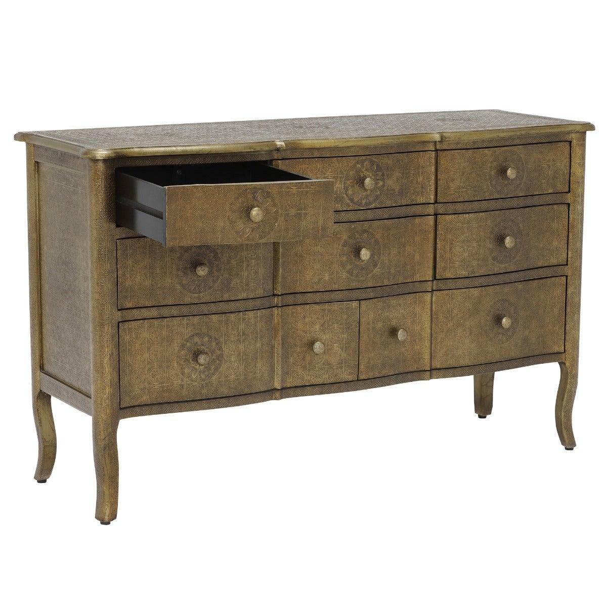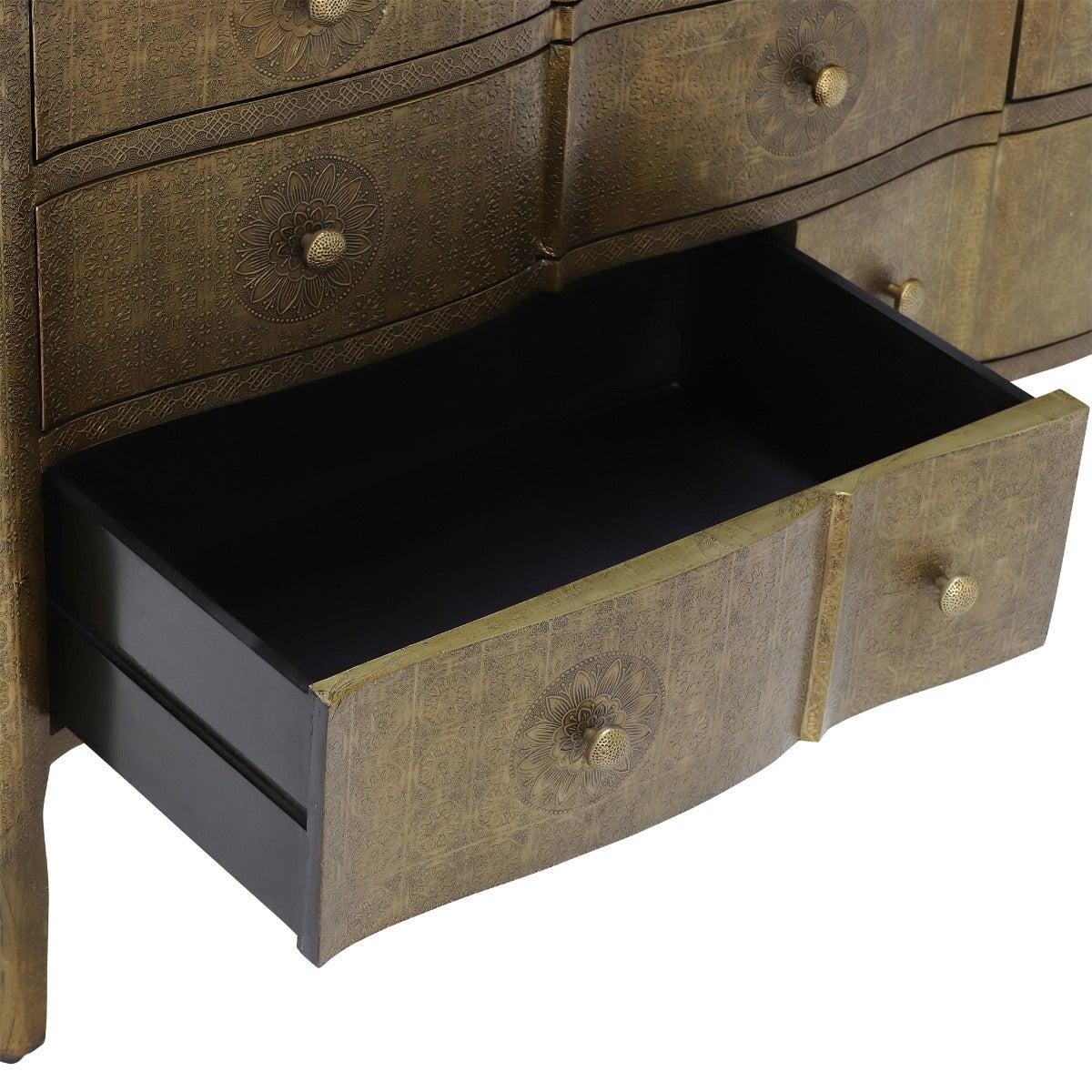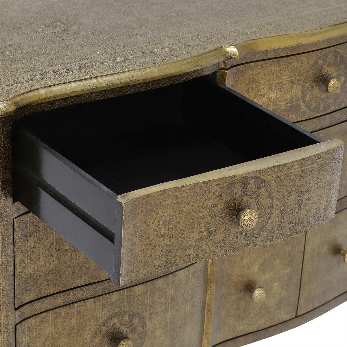 Design. The Zinnia 8 Drawer sideboard has a breath-taking design that is crafted with an engineered wood frame, beautifully covered with floral detailed embossed aluminium and an inviting, warm brass finish. A modern-vintage appeal is achieved through a linear frame paired with delicate curves to add a sense of softness to its design, the Zinnia works in both contemporary and traditional interiors, delivering grandeur wherever it is placed.