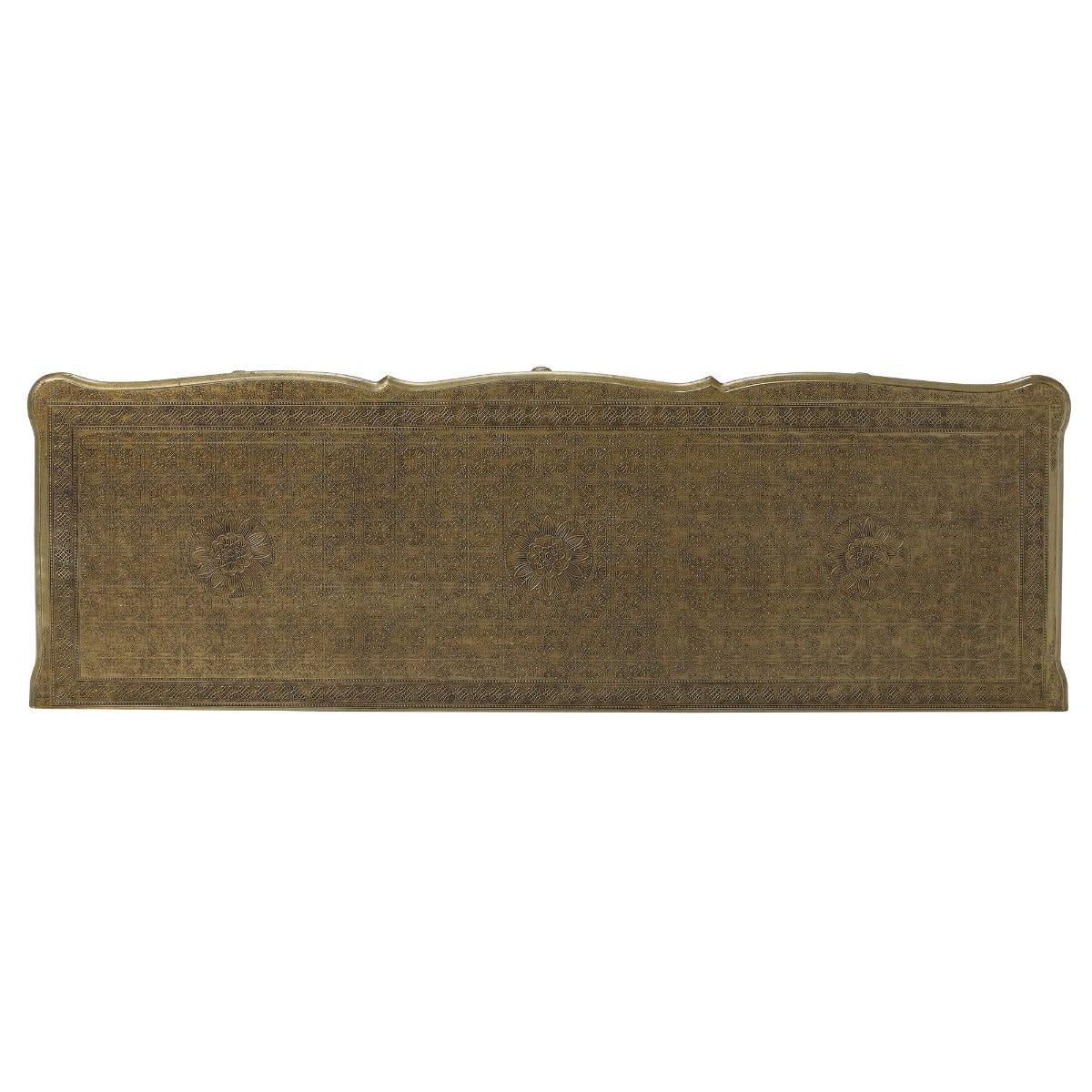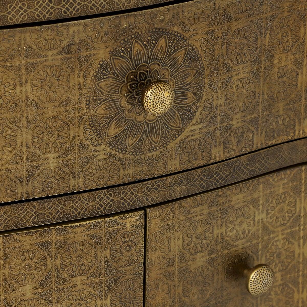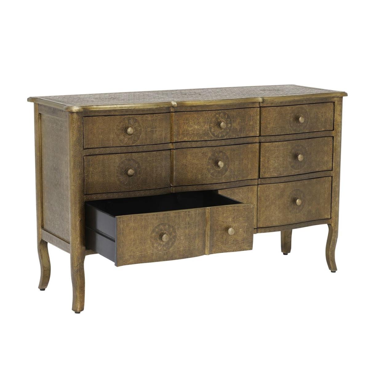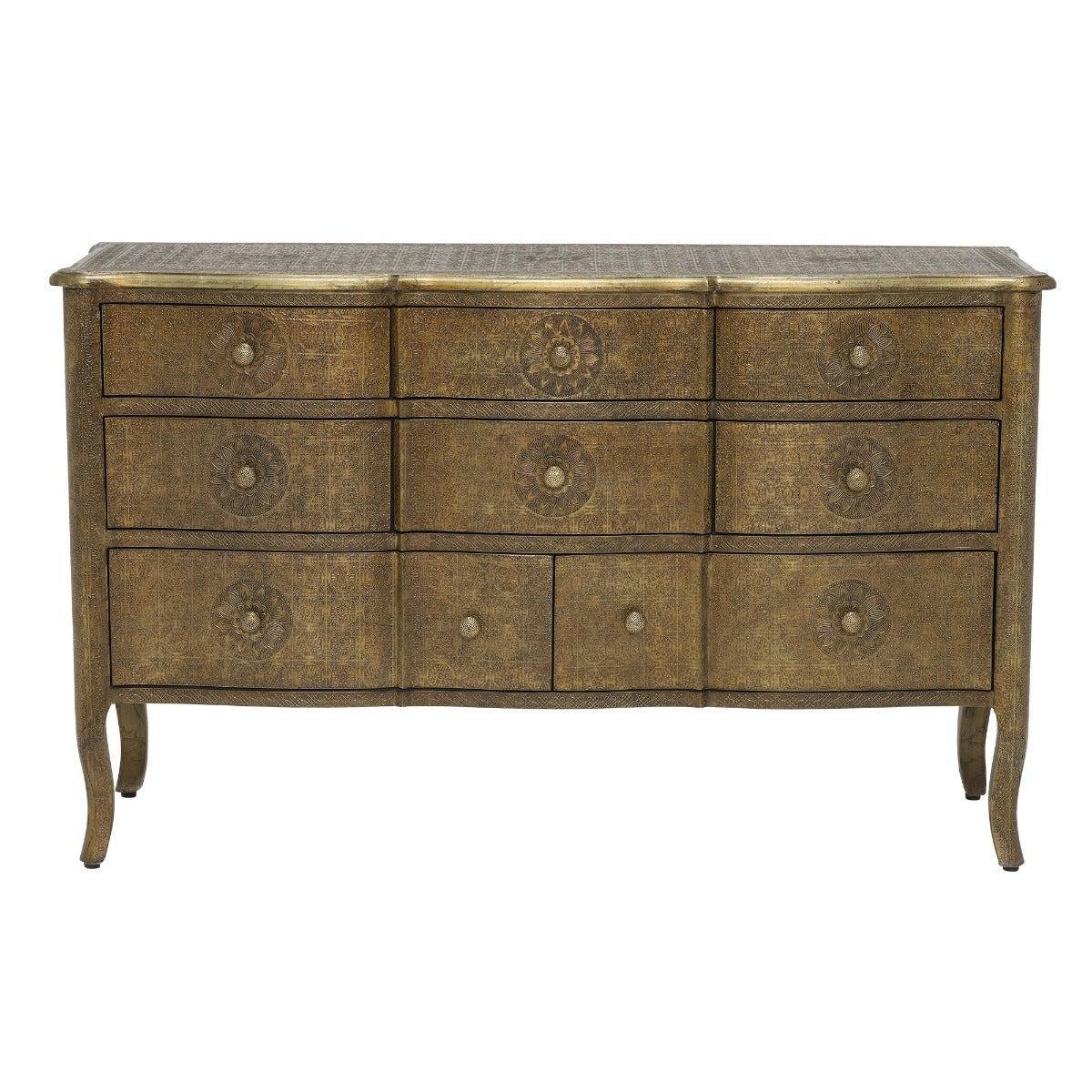 Design. The Zinnia 8 Drawer sideboard has a breath-taking design that is crafted with an engineered wood frame, beautifully covered with floral detailed embossed aluminium and an inviting, warm brass finish. A modern-vintage appeal is achieved through a linear frame paired with delicate curves to add a sense of softness to its design, the Zinnia works in both contemporary and traditional interiors, delivering grandeur wherever it is placed.