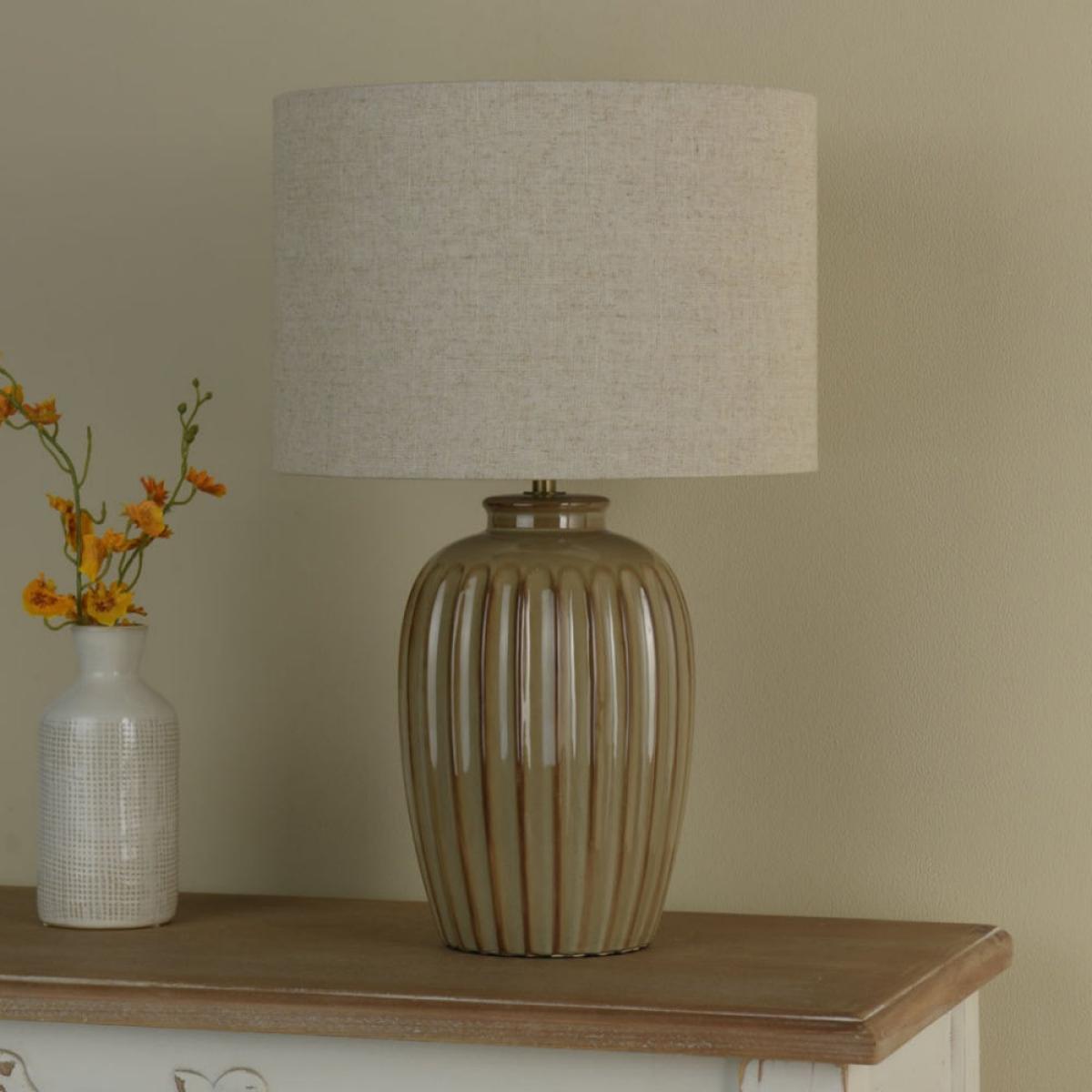 Brings warmth and texture to your home. Crafted from brown ribbed ceramic and finished with a neutral fabric drum shade, this lamp exudes understated elegance while providing a soft, ambient glow. Perfect for living rooms, bedside tables, or hallway consoles, the Zinnia blends classic design with modern simplicity for a timeless look.