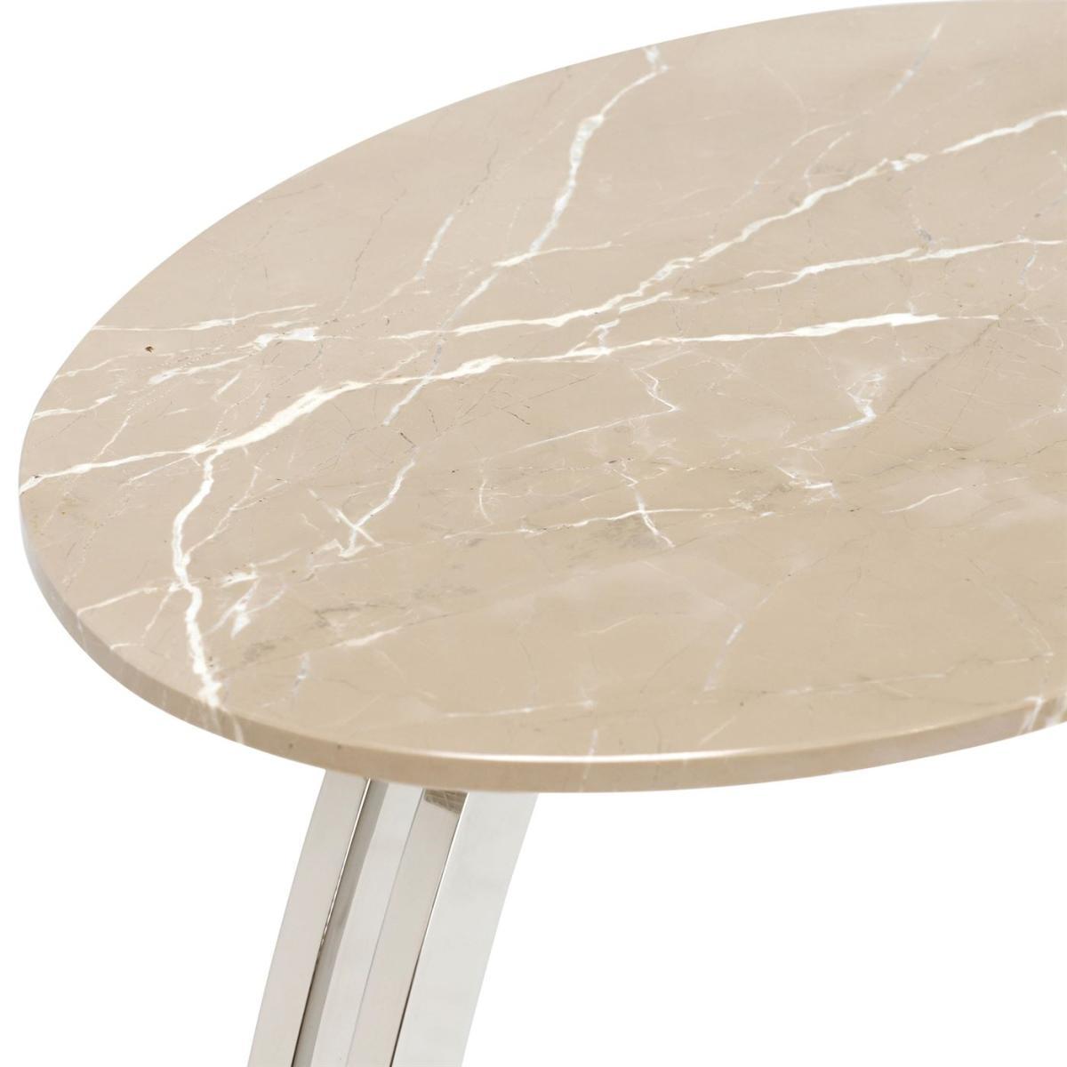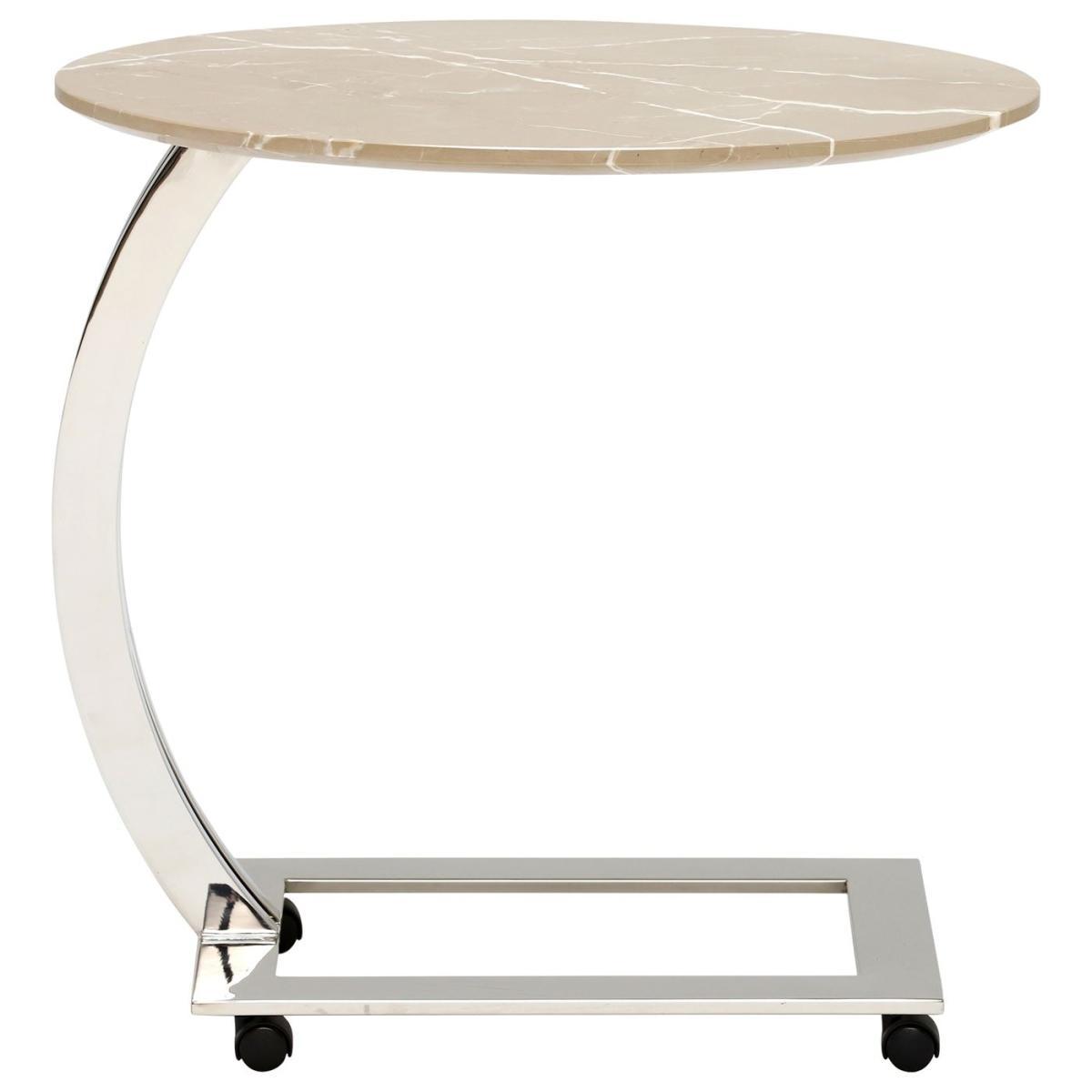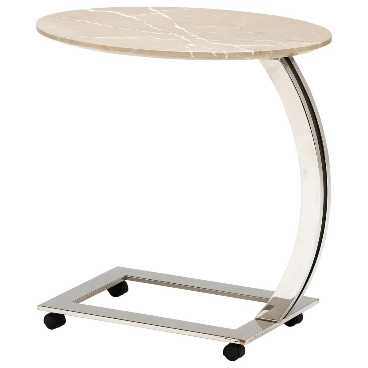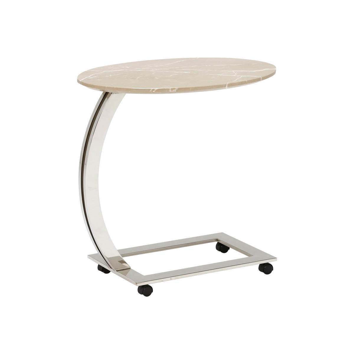 Design. This stylish and sleek piece combines luxury and functionality, the oval top has been beautifully crafted from solid marble and is elegantly supported by a polished chrome arm and base featuring casters allowing you to easily manoeuvre this piece around you living space.