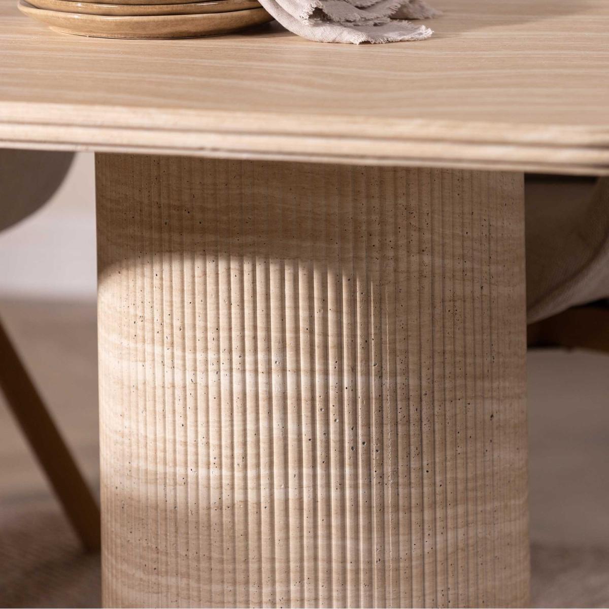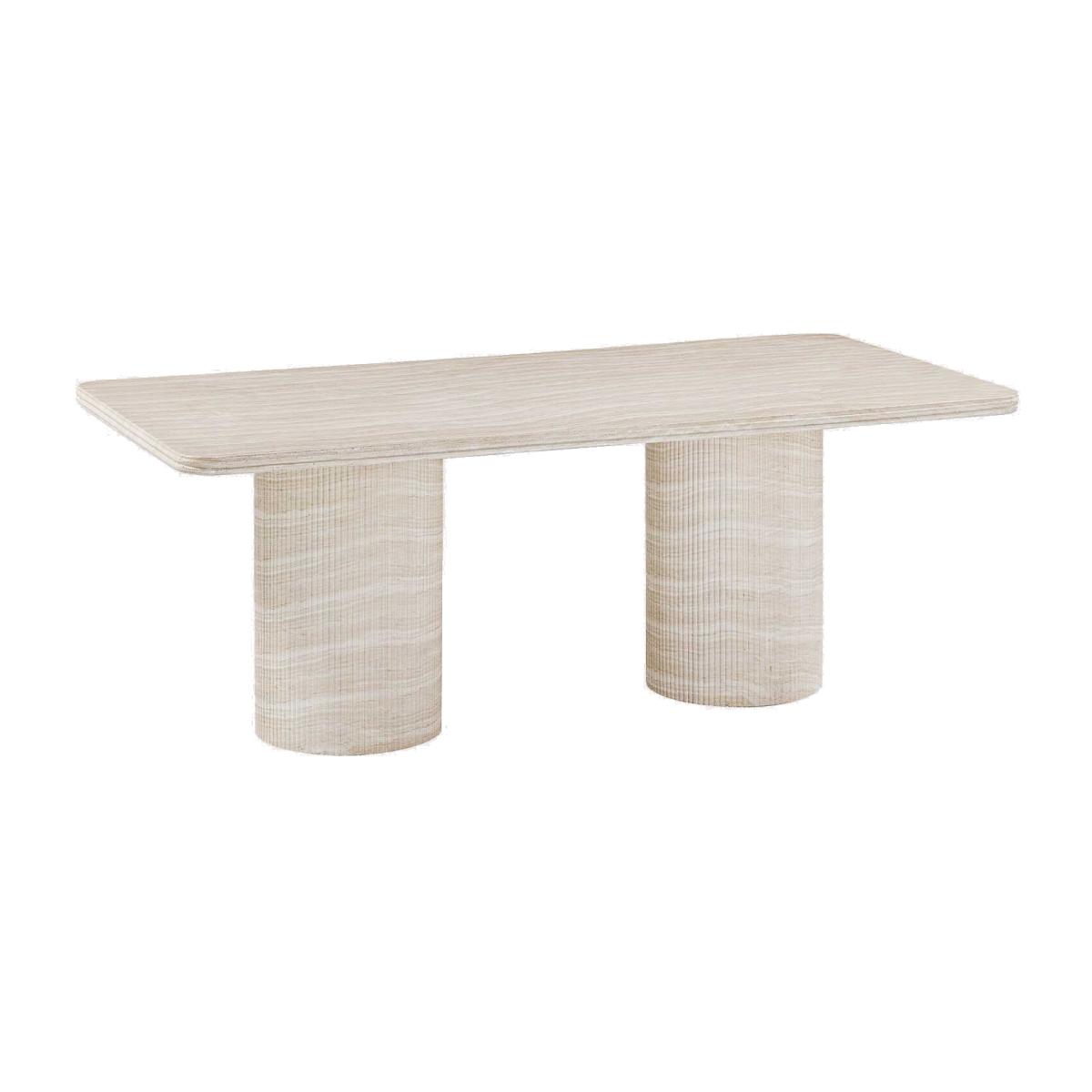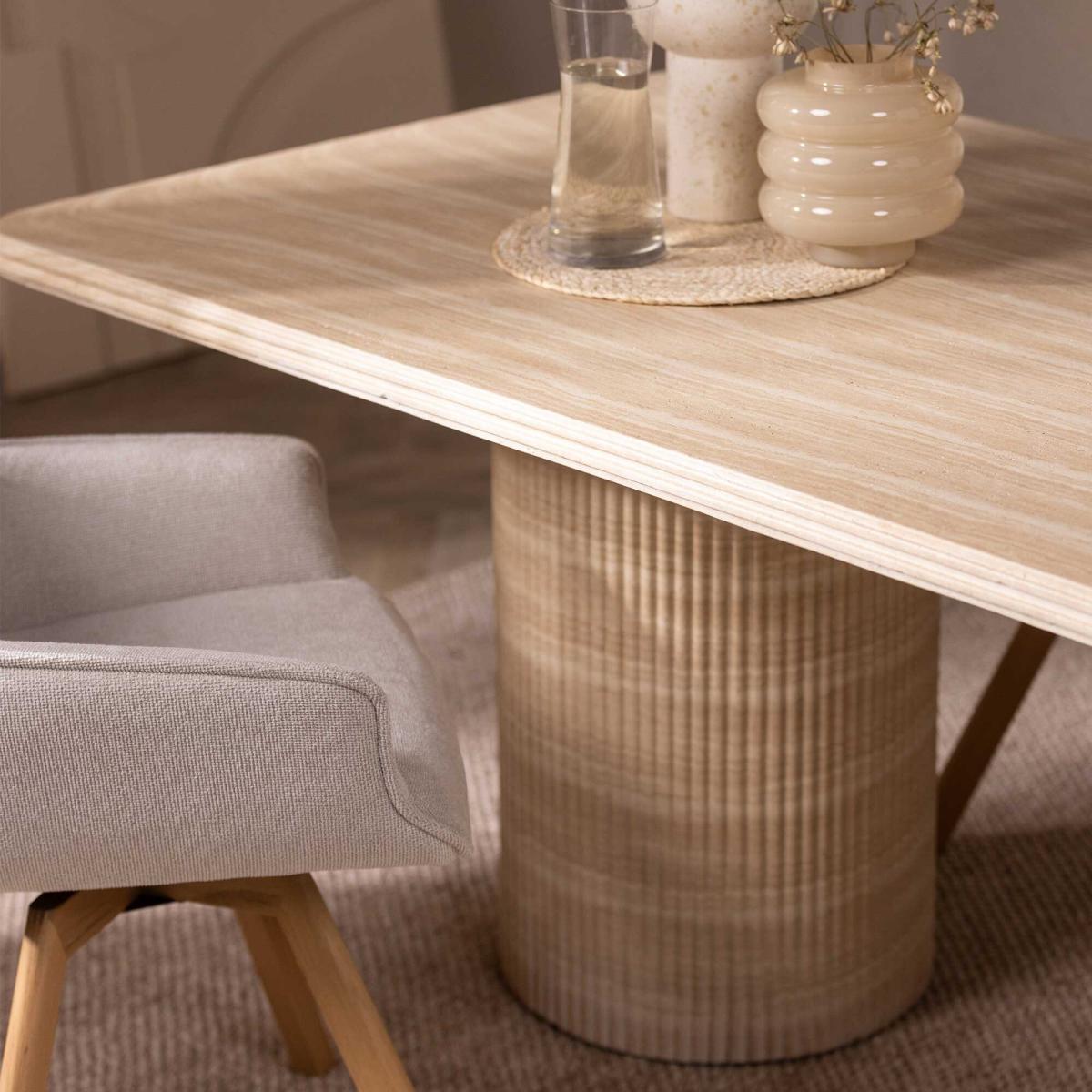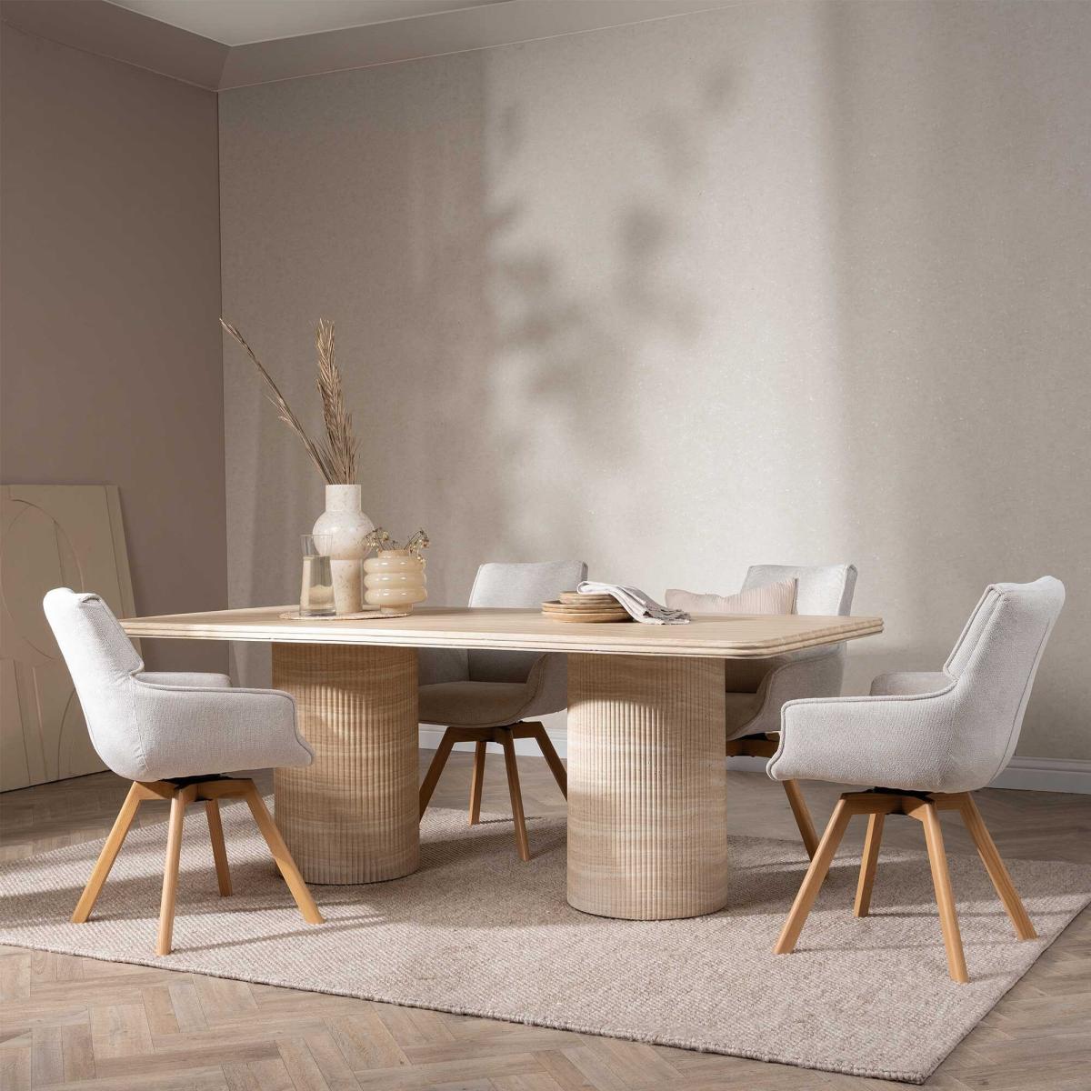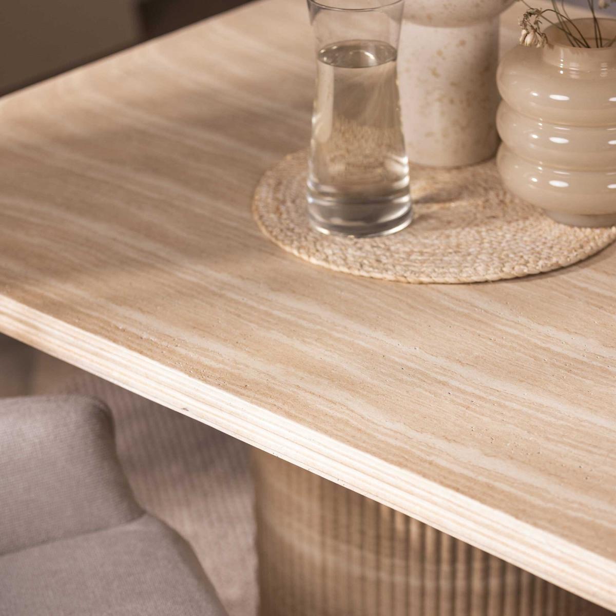 This Zira Beige Rectangular Concrete with Stone Travertine Effect 200cm Dining Table, exudes a refined elegance with its sleek concrete surface, beautifully crafted to mimic the organic charm of stone travertine. The natural, earthy tones flow harmoniously into modern and contemporary settings, offering timeless style and lasting durability. Complemented by delicately textured legs, the table adds a subtle touch of sophistication, balancing aesthetics and strength. Designed to seat 4-6 people comfortably, it becomes the heart of family meals and intimate gatherings. With its effortless maintenance and minimalist design, it radiates warmth and versatility in any dining room