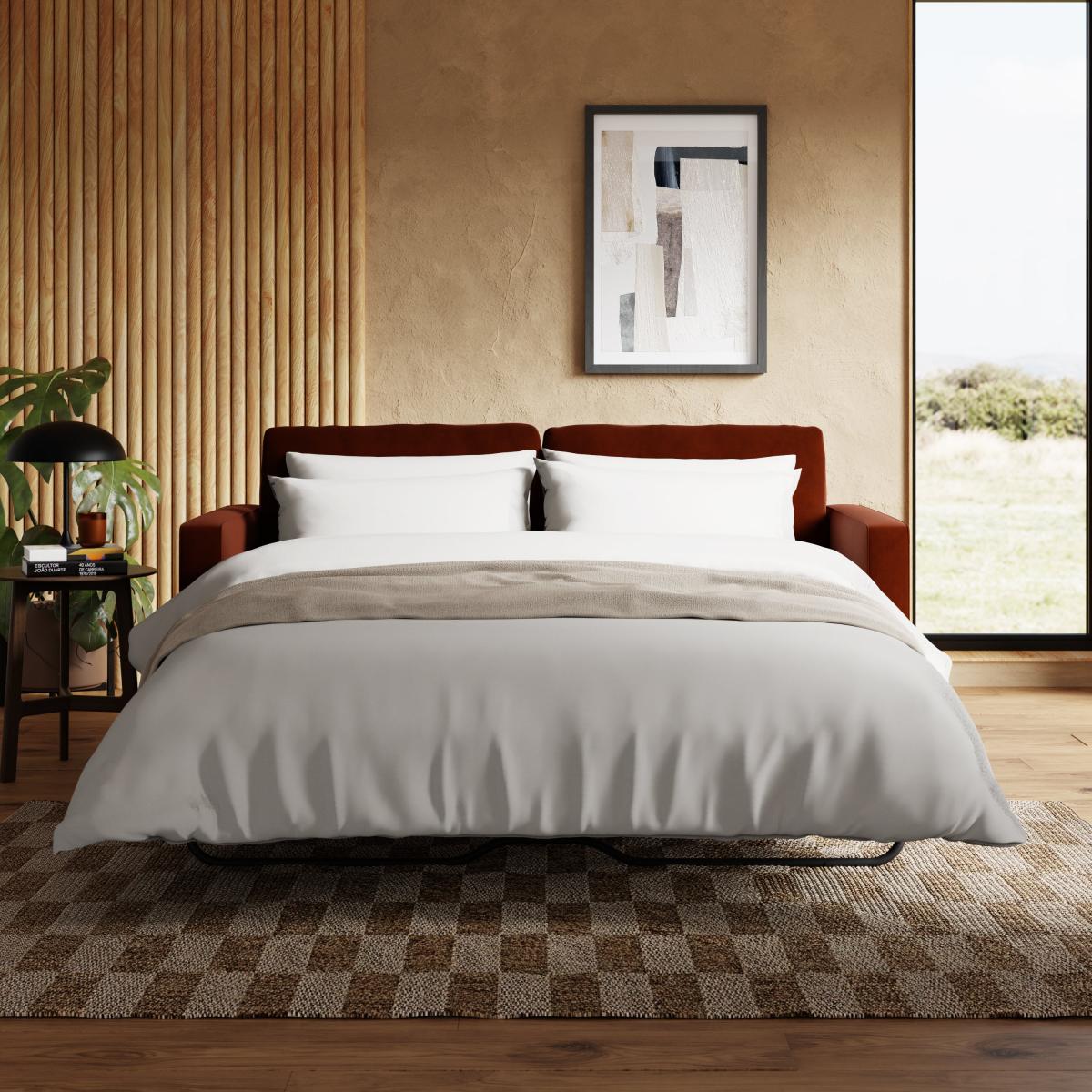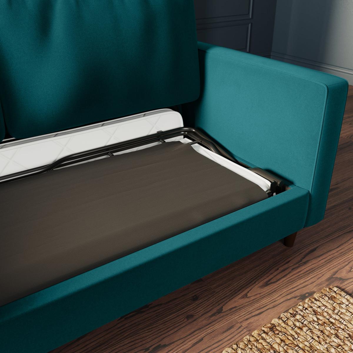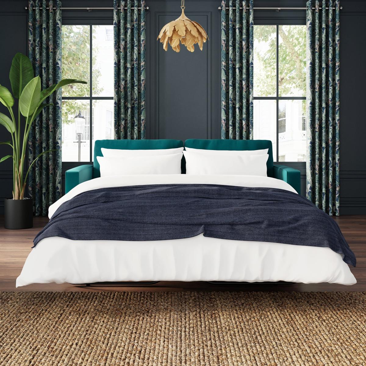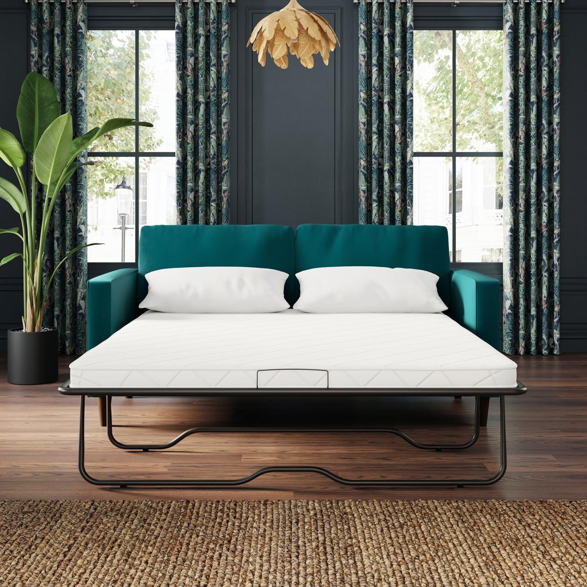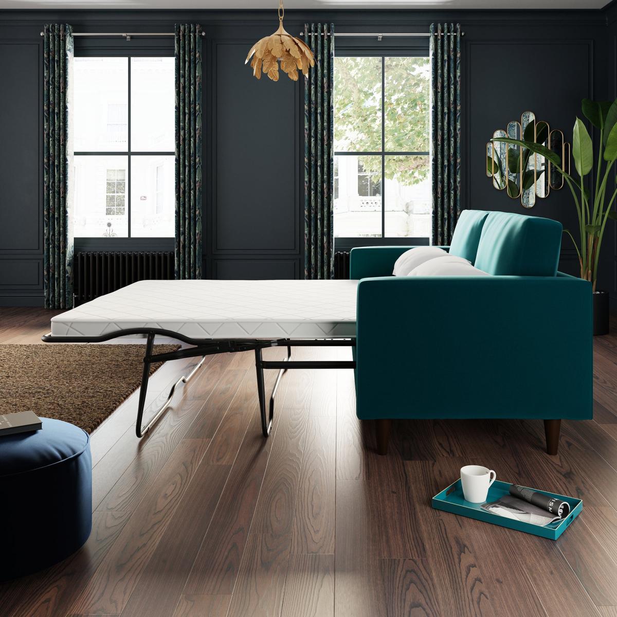 Dunelm Exclusive - Designed and Developed by Dunelm * Soft touch velvet upholstery * Tufted seat cushion with piped detailing * Tapered solid wooden legs * 3 seater sofa * Easily converts into a sofa bed Introduce a stylish, retro-inspired look to your living or spare room with the gorgeous Zoe Velvet 3 Seater Sofa Bed. This sofa features soft and hard-wearing velvet fabric upholstery, styled with a gorgeous tufted seat cushion, piped edge detailing and stylish tapered solid wood legs. As stylish as it is comfortable, the Zoe is the perfect place to sit back and unwind, featuring a foam filled, spring seat, as well as two matching bolster cushions to boot. This sofa easily converts into a comfortable double bed for those impromptu overnight stays. Did you know, we now offer a 10 year frame guarantee on this sofa. Need to throw out your old sofa first? View our information on [furniture recycling and collections](https://www.dunelm.com/info/about/mattress-and-furniture-recycling).