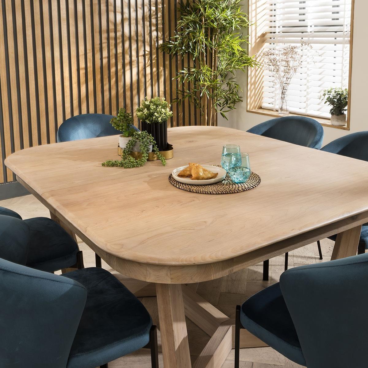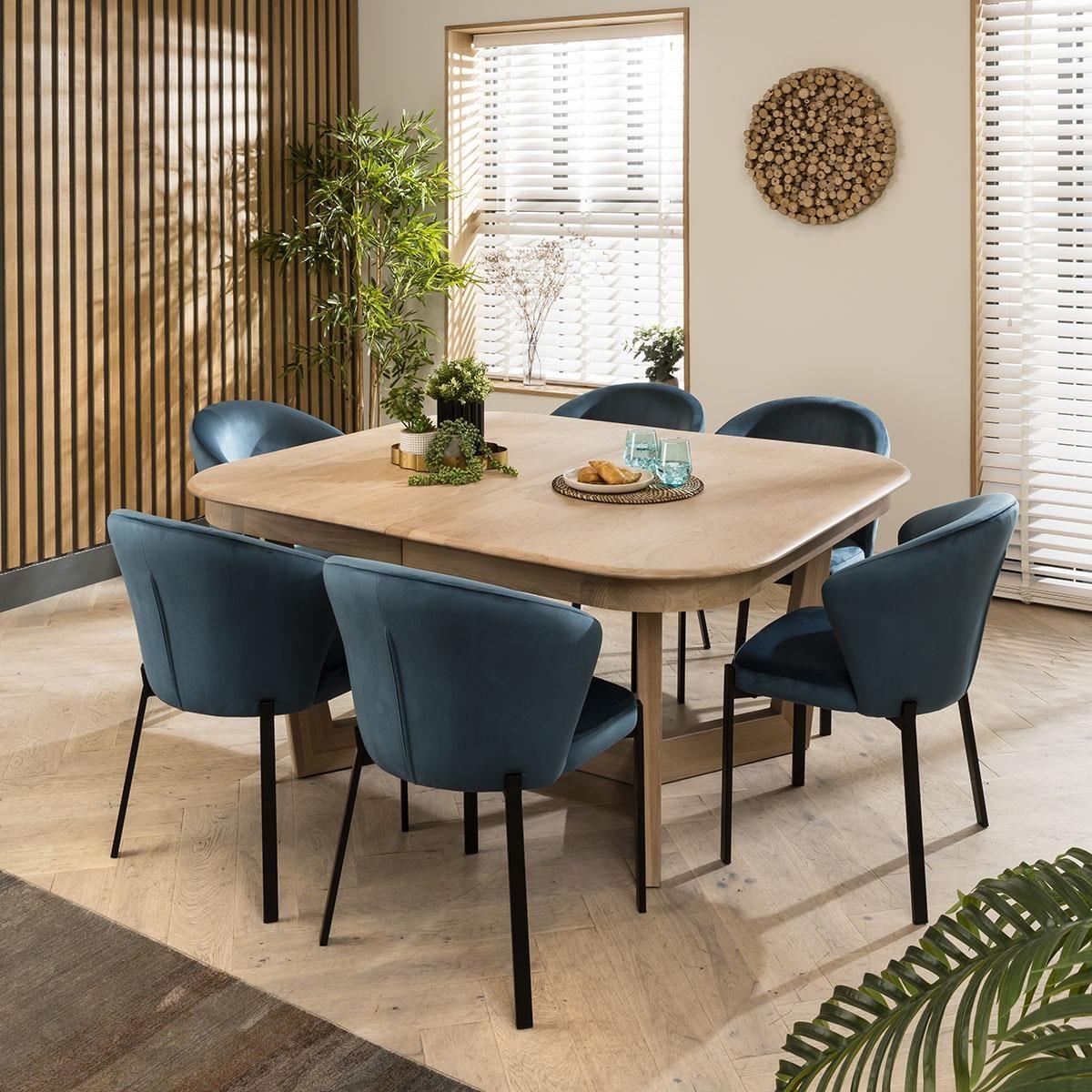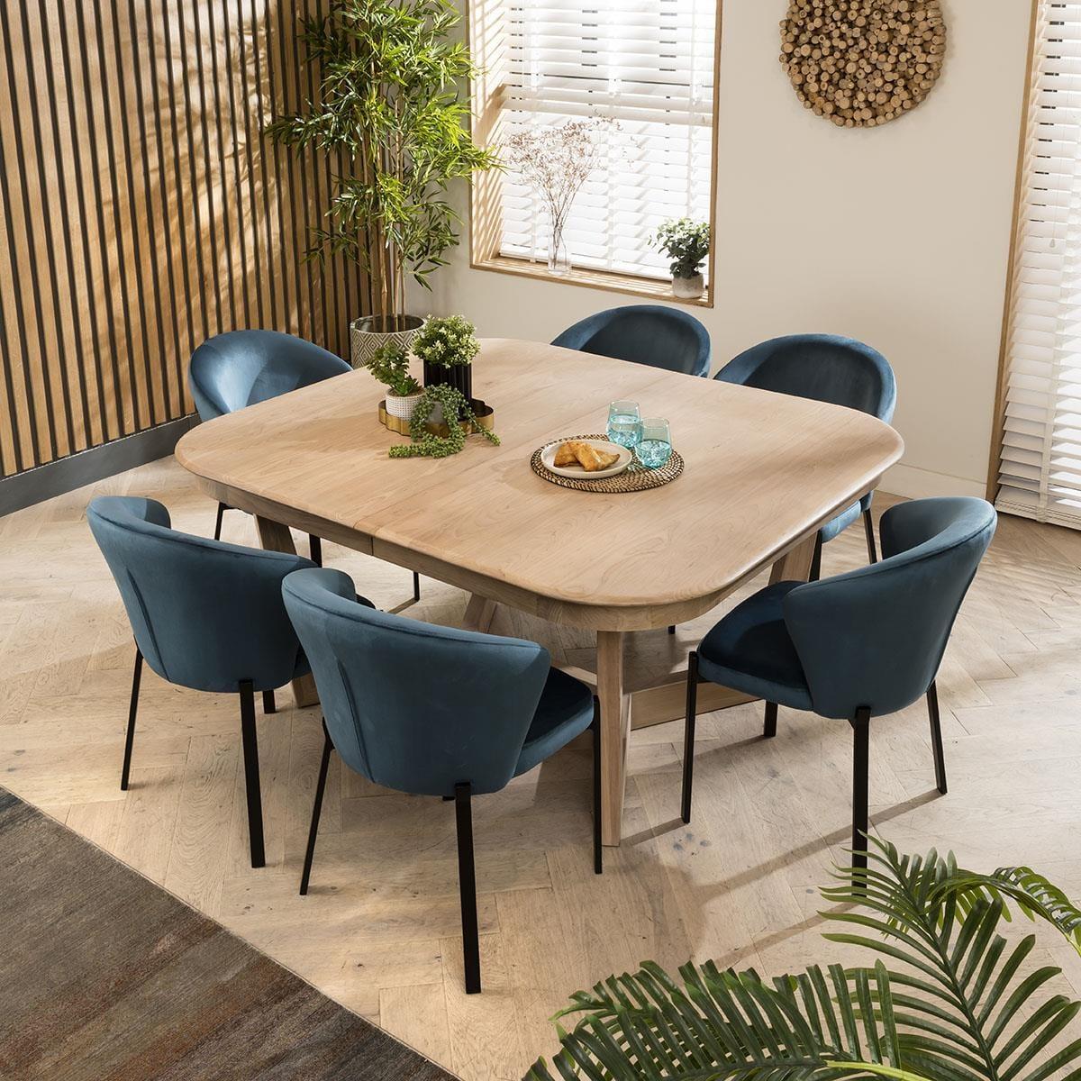 Immerse yourself in the harmonious marriage of modern sophistication and farmhouse-inspired warmth with our Zoe 6 chair dining set. Elevate your dining space with the Scorpio 160-230cm solid wood extendable dining table with a premium natural finish, paired with six luxury Zoe soft-touch blue velvet dining chairs. This dining set for 6 includes the Scorpio Extendable Wooden Dining Table with its blend of modern design and rustic farmhouse charm. Crafted from premium ash wood, this kitchen table boasts a natural finish that showcases its timeless appeal. The 6 seater dining room table includes a drop-in leaf, expanding the length from 160cm to a generous 230cm. For a harmonious blend of elegance and comfort that will elevate your dining experience. Crafted with the utmost attention to detail, the Zoe dining chairs boast luxurious agean blue velvet upholstery with sleek black metal legs. This dining table and set of 6 blue velvet dining chairs have cushioned seats that offer unmatched comfort. This 6 seater dining set combines modern Zoe chairs with the stunning Scorpio table. Whether you love the Zoe chairs and would like to purchase them individually, or you think the Scorpio table would complete your interior scheme better with another chair, you can easily mix and match our modern dining tables and chairs to curate something truly unique. Table Size W160-230cm D140cm H76cm Chair Size W57cm D62cm H83cm Dining Table And Chair Set For 6