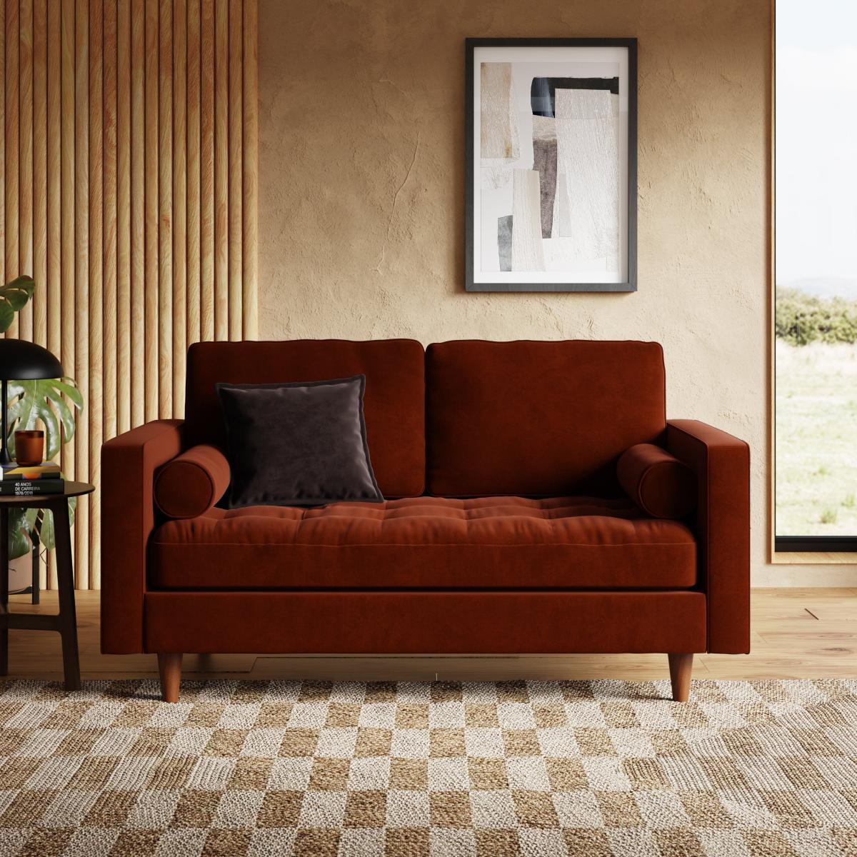 I love this sofa for its luxe velvet finish and versatile silhouette, making it an excellent choice for both contemporary and classic interiors. Its rich, warm tone adds a touch of sophistication, while the two-seater size makes it perfect for smaller spaces or as part of a larger seating arrangement. Style-wise, it works beautifully with neutral accessories for a minimalist look or with patterned cushions and throws for a cosy, layered feel. Practical tips would include pairing it with a soft rug and minimal clutter to let the velvet's texture be the focus; just keep in mind that velvet can be prone to marking, so regular gentle cleaning is recommended to keep it looking its best.