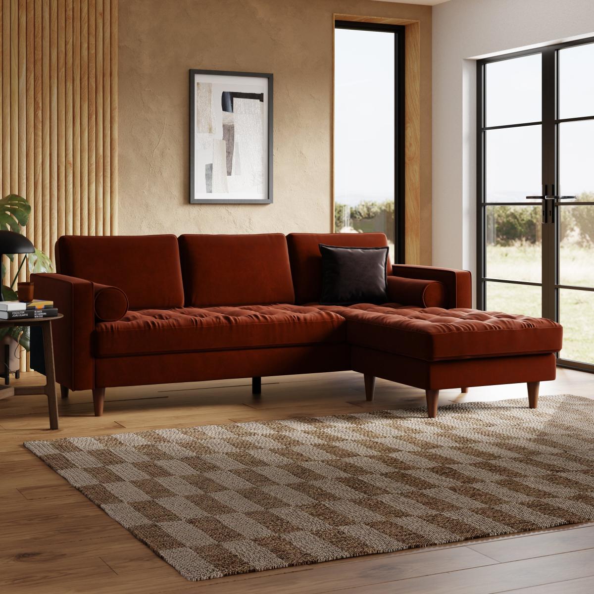 Dunelm Exclusive - Designed and Developed by Dunelm. The Zoe Casual Sit Velvet Corner Chaise Sofa is a luxurious, spacious addition to any living space. Featuring soft velvet upholstery, this piece combines comfort with modern design, offering an ideal spot for lounging or entertaining. The corner design maximises seating capacity, while the chaise provides a perfect place to stretch out and relax.