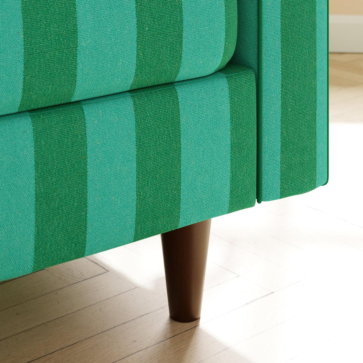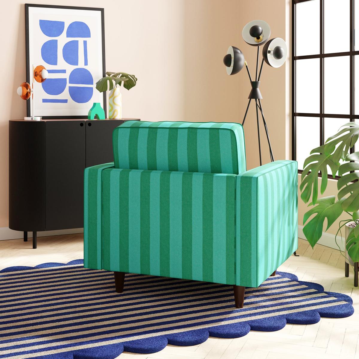 I love this armchair because of its bold woven stripe pattern in vibrant emerald green and teal, which adds a lively touch to any space. It works particularly well in eclectic or contemporary interiors where statement pieces are welcome. Practical styling tips include pairing it with neutral-toned accessories to let the stripes pop, or mixing it with other patterned textiles for an energetic feel. Its sturdy frame and eye-catching fabric make it versatile enough for living rooms, reading nooks, or even a stylish office corner. Just consider balancing the vibrant colour with calmer elements to keep the overall look cohesive and inviting.