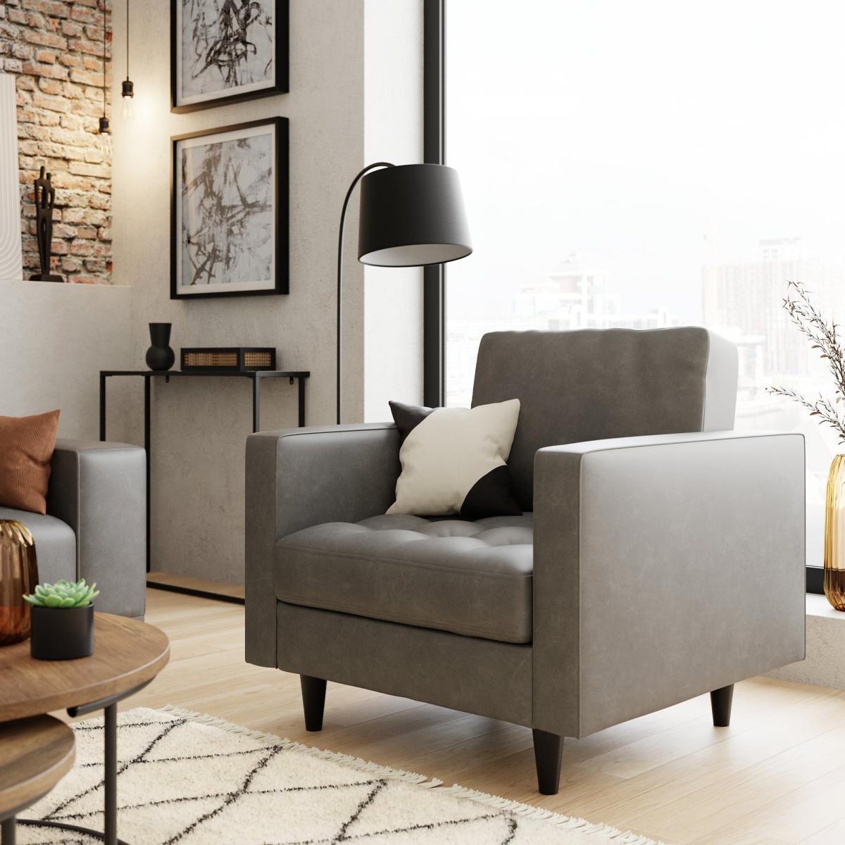 I love this faux leather armchair for its sleek, contemporary look and versatile grey tone, which makes it easy to incorporate into a variety of interiors. It works particularly well in modern or minimalist spaces, adding a touch of understated sophistication. The grey faux leather is practical for everyday use, as it's easy to clean and maintains a smart appearance. To style it effectively, consider pairing it with textured cushions or throws to soften the look and add comfort. It also pairs nicely with different colour palettes, from muted neutrals to bold accents, making it a flexible piece that effortlessly elevates a living room or study.