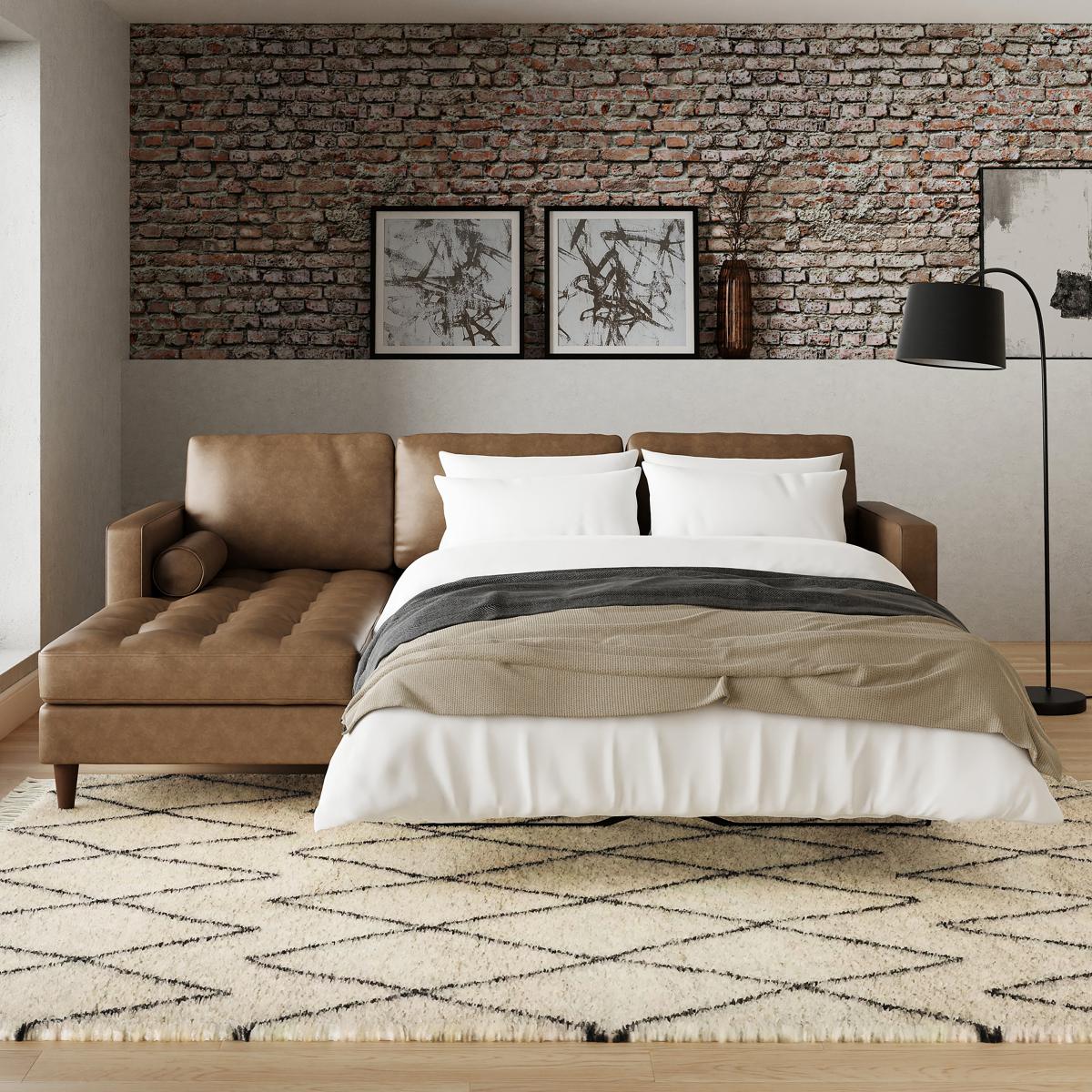 I love this corner sofa bed for its versatility and classic mocha faux leather finish, which adds a warm, sophisticated touch to many interiors. It works particularly well in contemporary or industrial spaces, especially those with exposed brick or neutral colour schemes. For styling, consider contrasting cushions or throws in textures like linen or wool to soften the look and create visual interest. Since it is a corner piece, it’s perfect for maximising seating in open-plan living areas or family rooms, and its bed functionality makes it a practical choice for small spaces or guest rooms. Keep accessories minimal and let the mocha tone add warmth, or pair it with metallic or wooden accents for a more curated look.