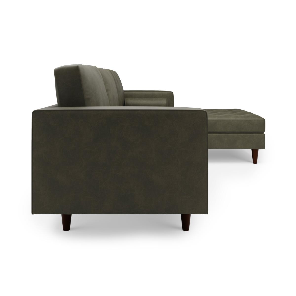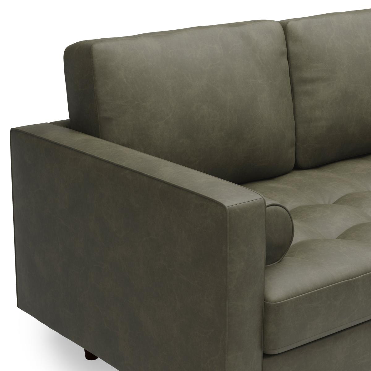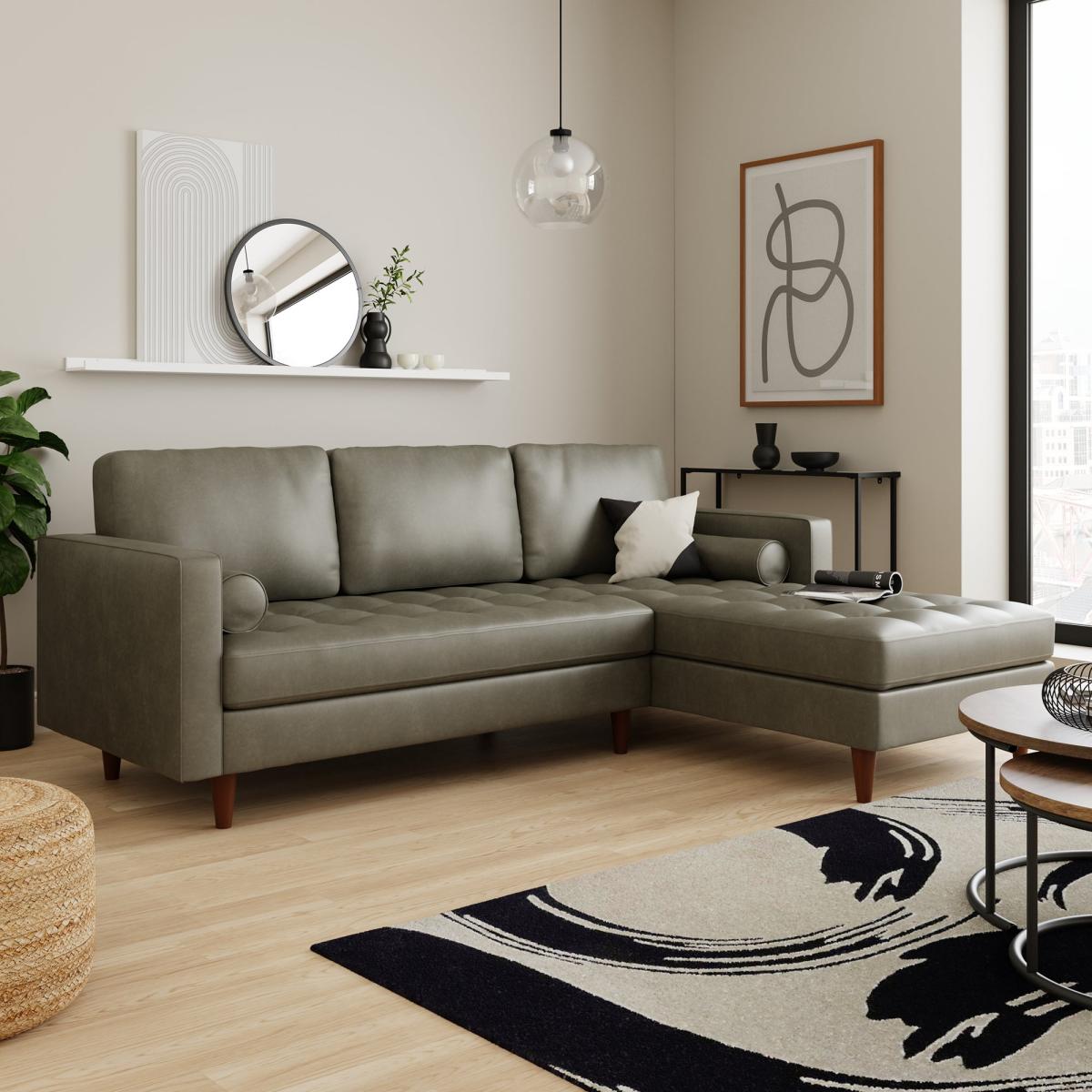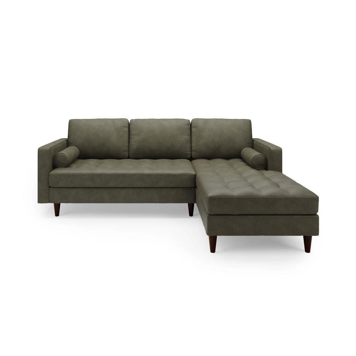 Bring some modern retro styling to your living room with the stylish Zoe Right Hand Corner Sofa. Finished in a trendy colourway, this sofa features durable and easy to care for PU leather upholstery, styled with a gorgeous tufted seat cushion, piped edge detailing and stylish tapered solid wood legs. As stylish as it is comfortable, the Zoe corner sofa is the perfect place to sit back and put your feet up, featuring a foam filled, sprung seat and fibre filled back cushions, as well as two matching bolster cushions to boot. This corner sofa has non-reversible back cushions and fixed seat cushions. Did you know, we now offer a 10 year frame guarantee on this sofa. To find out more, please. To check out our handy sizing guide to help you find out if you’ll be able to get your new furniture into your home. Need to throw out your old sofa first? View our information on. Furniture recycling and collections.