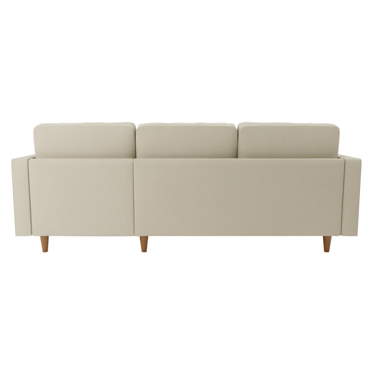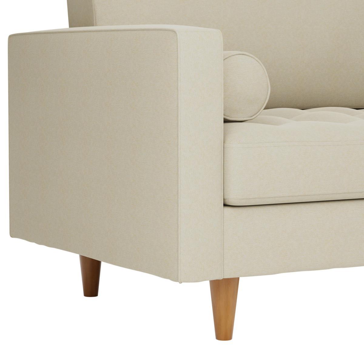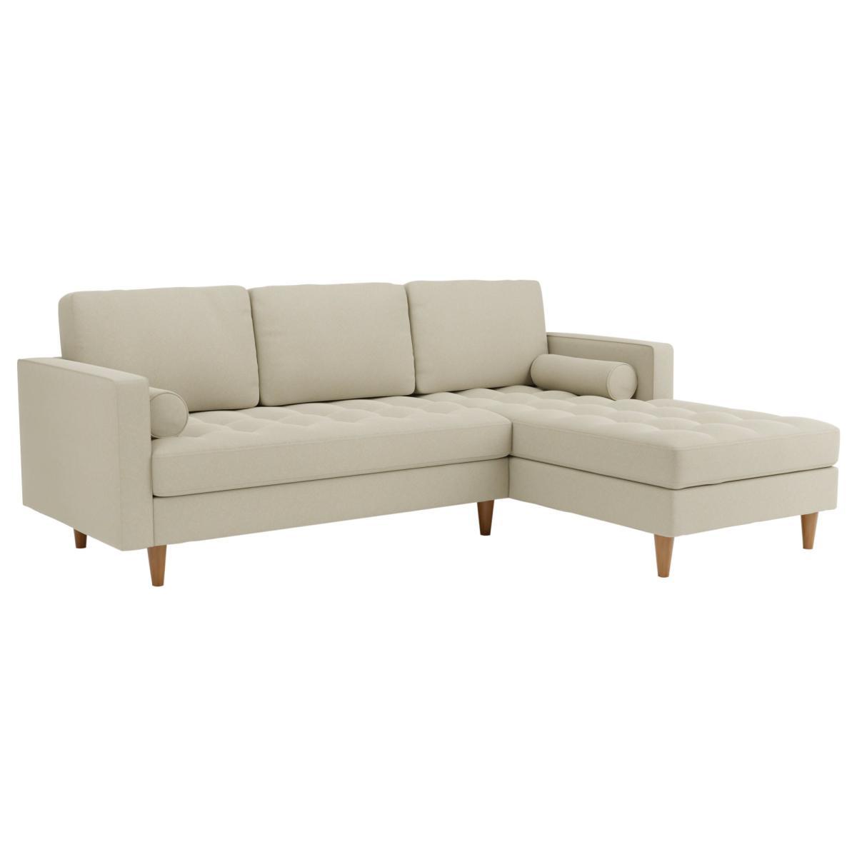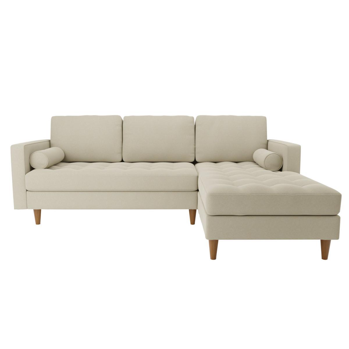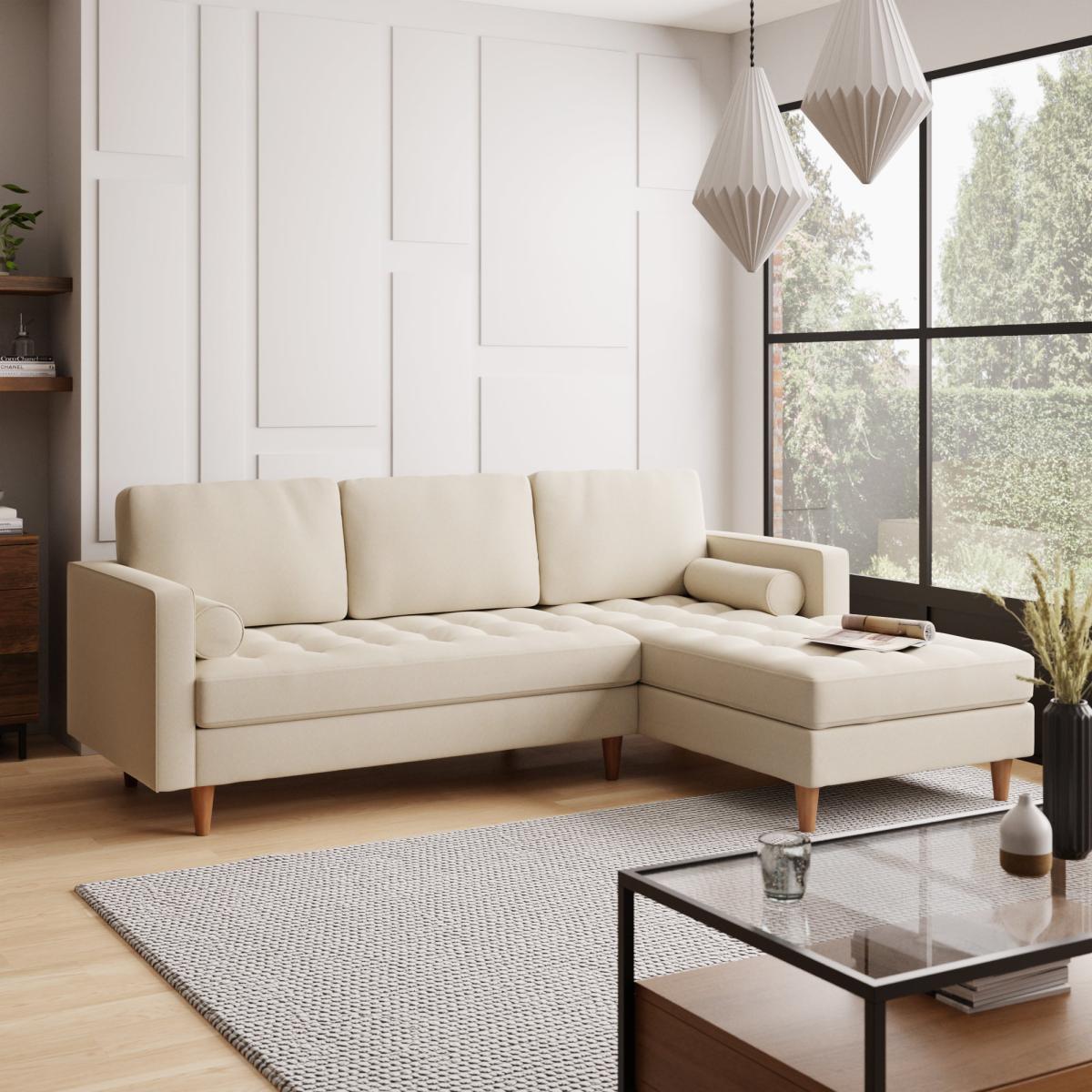 Bring some modern retro styling to your living room with the stylish Zoe Right Hand Corner Sofa. Available in a choice of colourways, this sofa features soft and durable flatweave fabric upholstery, styled with a gorgeous tufted seat cushion, piped edge detailing and stylish tapered solid wood legs. As stylish as it is comfortable, the Zoe corner sofa is the perfect place to sit back and put your feet up, featuring a foam filled, sprung seat and fibre filled back cushions, as well as two matching bolster cushions to boot. This corner sofa has non-reversible back cushions and fixed seat cushions. Did you know, we now offer a 10 year frame guarantee on this sofa. To find out more, please. To check out our handy sizing guide to help you find out if you’ll be able to get your new furniture into your home.
