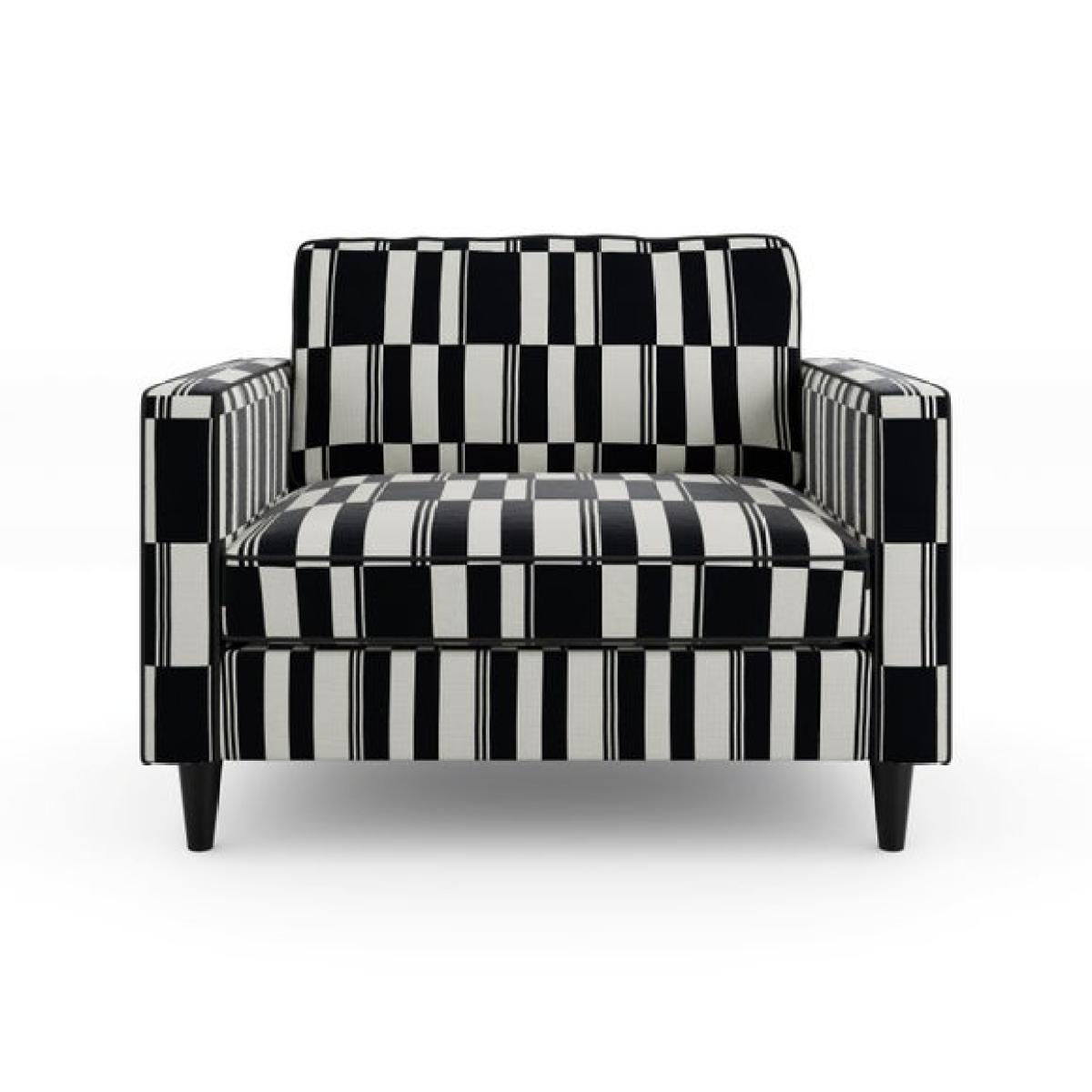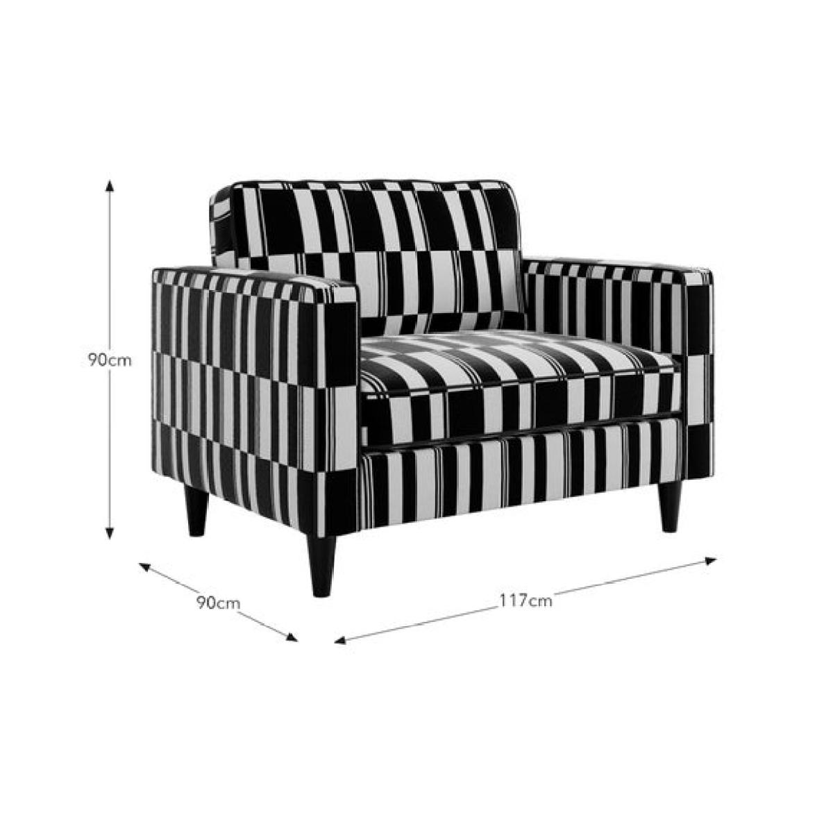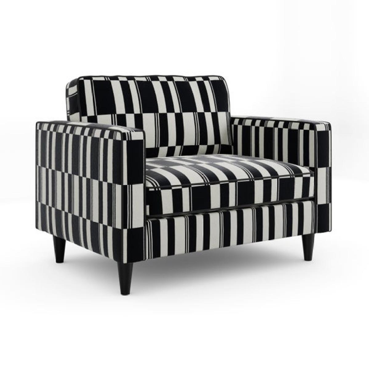 * Sleek, modern chair * Rubberwood legs * Foam and Fibre filled seat Bold and graphic, this snuggle chair features a striking stripe design that adds instant personality to your space. Its clean lines and compact shape make it a playful yet practical addition, perfect for adding contrast and character to a neutral scheme or complementing a more eclectic interior.