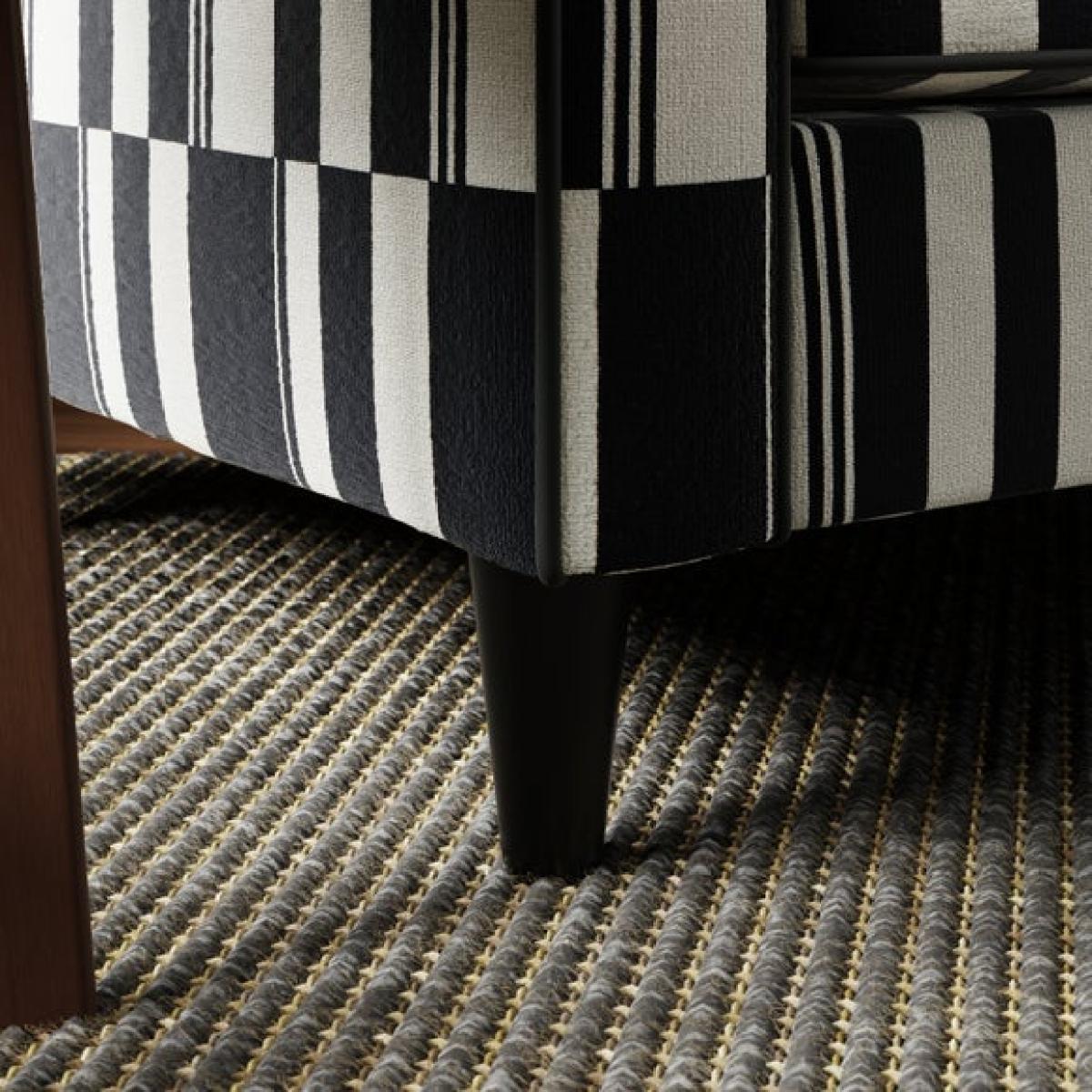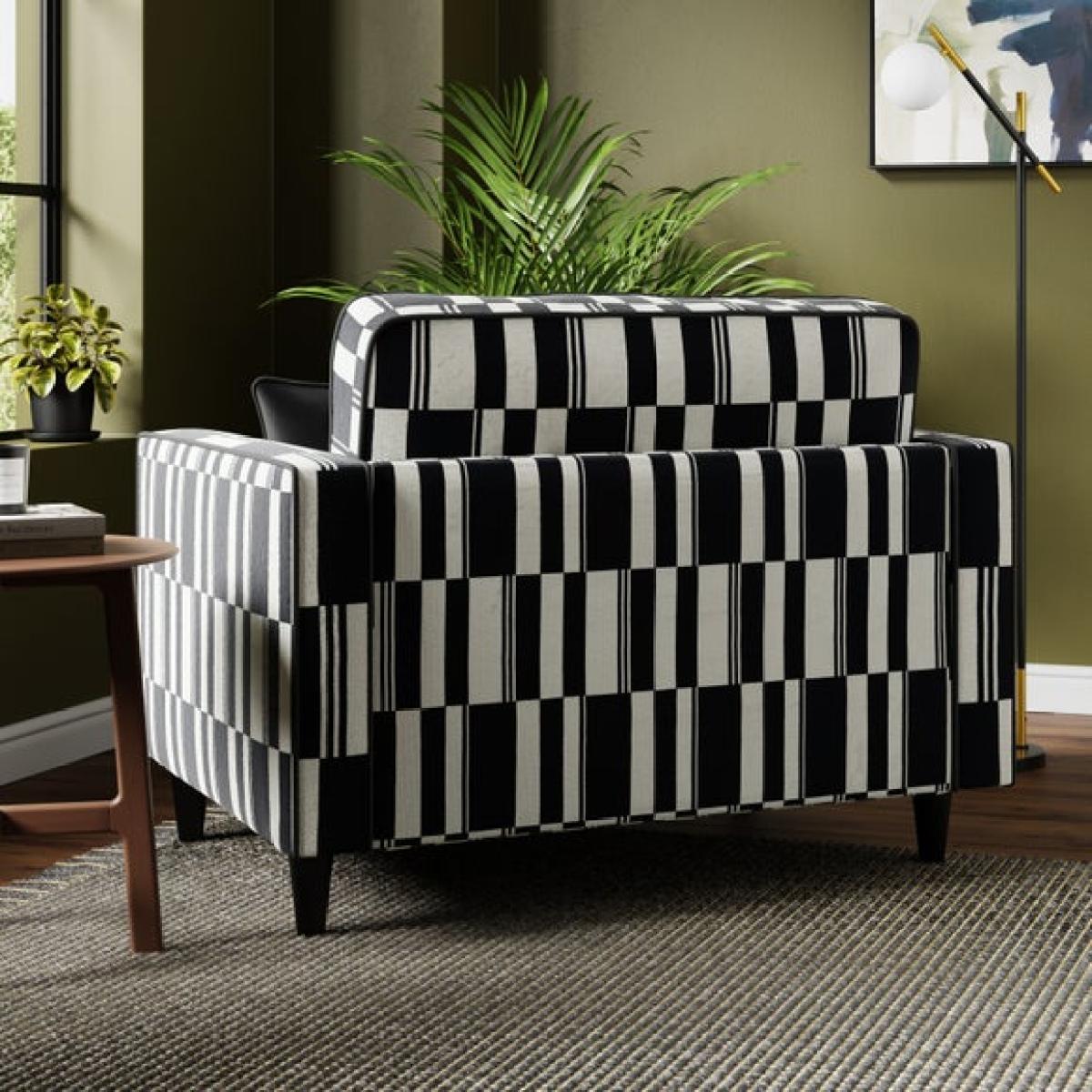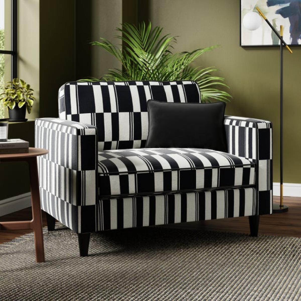 * Sleek, modern chair * Rubberwood legs * Foam and Fibre filled seat Bold and graphic, this snuggle chair features a striking stripe design that adds instant personality to your space. Its clean lines and compact shape make it a playful yet practical addition, perfect for adding contrast and character to a neutral scheme or complementing a more eclectic interior.