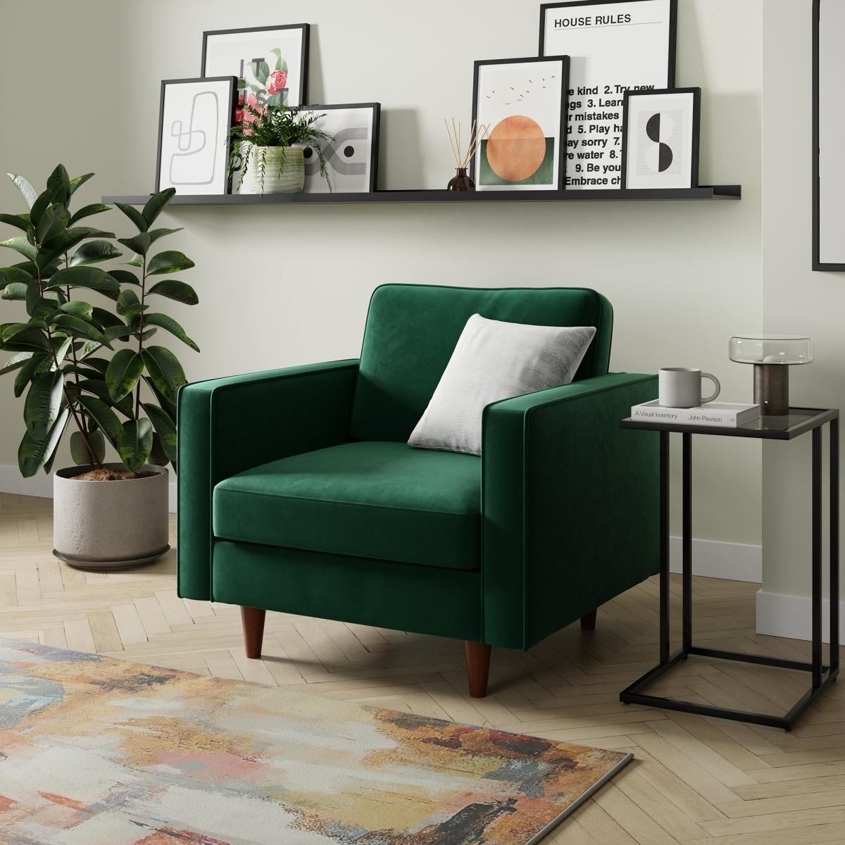 I often reach for this velvet armchair when I want a shot of rich colour without fuss. Its clean lines and plush finish make it equally at home in a contemporary living room or as an accent in a more traditional scheme. To style it, layer in a contrasting cushion - think a soft boucle in ivory or a geometric print - and pair with a slim-legged side table in brass or matt black for balance. The deeper seat also works beautifully with a cosy throw at one arm, so it’s both eye-catching and inviting.
