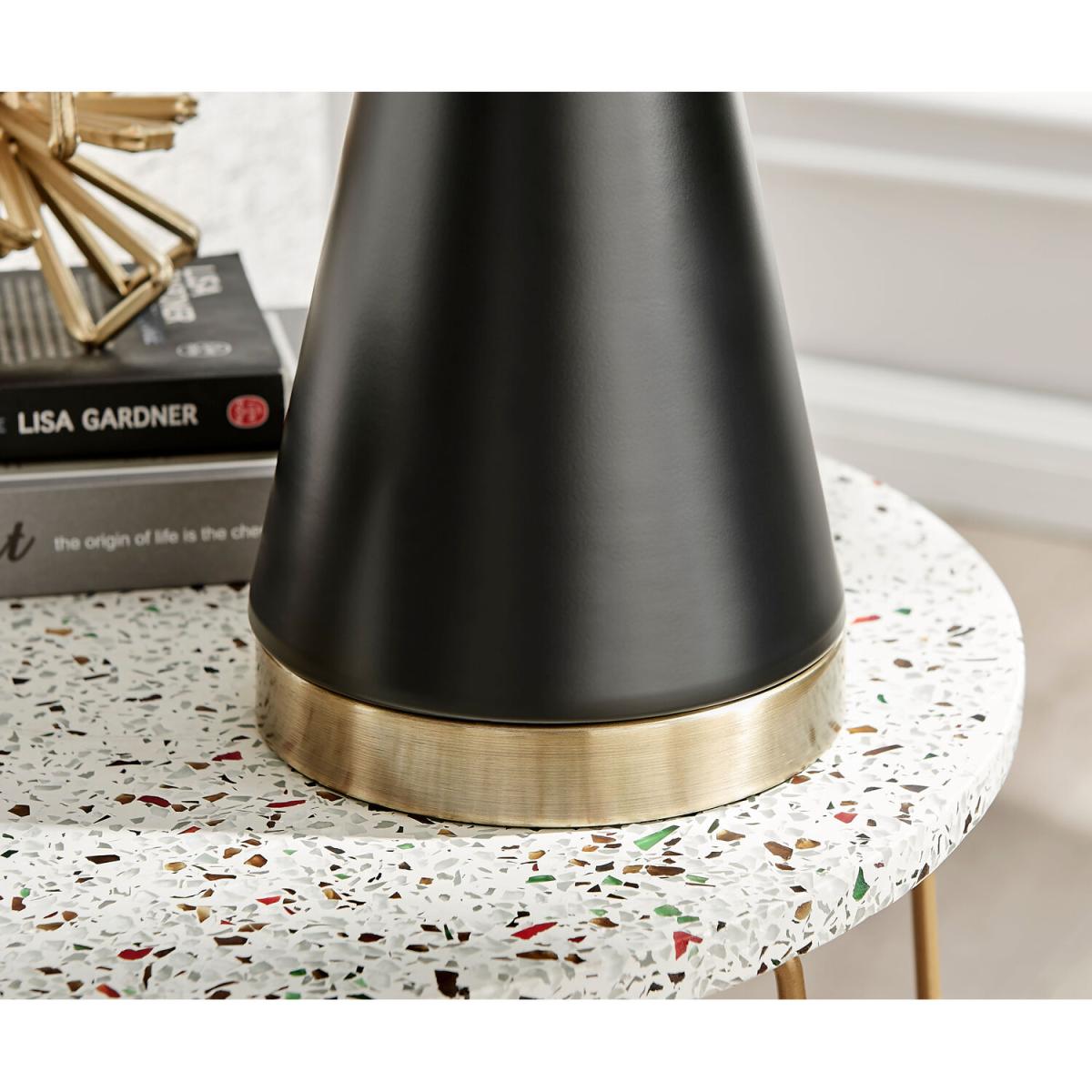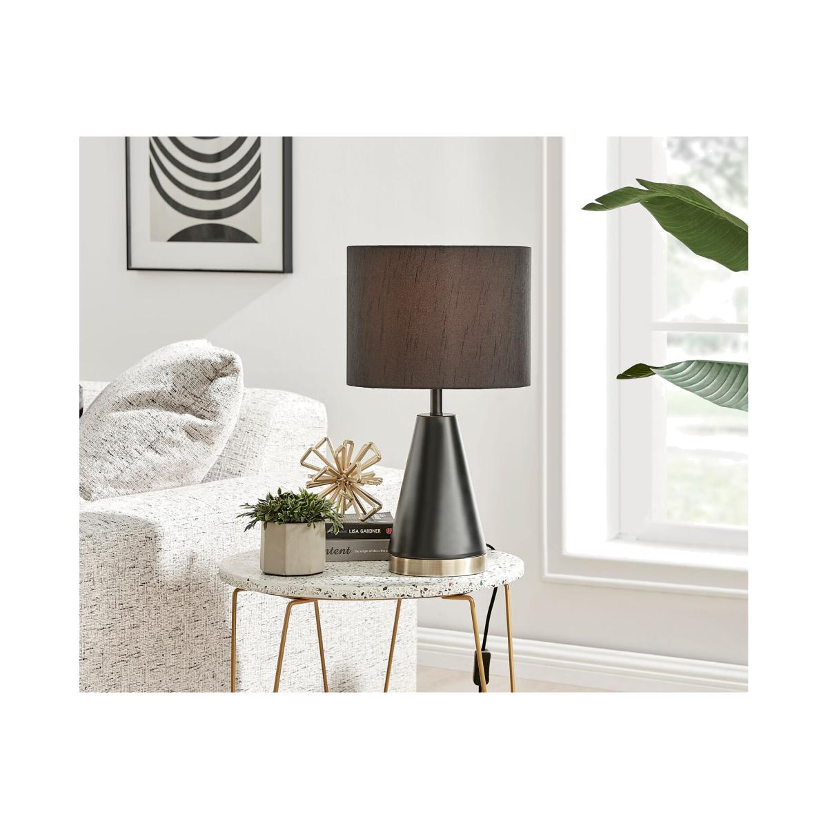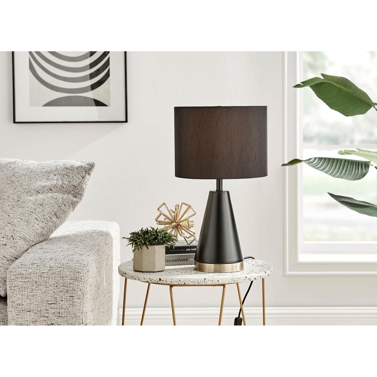 Our Zoe table lamp is elegant, simple and sophisticated. Featuring a tapered stand in black satin-matte metal with gold accent to the base and a luxurious black fabric lampshade. The tapered shape also has nods to 1920s Deco and Scandi design influences. We love it! Perfect for any desk, table or console. Stands 51.5cm tall, with black corded cable and rocker switch. Requires one 60W E27 bulb, which is included. We offer the Zoe desk lamp in black and gold, white and gold or grey and silver colour combinations, so be sure to check out the full range.