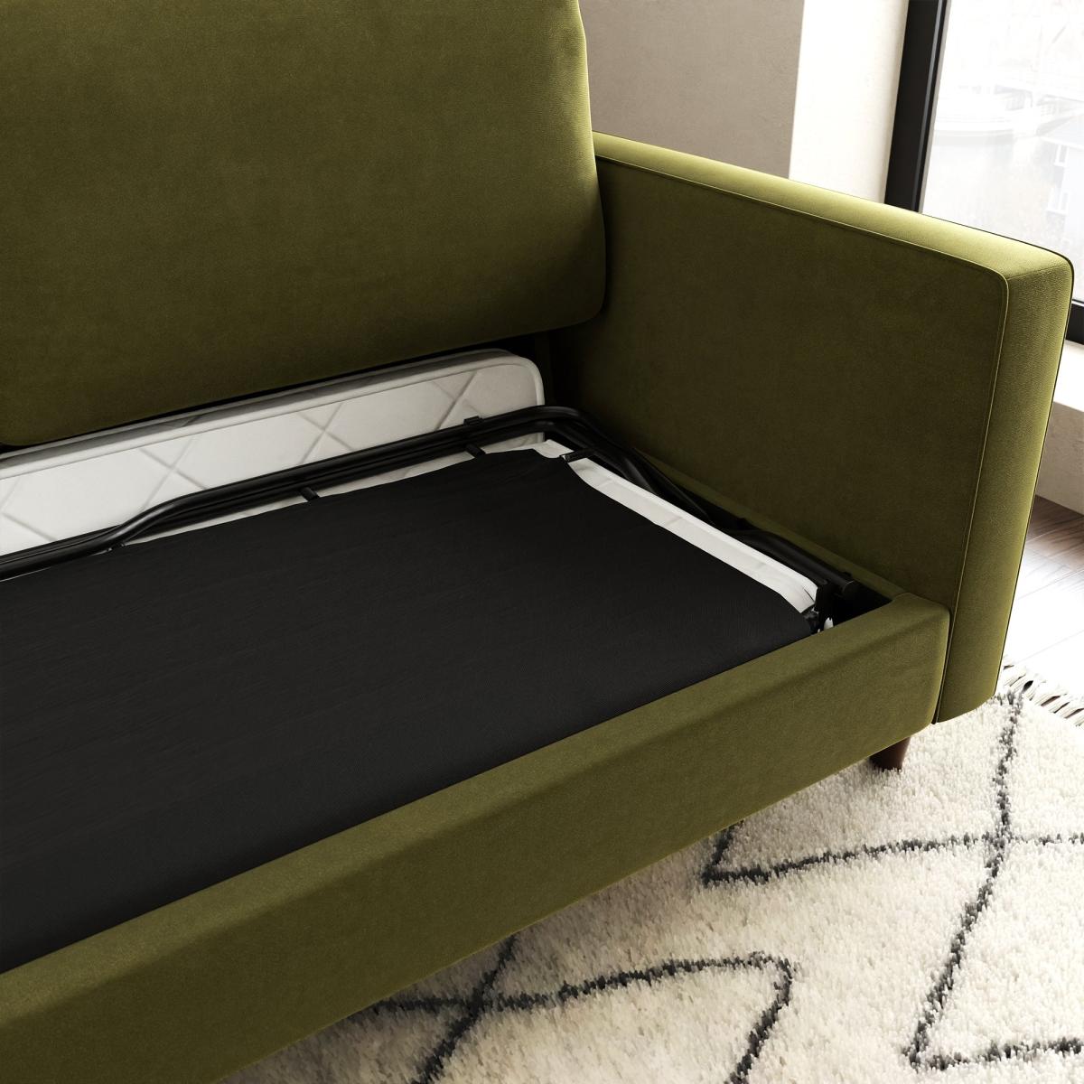 Introduce a stylish, retro-inspired look to your living or spare room with the gorgeous Zoe Velvet 3 Seater Sofa Bed. This sofa features soft and hard-wearing velvet fabric upholstery, styled with a gorgeous tufted seat cushion, piped edge detailing and stylish tapered solid wood legs. As stylish as it is comfortable, the Zoe is the perfect place to sit back and unwind, featuring a foam filled, spring seat, as well as two matching bolster cushions to boot. This sofa easily converts into a comfortable double bed for those impromptu overnight stays. Did you know, we now offer a 10 year frame guarantee on this sofa. To find out more, please. To check out our handy sizing guide to help you find out if you’ll be able to get your new furniture into your home. Need to throw out your old sofa first? View our information on. Furniture recycling and collections.
