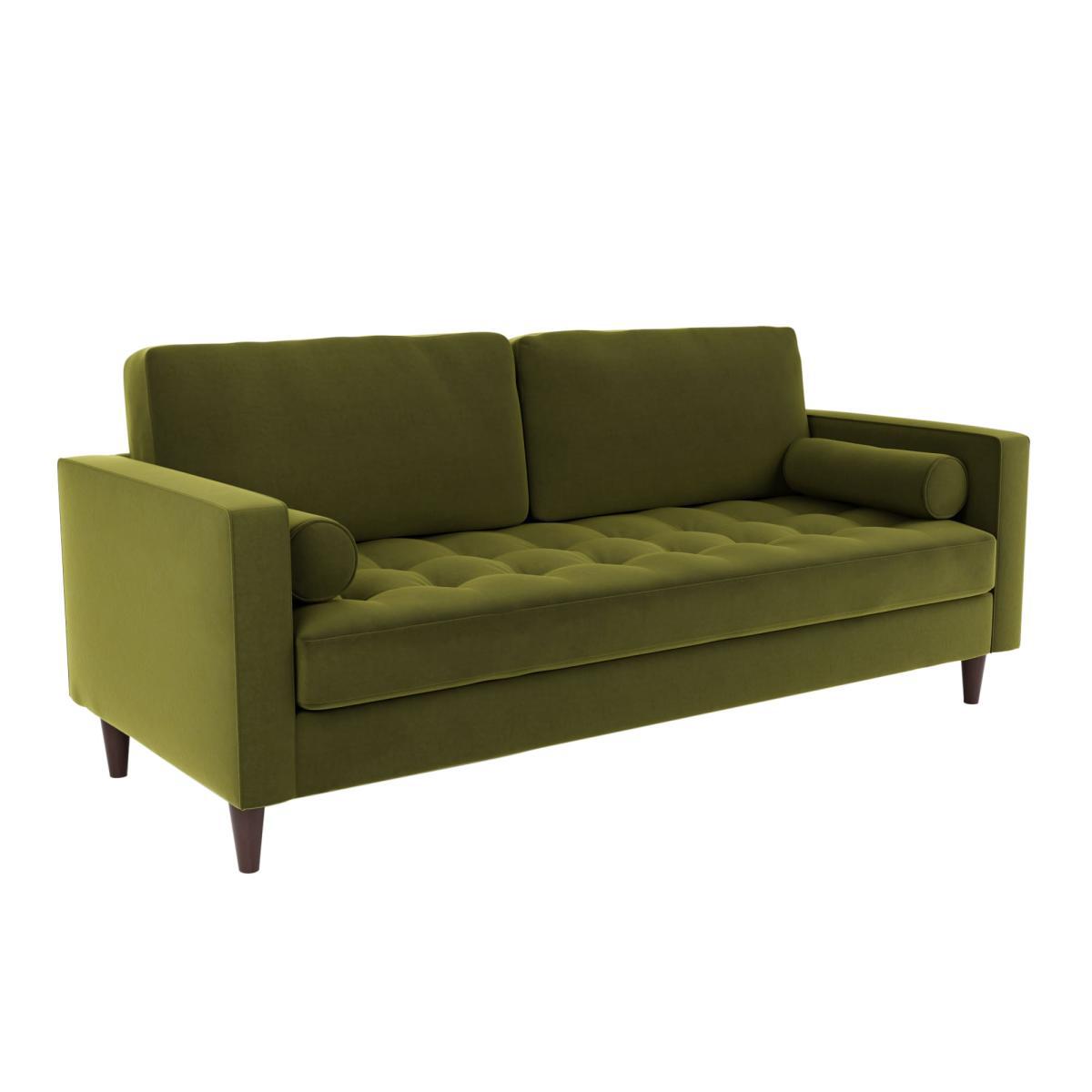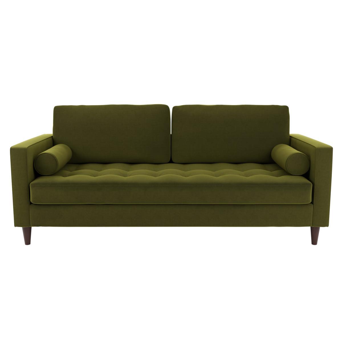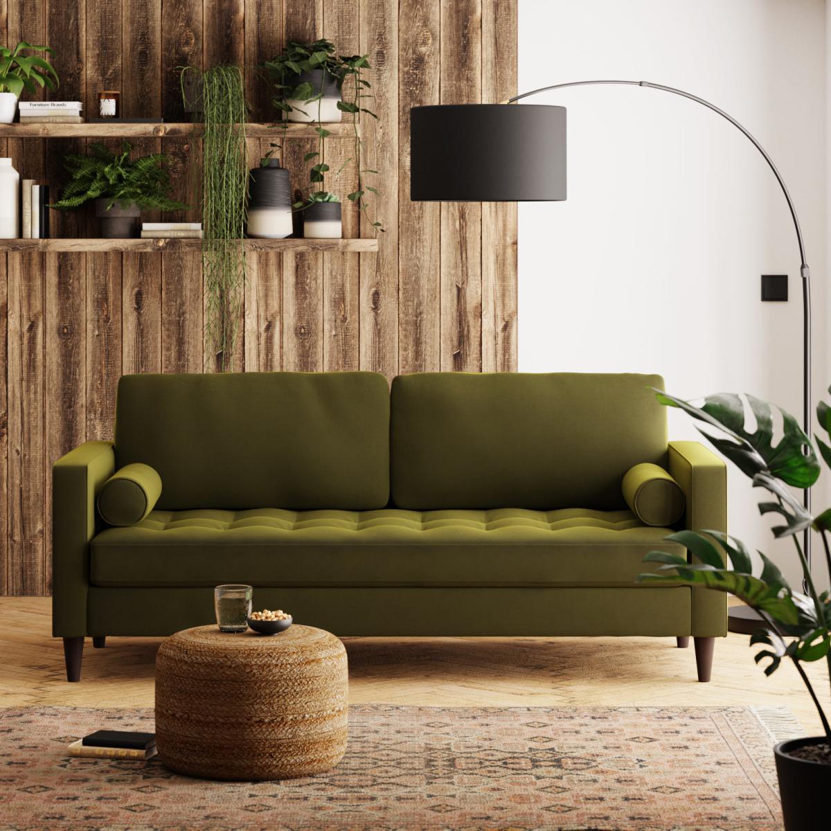 Bring some modern retro styling to your living room with the stylish Zoe 3 Seater Sofa. Available in a choice of bright and trendy colours, this sofa features soft touch velvet upholstery, styled with a gorgeous tufted seat cushion, piped edge detailing and stylish tapered solid wood legs. As stylish as it is comfortable, the Zoe is the perfect place to sit back and unwind, featuring a foam filled, sprung seat and fibre filled back cushions, as well as two matching bolster cushions to boot. Made with recycled materials. This sofa has non-reversible back cushions and a fixed seat cushion. Did you know, we now offer a 10 year frame guarantee on this sofa. To find out more, please. To check out our handy sizing guide to help you find out if you’ll be able to get your new furniture into your home.