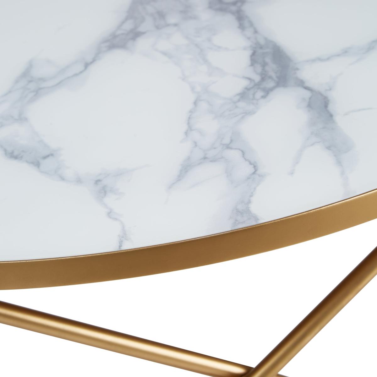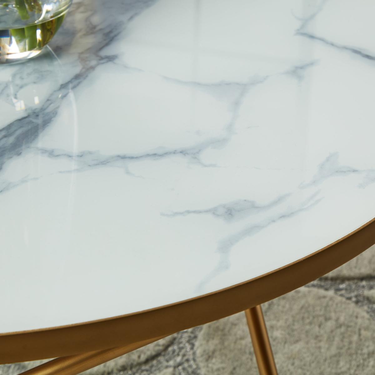 I’m a fan of this marble-effect coffee table for its clean lines and light, airy feel - it instantly lifts a room without dominating it. The slim gold-tone base brings just the right amount of warmth, making it a versatile piece for contemporary, Scandi-inspired or lightly glamorous interiors. To style it, keep the surface clutter-free: I’d group a low vase of fresh foliage with one or two coffee-table books and perhaps a small sculptural object. On darker rugs or wooden floors it creates a lovely contrast, while on paler carpets it helps define your seating area. Regularly wipe the top with a soft, damp cloth to maintain that polished, marble-like finish.