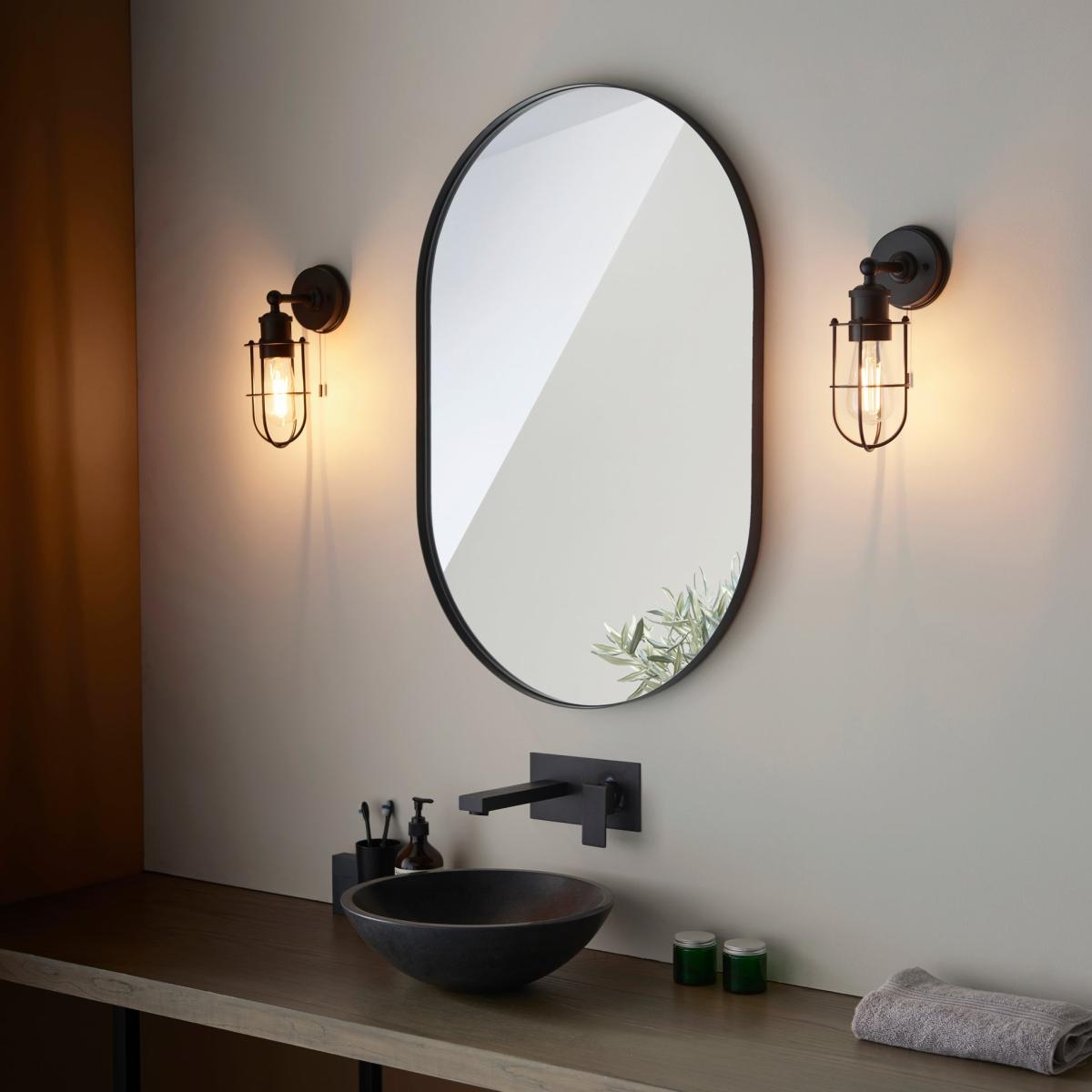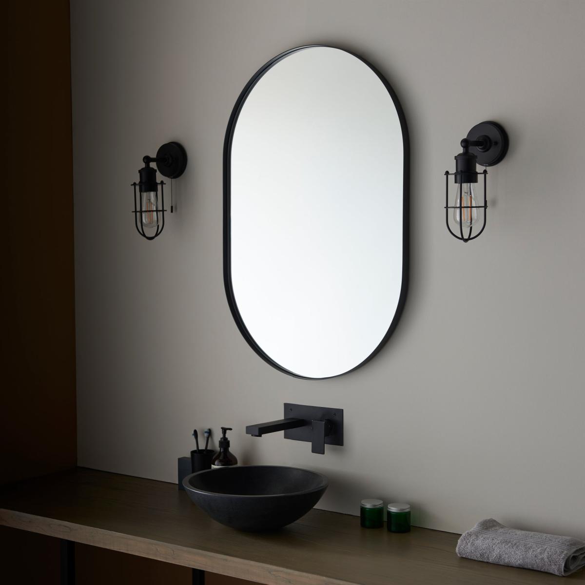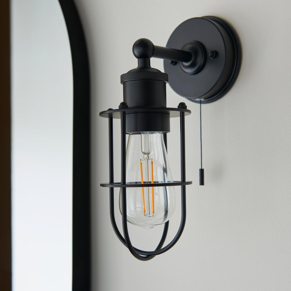 This matte black steel wall light has an industrial design that adds a modern touch to your decoration. Fit it either side of your bathroom mirror for a sleek styling.  It also comes in antique brass for a vintage look.    This matte black steel wall light has an industrial design that adds a modern touch to your decoration. Fit it either side of your bathroom mirror for a sleek styling.  It also comes in antique brass for a vintage look.