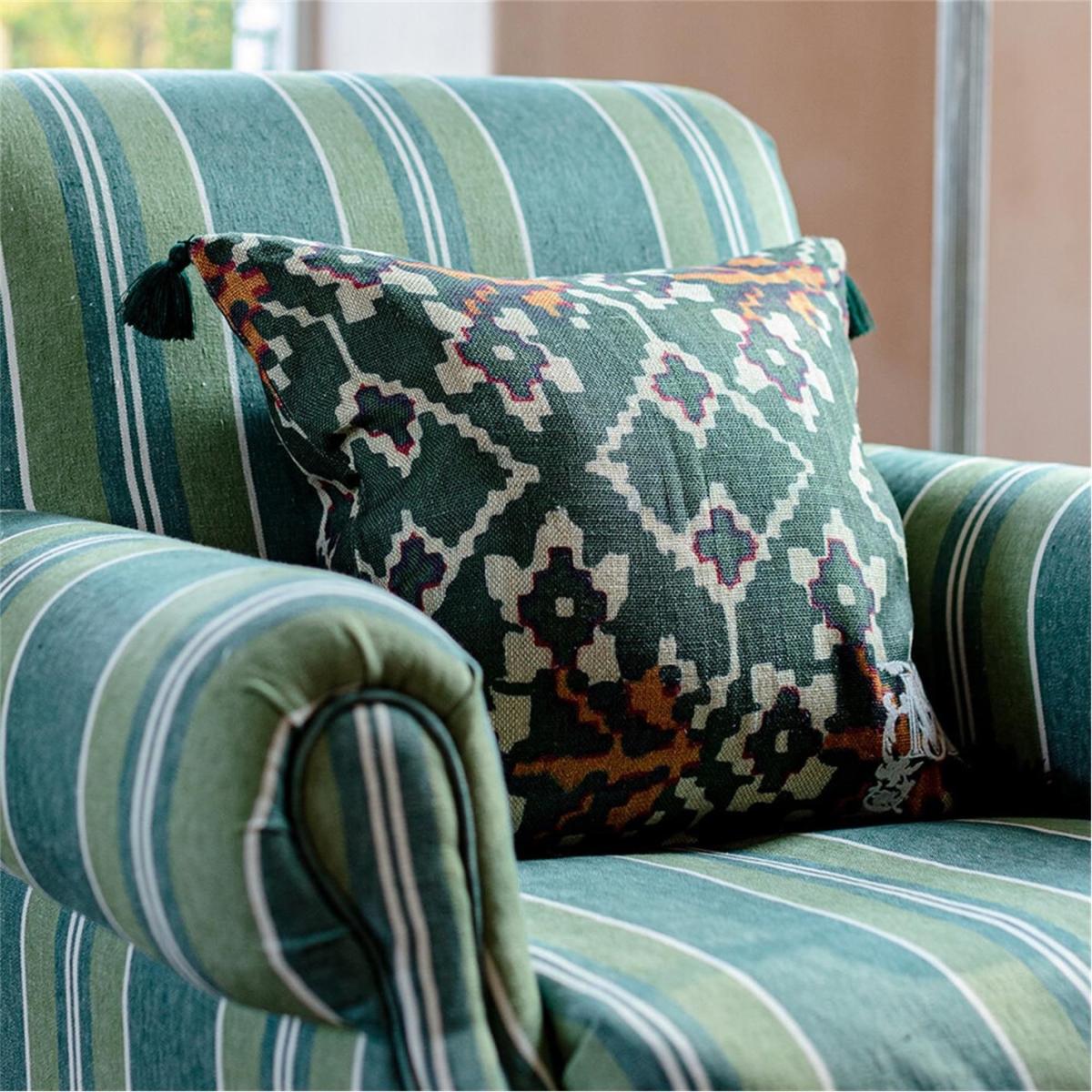 Pop some pattern into your home with this Zold cushion from MINDTHEGAP. Made from 100% linen and filled with a duck feather pad, it’s been printed with a floral-inspired geometric pattern and finished with tasselled corners. Pair with more accessories from MINDTHEGAP to complete the look.